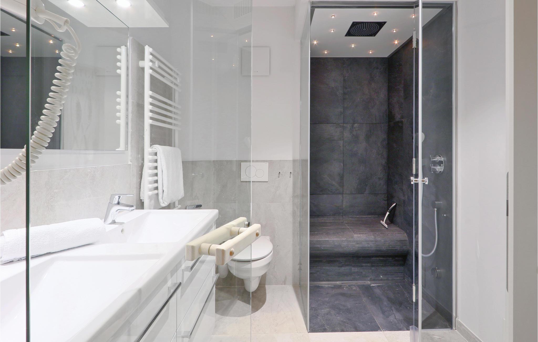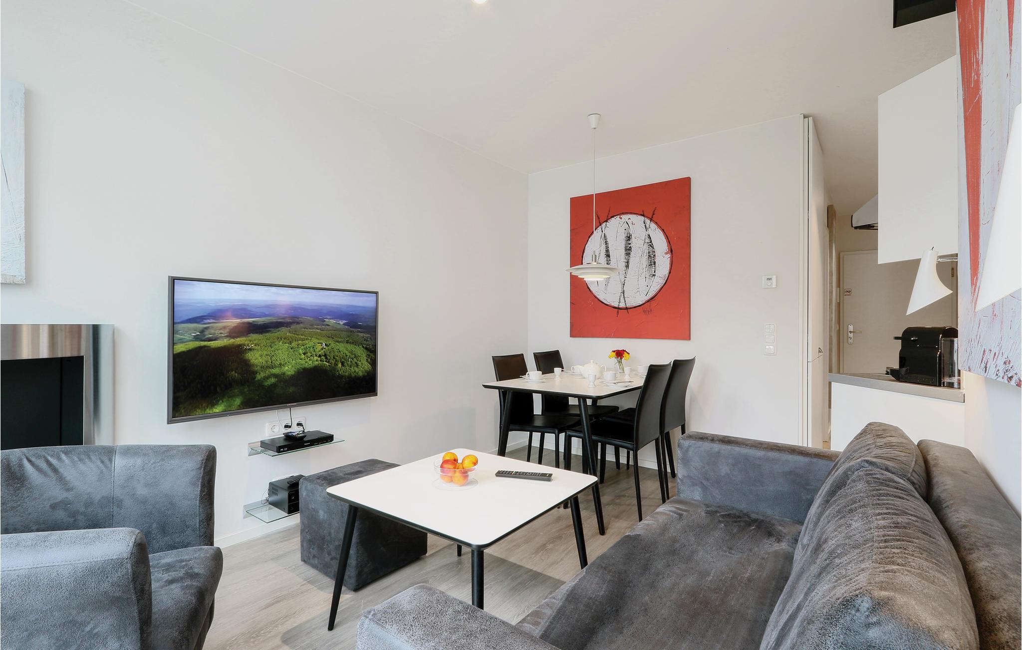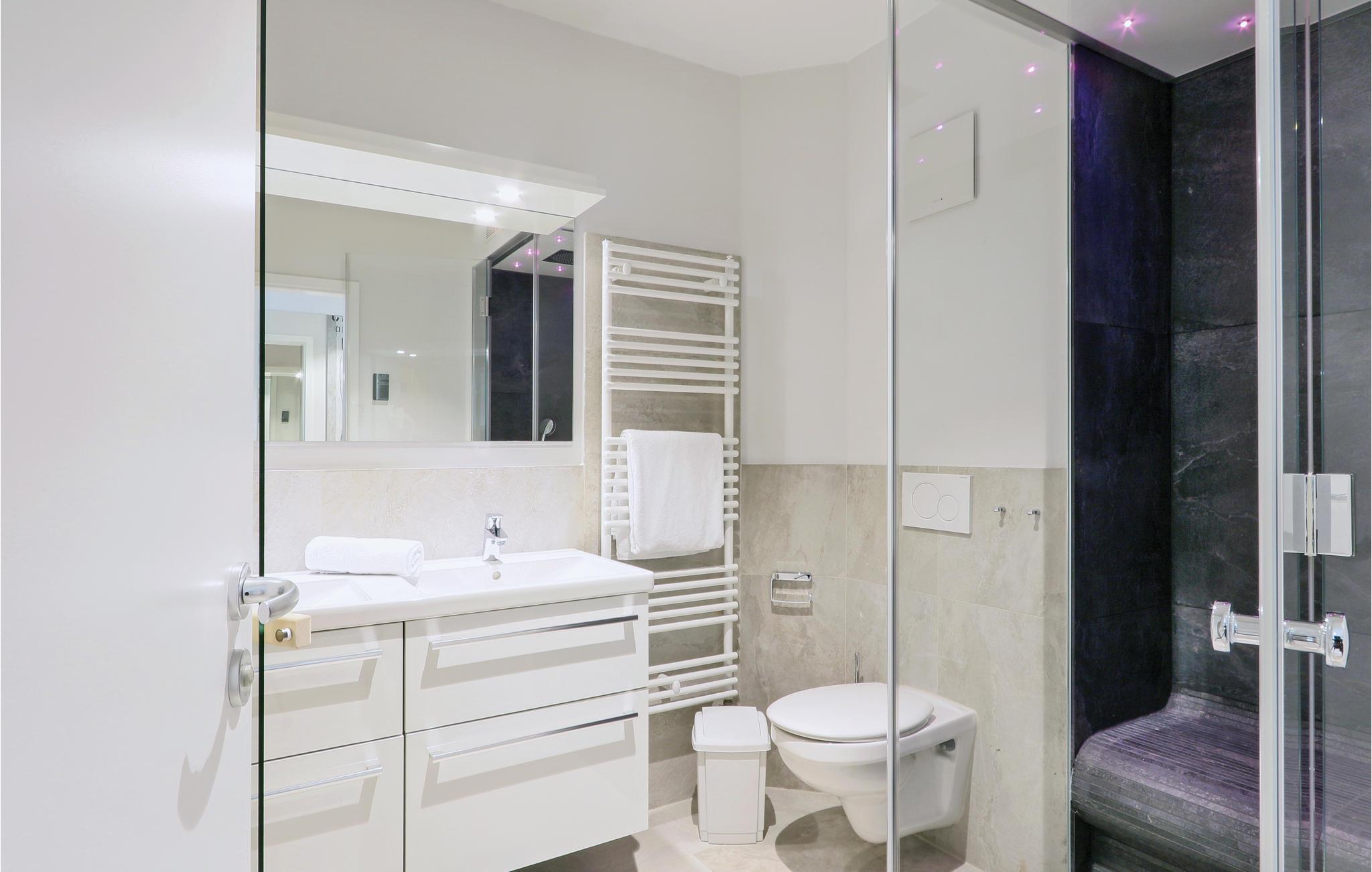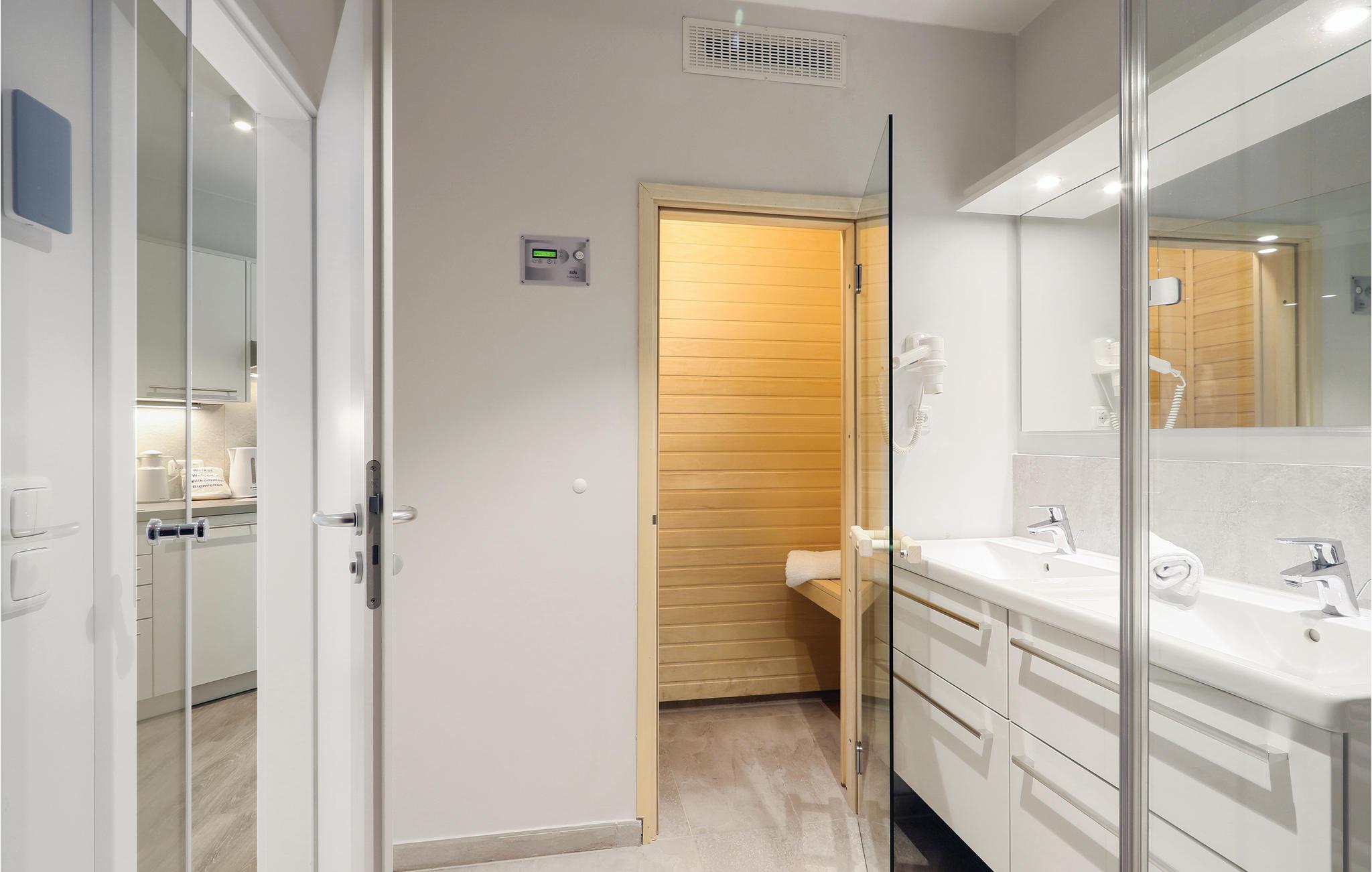 Das Badezimmer präsentiert sich als Ihr privater Wellness-Bereich. Hier können Sie es sich in der Infrarotsauna gemütlich machen oder im Dampfbad mit Regendusche entspannen. Die Ferienwohnung verfügt außerdem über ein modernes Entertainmentsystem mit Blu-Ray-Player, zwei Flatscreen-TV und einer Musikanlage mit MP3-Anschluss.