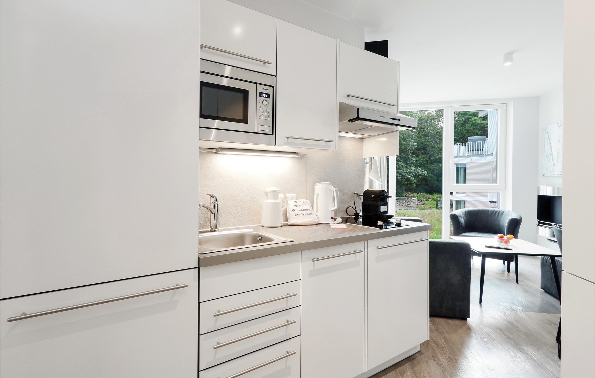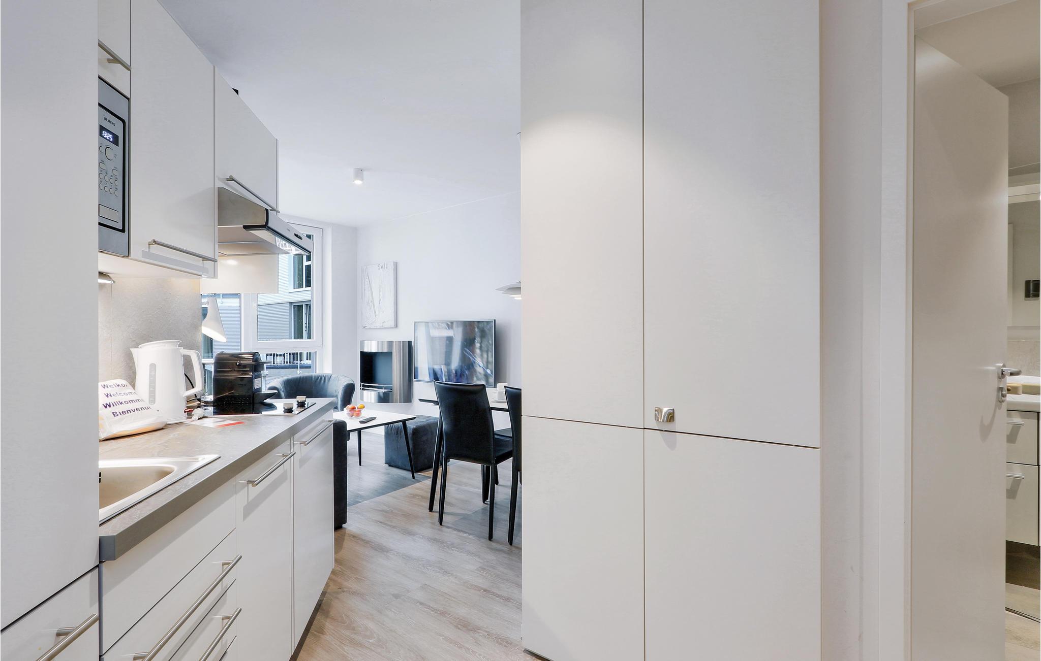 Der Wohnbereich verfügt über einen Erker aus Glas, dadurch ist die Ferienwohnung besonders hell und lichtdurchflutet. Hier befinden sich ebenfalls die Küchenzeile, das Schlafsofa sowie der Bio-Ethanolkamin. Dieser taucht Ihre Ferienwohnung in ein angenehmes Licht und sorgt für angenehmes Ambiente. Den Balkon erreichen Sie vom separaten Schlafzimmer aus. In der Küche finden Kaffeeliebhaber eine Nespresso-Maschine (Kapseln bitte selbst mitbringen), sowie Thermoskanne und Handfilter zum Selbstbrühen, falls Sie doch den klassischen Filterkaffee bevorzugen.