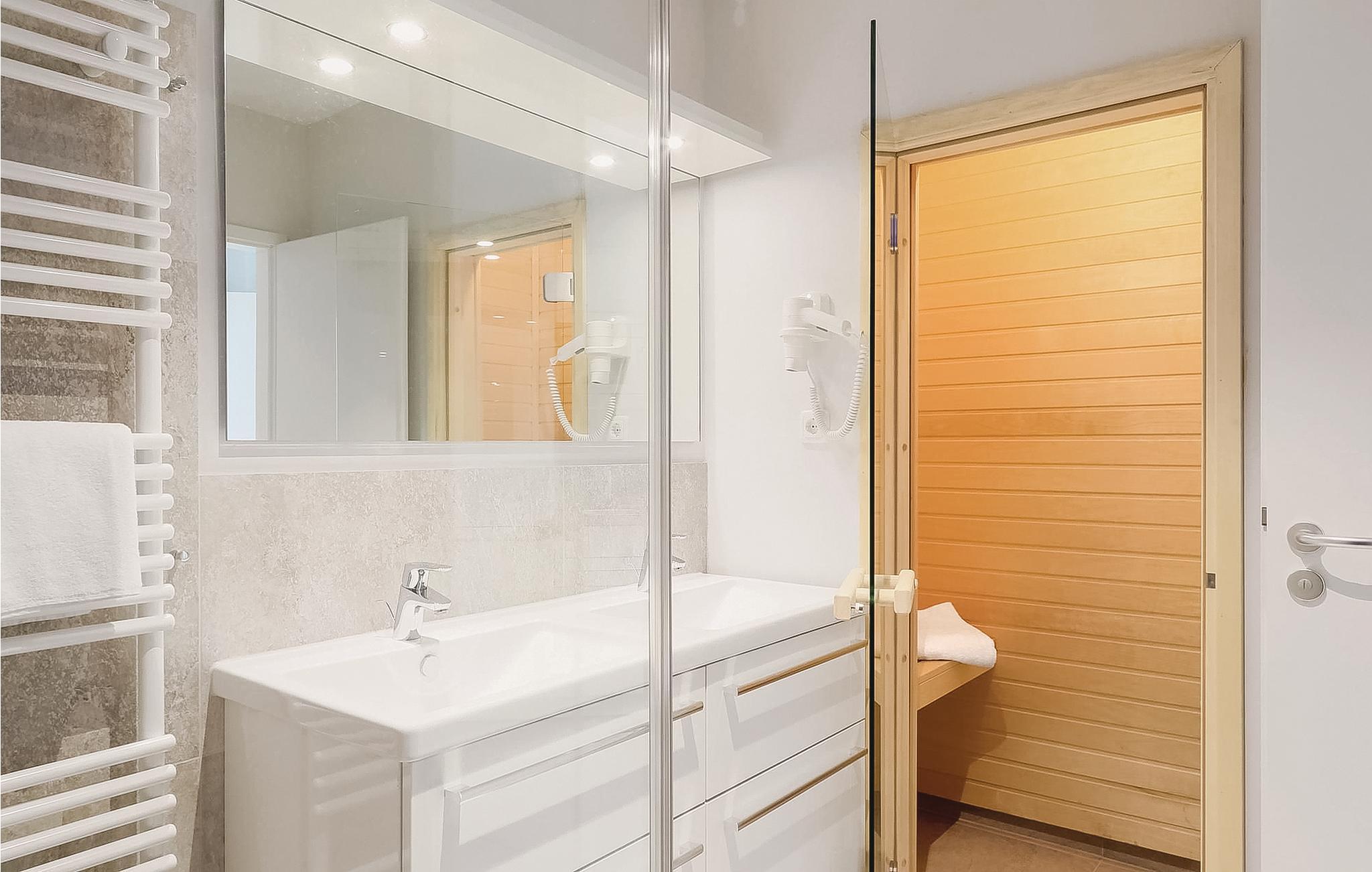 Das Badezimmer präsentiert sich als Ihr privater Wellness-Bereich. Hier können Sie es sich in der Infrarotsauna gemütlich machen oder im Dampfbad mit Regendusche entspannen. Die Ferienwohnung verfügt außerdem über ein modernes Entertainmentsystem mit Blu-Ray-Player, zwei Flatscreen-TV und einer Musikanlage mit MP3-Anschluss.