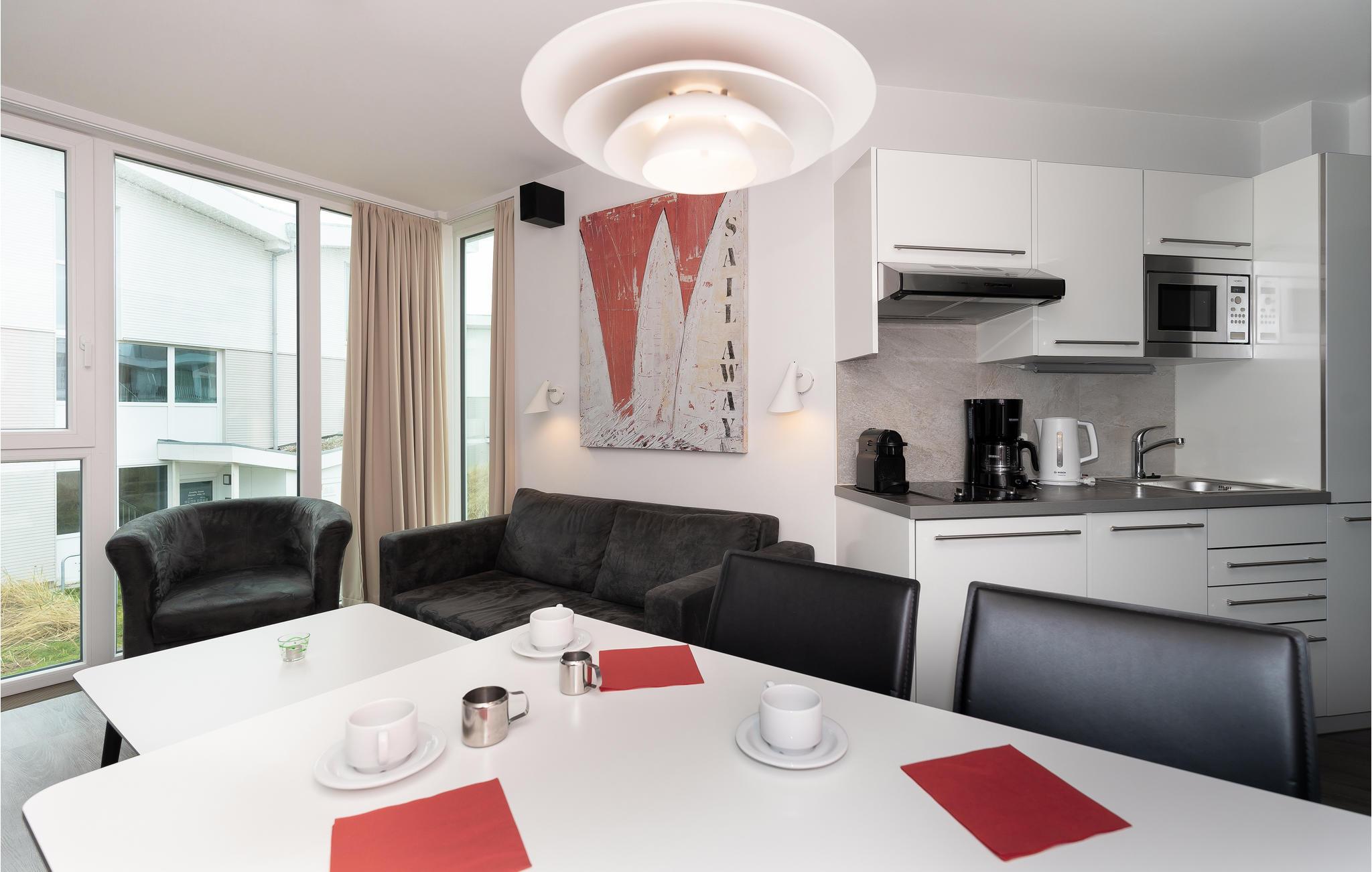 Der Wohnbereich verfügt über einen Erker aus Glas, dadurch ist die Ferienwohnung besonders hell und lichtdurchflutet. Hier befinden sich ebenfalls die Küchenzeile, das Schlafsofa sowie der Bio-Ethanolkamin. Dieser taucht Ihre Ferienwohnung in ein angenehmes Licht und sorgt für angenehmes Ambiente. Den Balkon erreichen Sie vom separaten Schlafzimmer aus. In der Küche finden Kaffeeliebhaber eine Nespresso-Maschine (Kapseln bitte selbst mitbringen), sowie Thermoskanne und Handfilter zum Selbstbrühen, falls Sie doch den klassischen Filterkaffee bevorzugen.