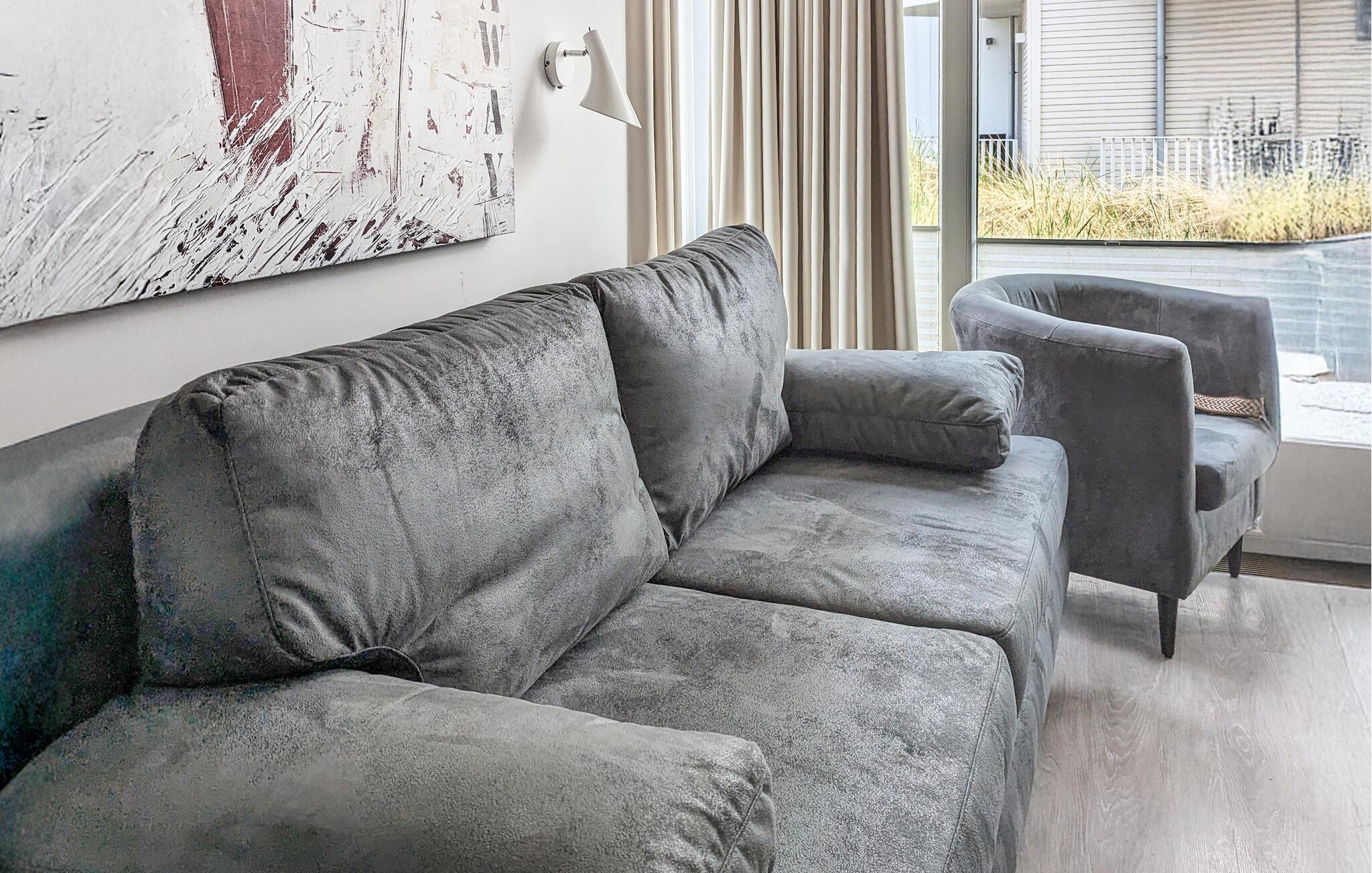 Der Wohnbereich verfügt über einen Erker aus Glas, dadurch ist die Ferienwohnung besonders hell und lichtdurchflutet. Hier befinden sich ebenfalls die Küchenzeile, das Schlafsofa sowie der Bio-Ethanolkamin. Dieser taucht Ihre Ferienwohnung in ein angenehmes Licht. Die überdachte Terrasse erreichen Sie vom separaten Schlafzimmer aus. Hier können Sie gemeinsam frühstücken oder einfach nur die frische Ostseeluft genießen.