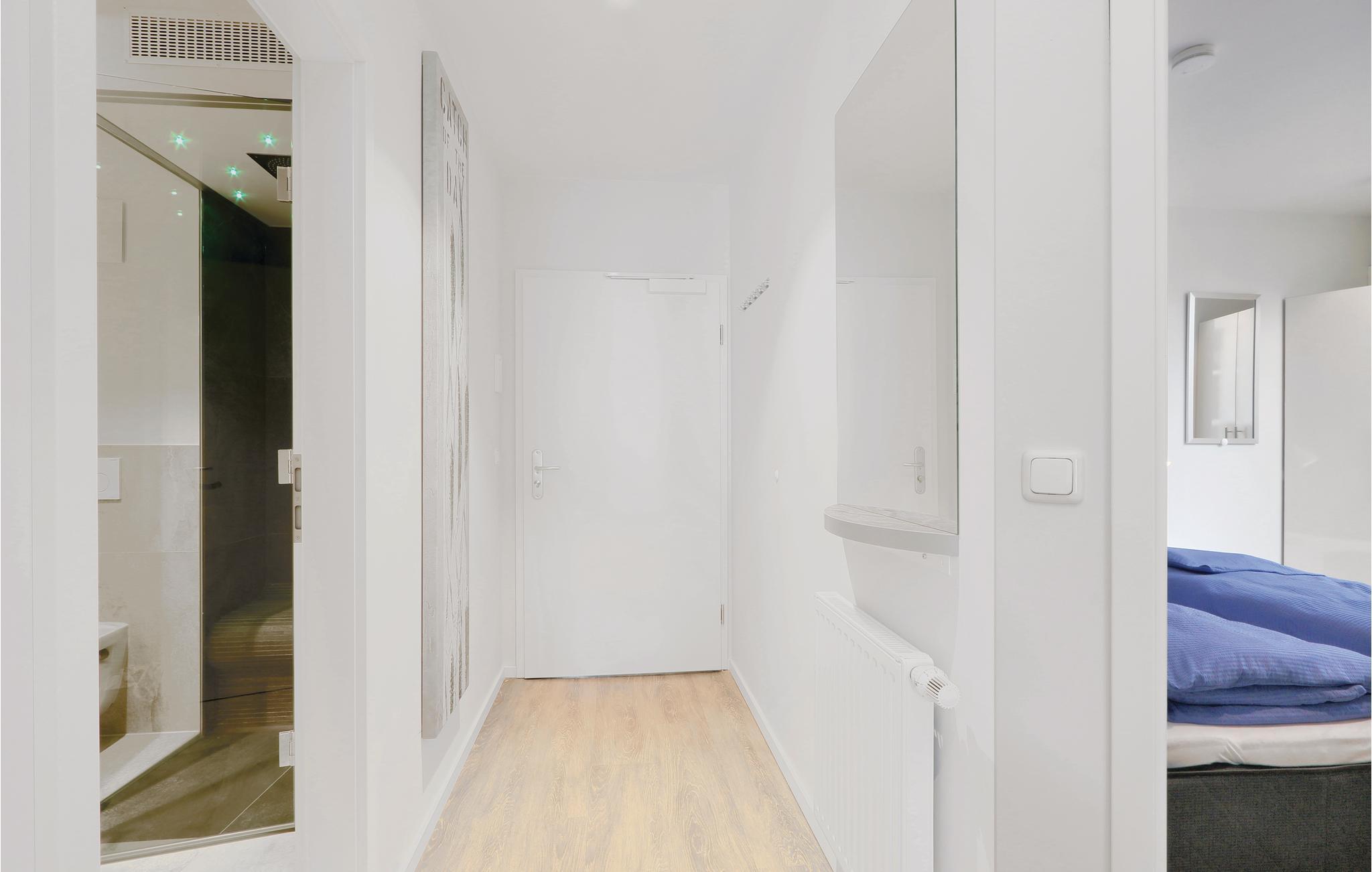 Das Badezimmer präsentiert sich als Ihr privater Wellness-Bereich. Hier können Sie es sich in der Infrarotsauna gemütlich machen oder im Dampfbad mit Regendusche entspannen. Die Ferienwohnung verfügt außerdem über ein modernes Entertainmentsystem mit Blu-Ray-Player, zwei Flatscreen-TV und einer Musikanlage mit MP3-Anschluss.