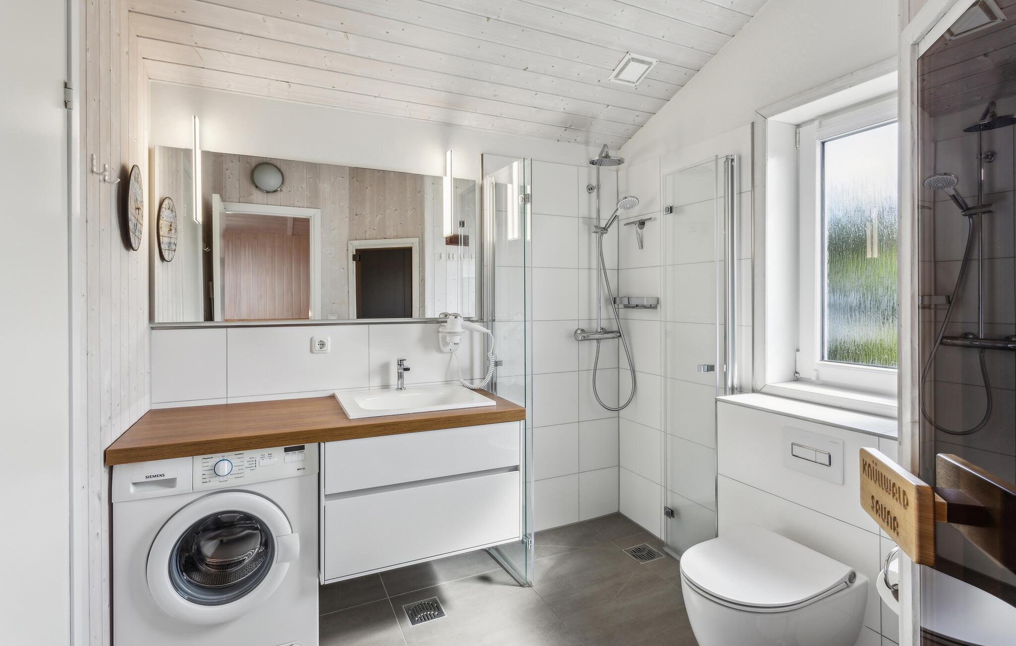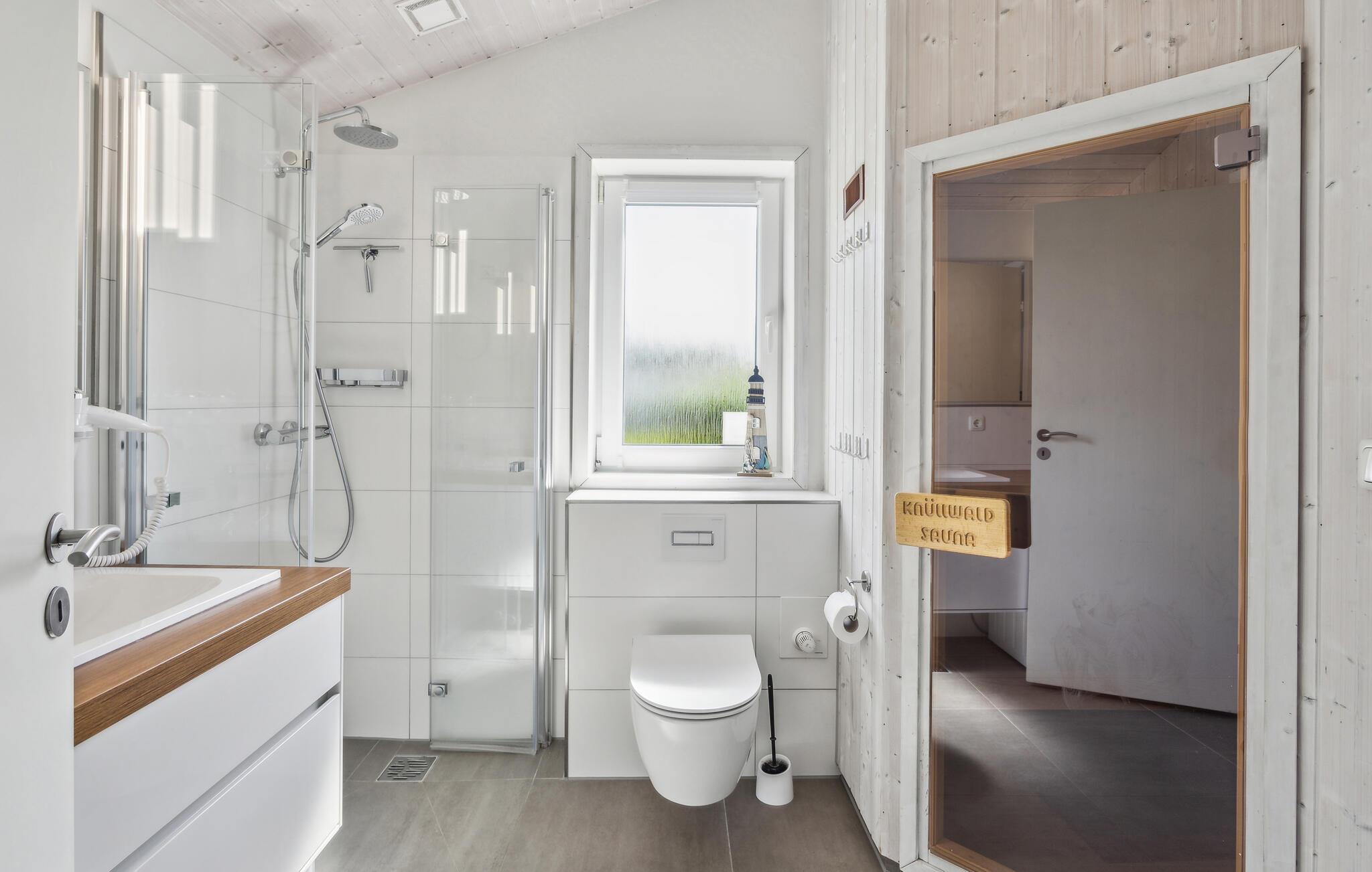Dank eines Schlafsofas im Wohnbereich können hier bis zu sechs Personen urlauben, und das gerade einmal hundert Meter vom bekannten, breiten Strand von Travemünde-Priwall entfernt. Das Highlight der Häuser ist das große Badezimmer, das über eine Sauna verfügt. Es ist von beiden Schlafzimmern aus zugänglich. Hier können Sie sich gerade an kühleren Tagen nach langen Strandspaziergängen wieder aufwärmen und bei Aromaaufgüssen perfekt entspannen. Anschließend lassen sich vor dem Bioethanol-Kamin im Wohnzimmer gemütliche Stunden verbringen und der Alltag einfach mal vergessen.