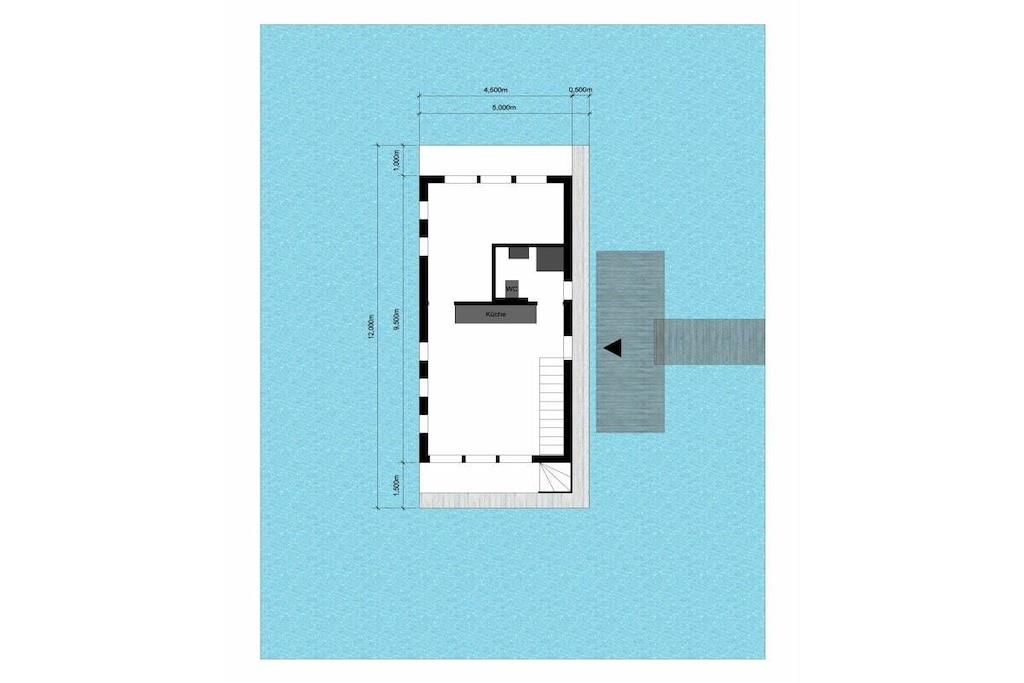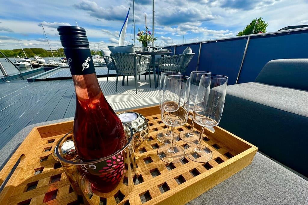Modernes Hausboot in Travemünde mit Dachterrasse, Schwimmbecken und tollem Meerblick.
