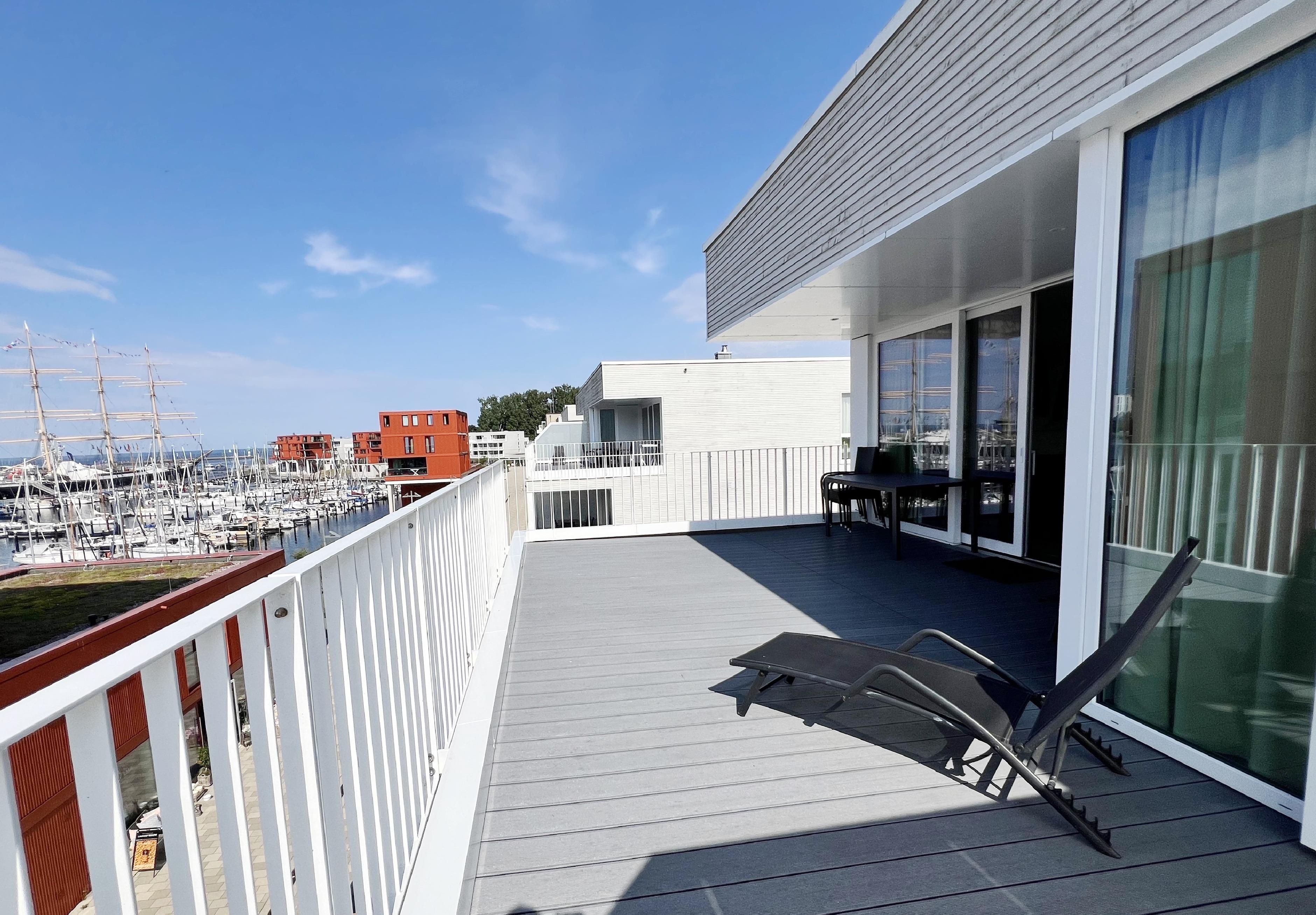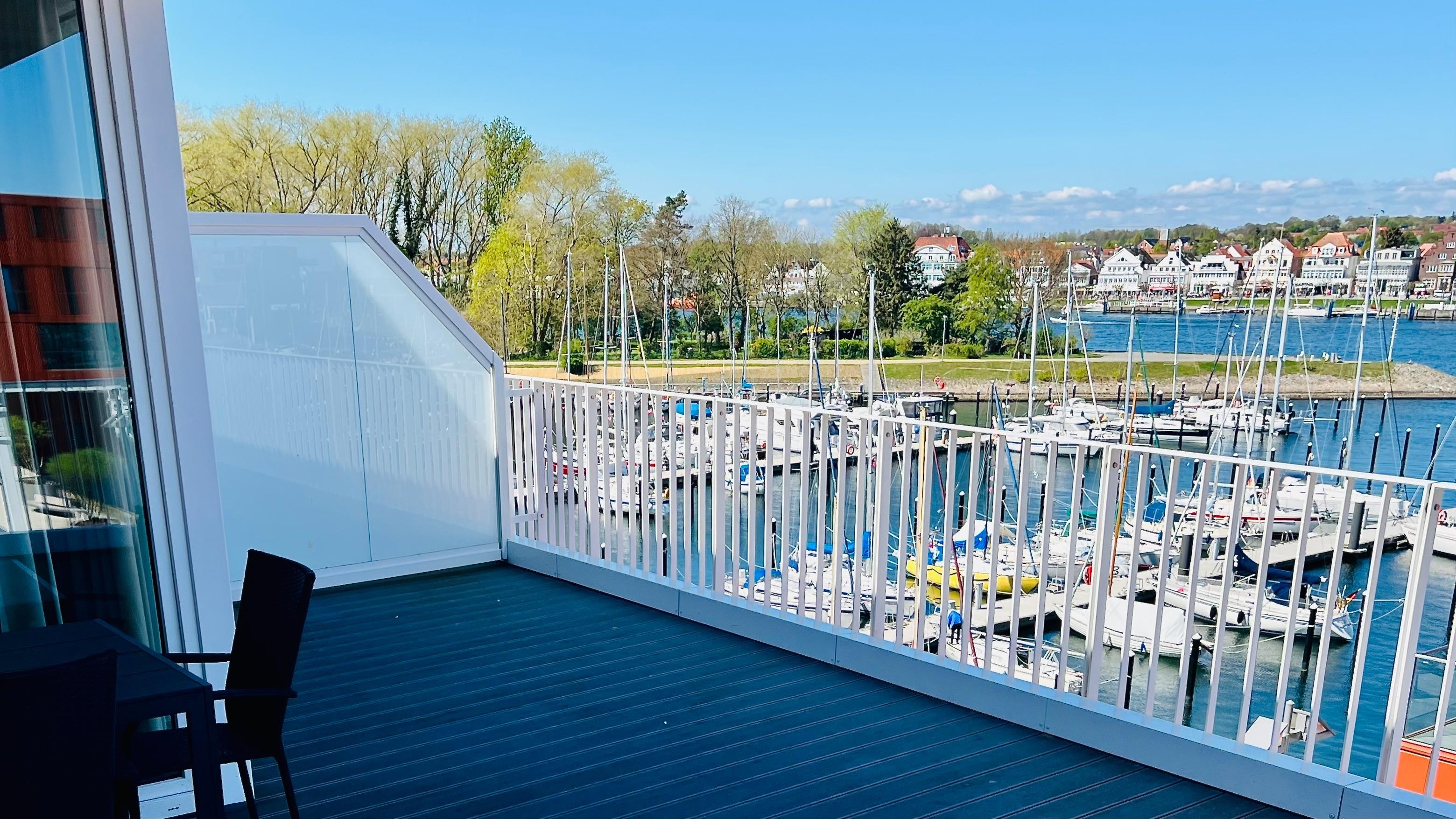 Auf der einen Terrasse können Sie in der Sonne im Windschatten frühstücken, auf der Terrasse zur Seeseite kann man sich auf der Sonnenliege an den vorbeigleitenden Ostsee-Fähren bei einem Sonnenbad erfreuen, um anschließend bei einem "Sundowner" den Sonnenuntergang vor der Skyline von Travemünde zu genießen.
