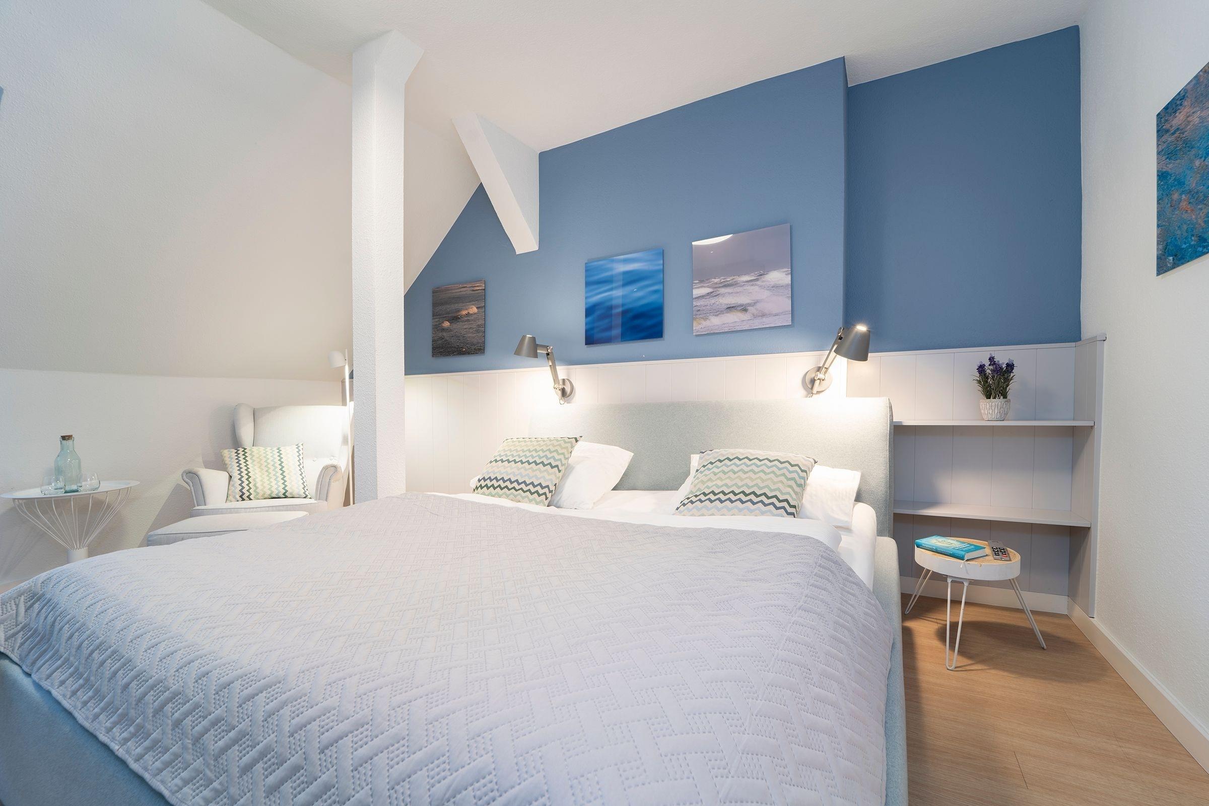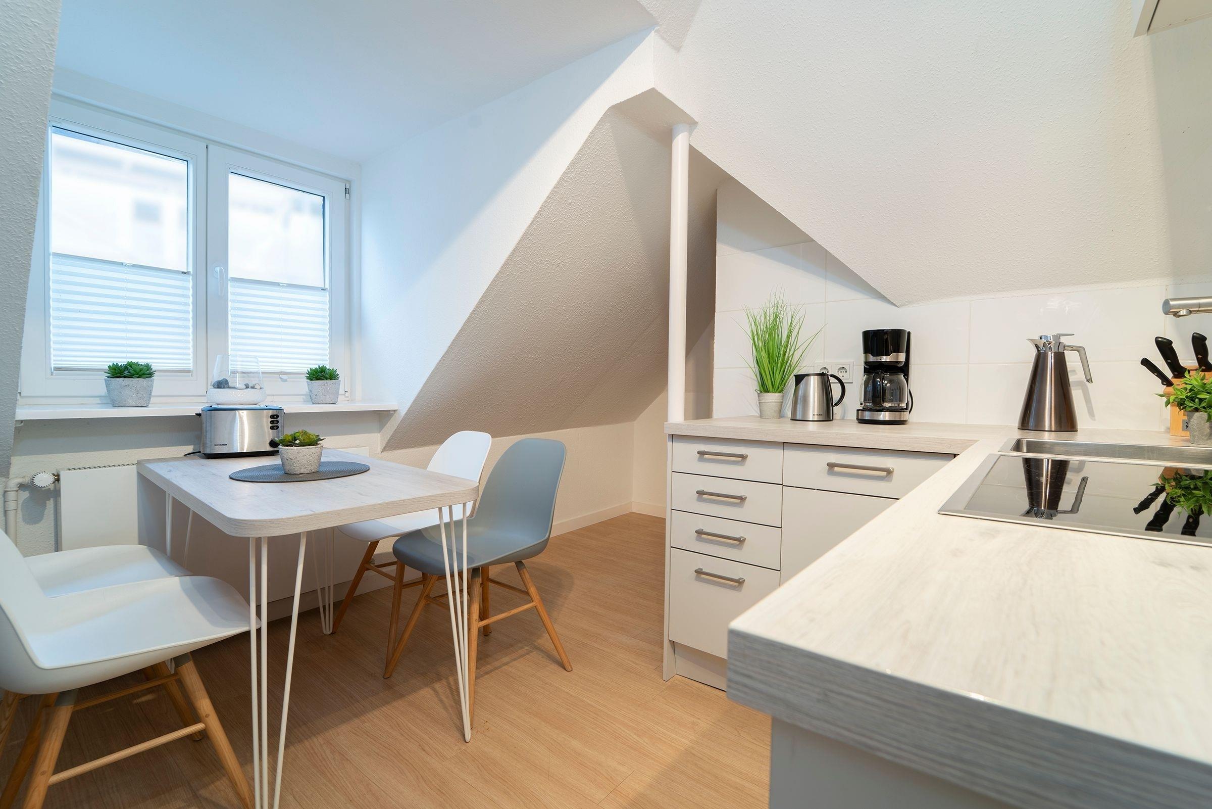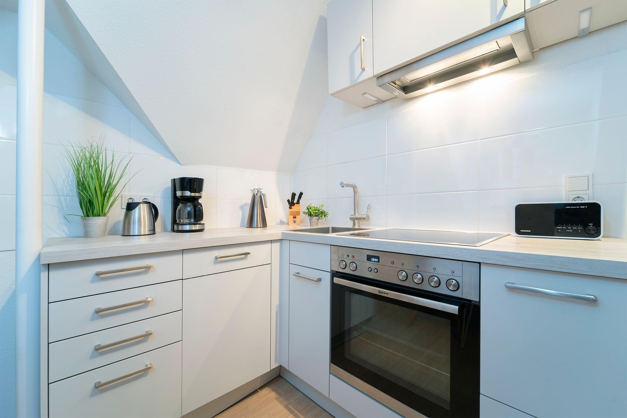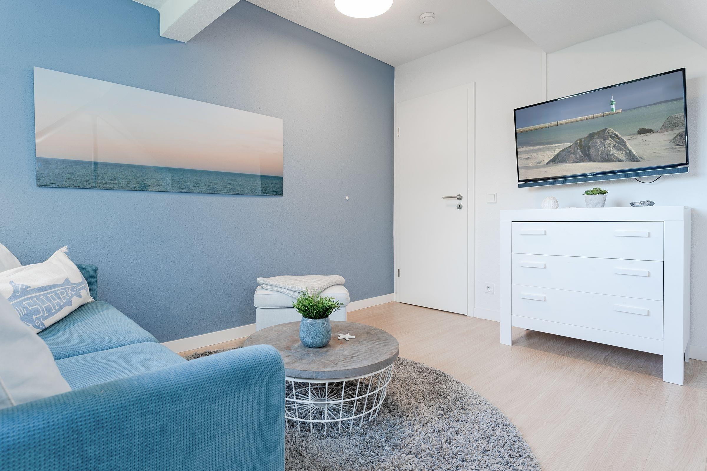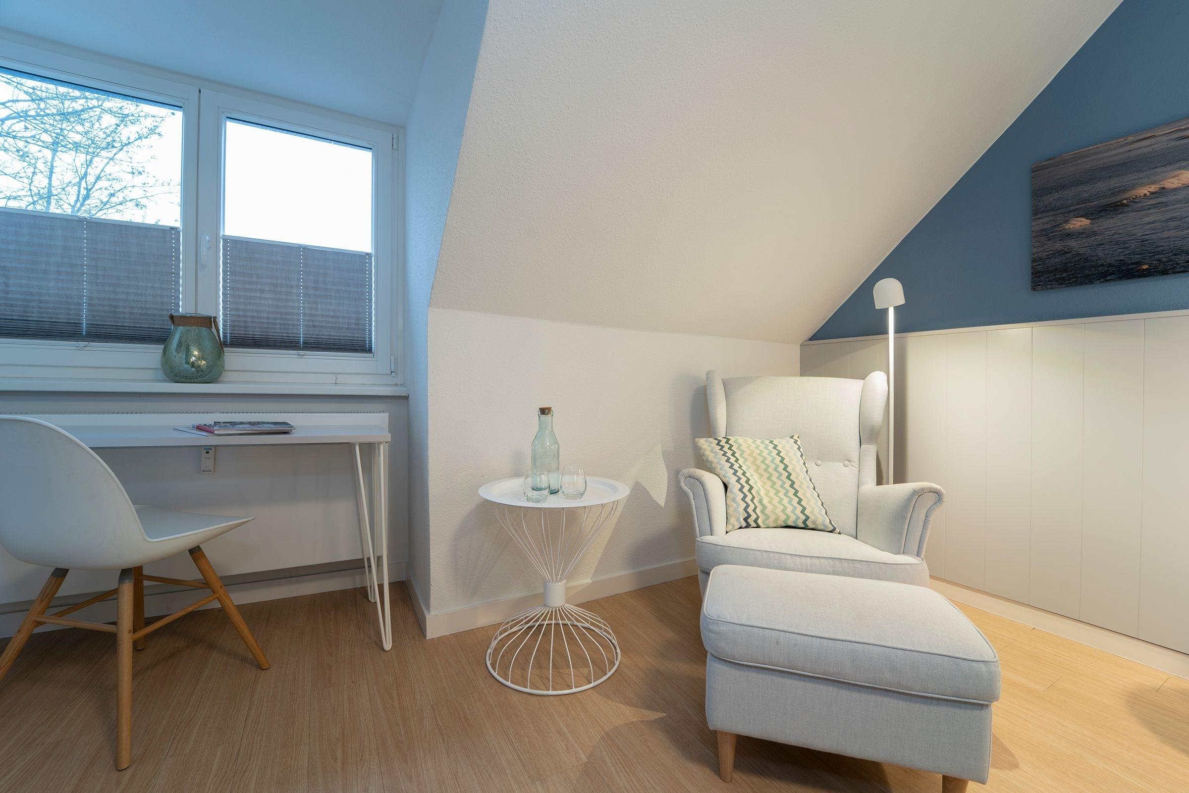 Das modern eingerichtete Schlafzimmer erreichen Sie vom Flur. Ein Boxspringbett (180x200 cm), ein Kleiderschrank und ein weiterer Flat-Screen TV gehören zur Ausstattung. Nach ausgiebigen Spaziergängen nur einmal kurz die Beine hoch legen oder ganz entspannt dem Fernsehprogramm aus dem bequemen Relaxsessel folgen. In Ihrem Wohnbereich werden Sie sich wohlfühlen. Es erwartet Sie dort eine bequeme Couch, ein Flat-Screen TV und ein zusätzlich kuscheliges Bett (90x200 cm). Verdunklungsplissees an allen Fenstern - der perfekte Licht-, Sicht,- und Sonnenschutz. Zum gemeinsam Kochen lädt die separate Küche mit einem Essbereich ein. Das moderne Duschbad mit Handtuchwärmer, Föhn und WC rundet den Anspruch dieser Ferienwohnung ab. Außerdem sorgen die schrägen Wände für ein heimeliges Gefühl. Die Internetnutzung ist über W-LAN kostenlos möglich.