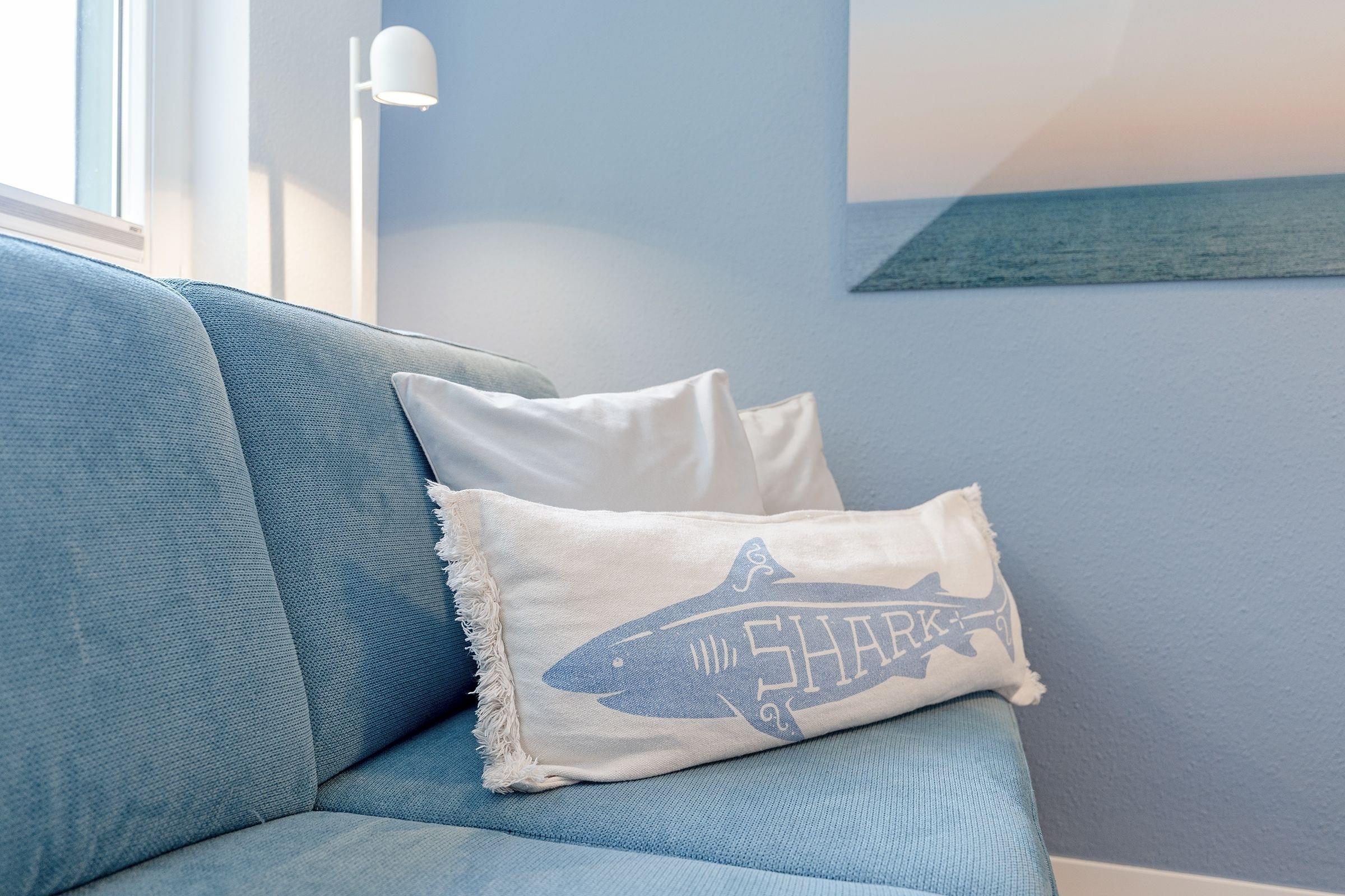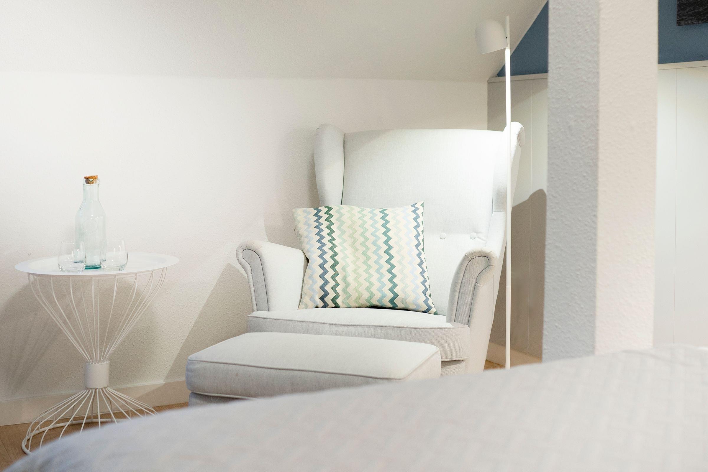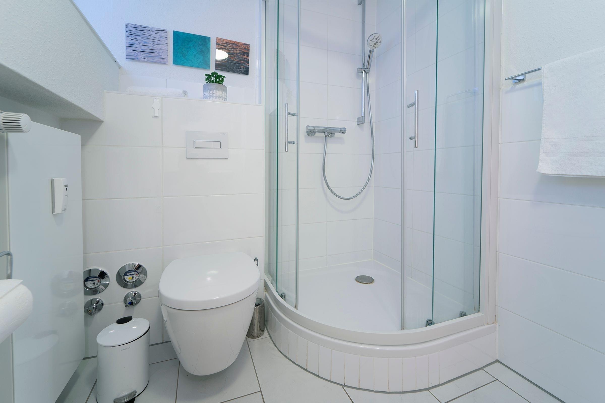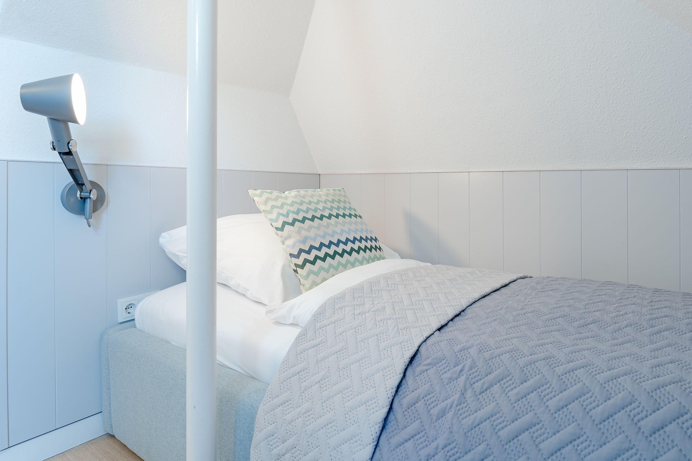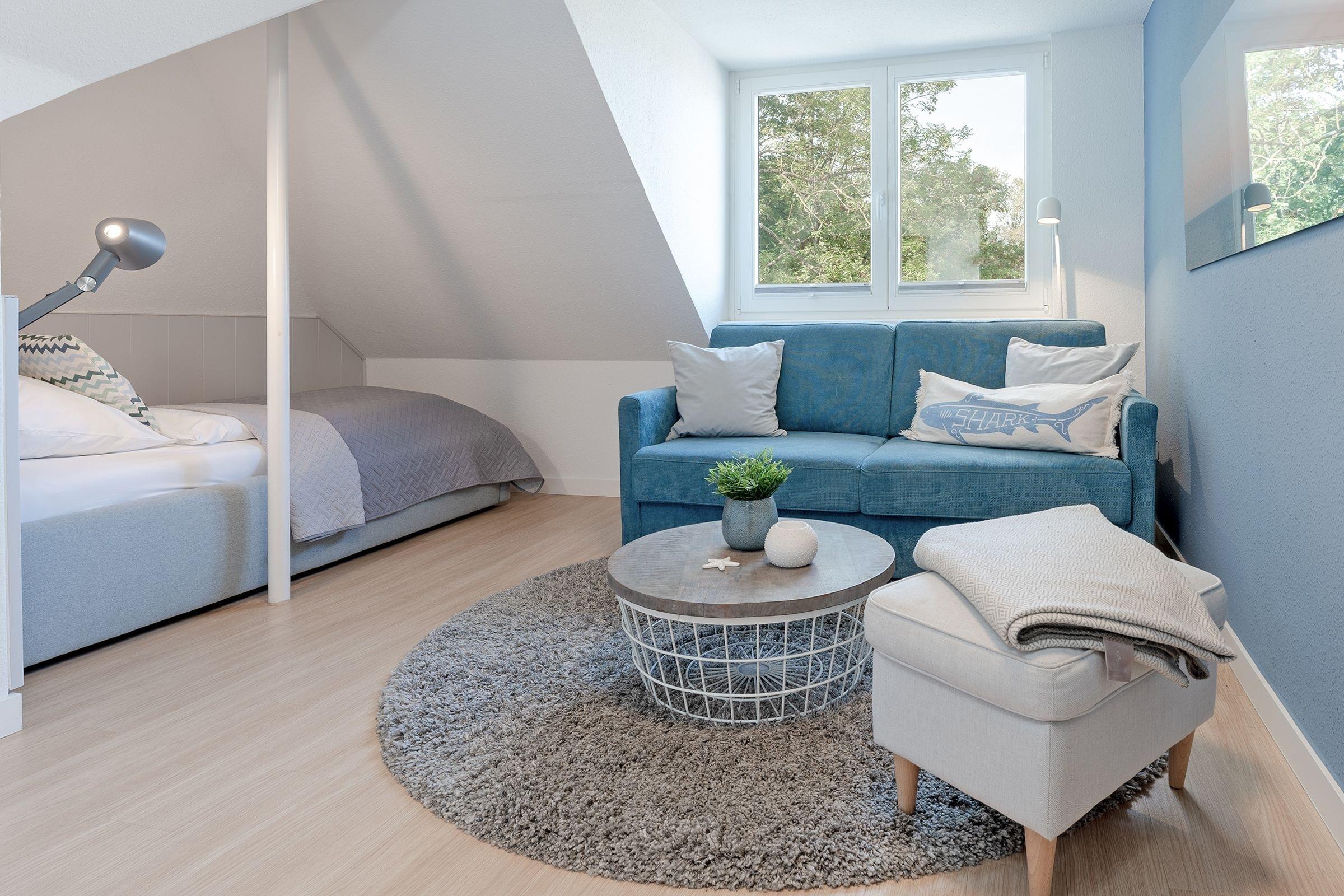 Das modern eingerichtete Schlafzimmer erreichen Sie vom Flur. Ein Boxspringbett (180x200 cm), ein Kleiderschrank und ein weiterer Flat-Screen TV gehören zur Ausstattung. Nach ausgiebigen Spaziergängen nur einmal kurz die Beine hoch legen oder ganz entspannt dem Fernsehprogramm aus dem bequemen Relaxsessel folgen. In Ihrem Wohnbereich werden Sie sich wohlfühlen. Es erwartet Sie dort eine bequeme Couch, ein Flat-Screen TV und ein zusätzlich kuscheliges Bett (90x200 cm). Verdunklungsplissees an allen Fenstern - der perfekte Licht-, Sicht,- und Sonnenschutz. Zum gemeinsam Kochen lädt die separate Küche mit einem Essbereich ein. Das moderne Duschbad mit Handtuchwärmer, Föhn und WC rundet den Anspruch dieser Ferienwohnung ab. Außerdem sorgen die schrägen Wände für ein heimeliges Gefühl. Die Internetnutzung ist über W-LAN kostenlos möglich.