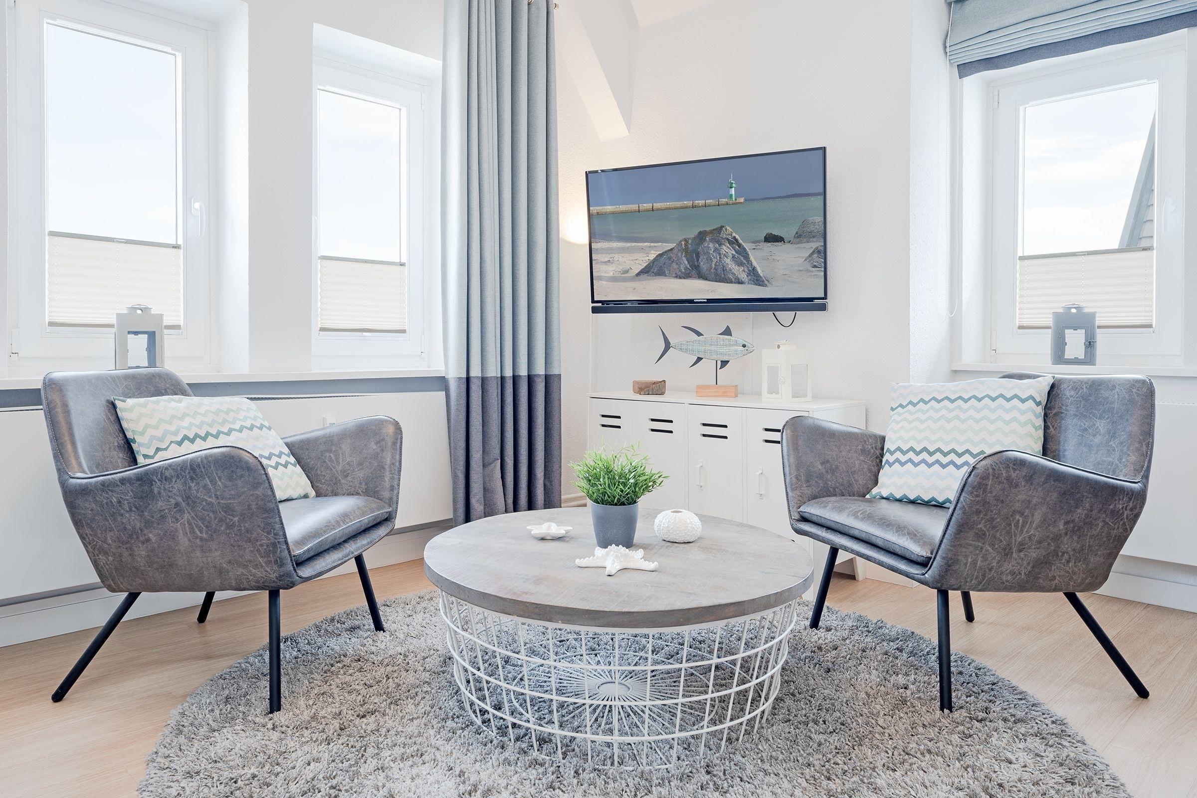 Nur noch einige Treppenstufen hinauf bis zur Eingangstür. Ein geräumiger Flur empfängt Sie. Geradezu ein gemütliches Wohnzimmer mit Essplatz und komfortablem Sofa mit Schlaffunktion (160x200 cm) lädt nach ereignisreichem Urlaubstag zum kuscheligen Beisammensein ein. Ein Flat-Screen TV sorgt am Abend für gemütliche Stunden. Über das Internet können Sie Ihre Erlebnisse mit den Freunden teilen. Spaß macht das gemeinsame Kochen in der vollwertig ausgestatteten Küche mit einer Sitzgelegenheit , es wird Ihnen hier an nichts fehlen. Das modern eingerichtete Schlafzimmer erreichen Sie vom Flur. Ein Boxspringbett (180x200 cm), Nachttische auf jeder Bettseite mit Nachttischlampen ein Kleiderschrank und ein weiterer Flat-Screen TV gehören zur Ausstattung. Nach ausgiebigen Spaziergängen nur einmal kurz die Beine hoch legen oder ganz entspannt dem Fernsehprogramm aus dem bequemen Relaxsessel folgen. Gardinen und Verdunkelungsplissee schützen vor den ersten Sonnenstrahlen. Das Duschbad mit Föhn und WC rundet den Anspruch dieser Ferienwohnung ab. Außerdem sorgen die schrägen Wände für ein heimeliges Gefühl.