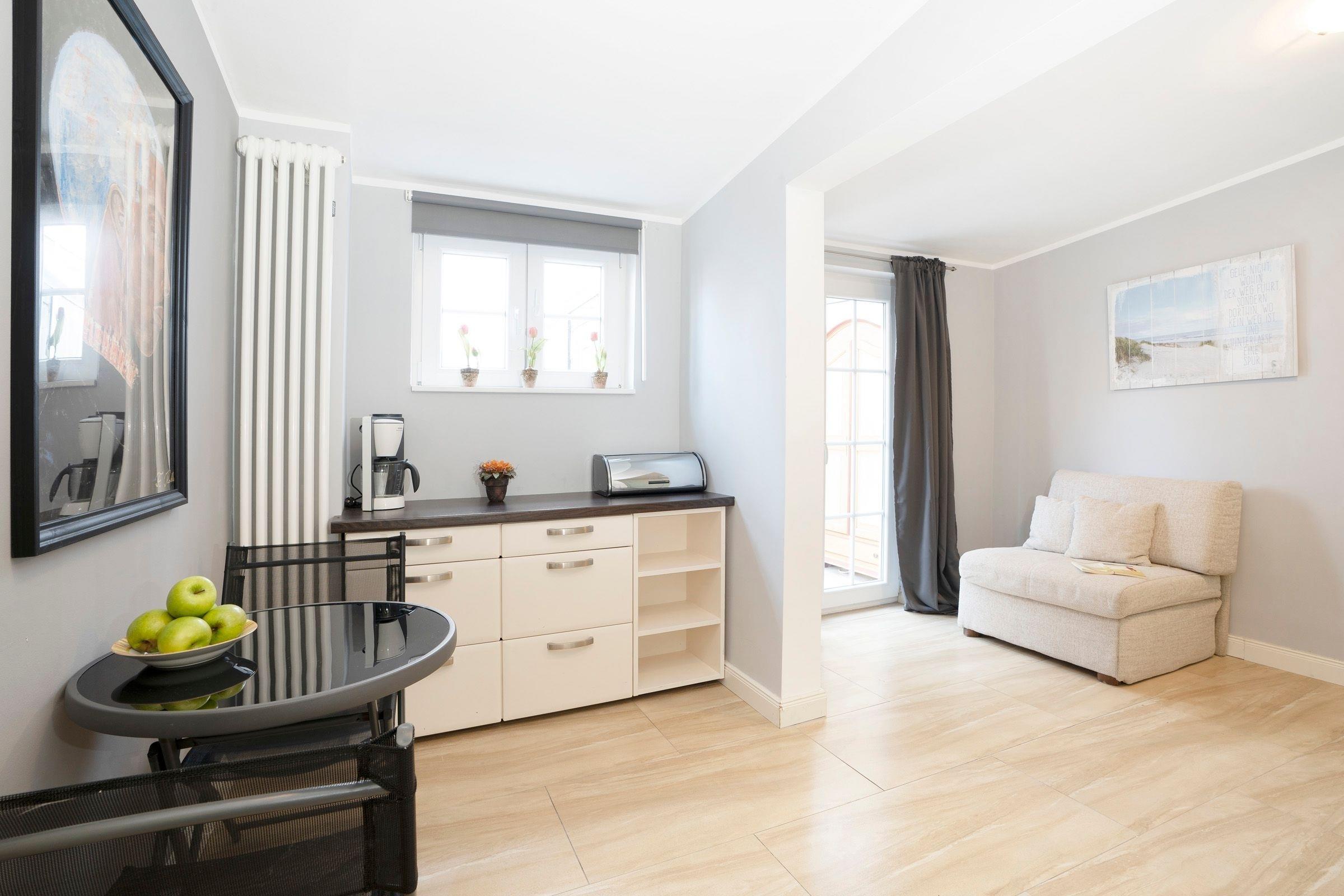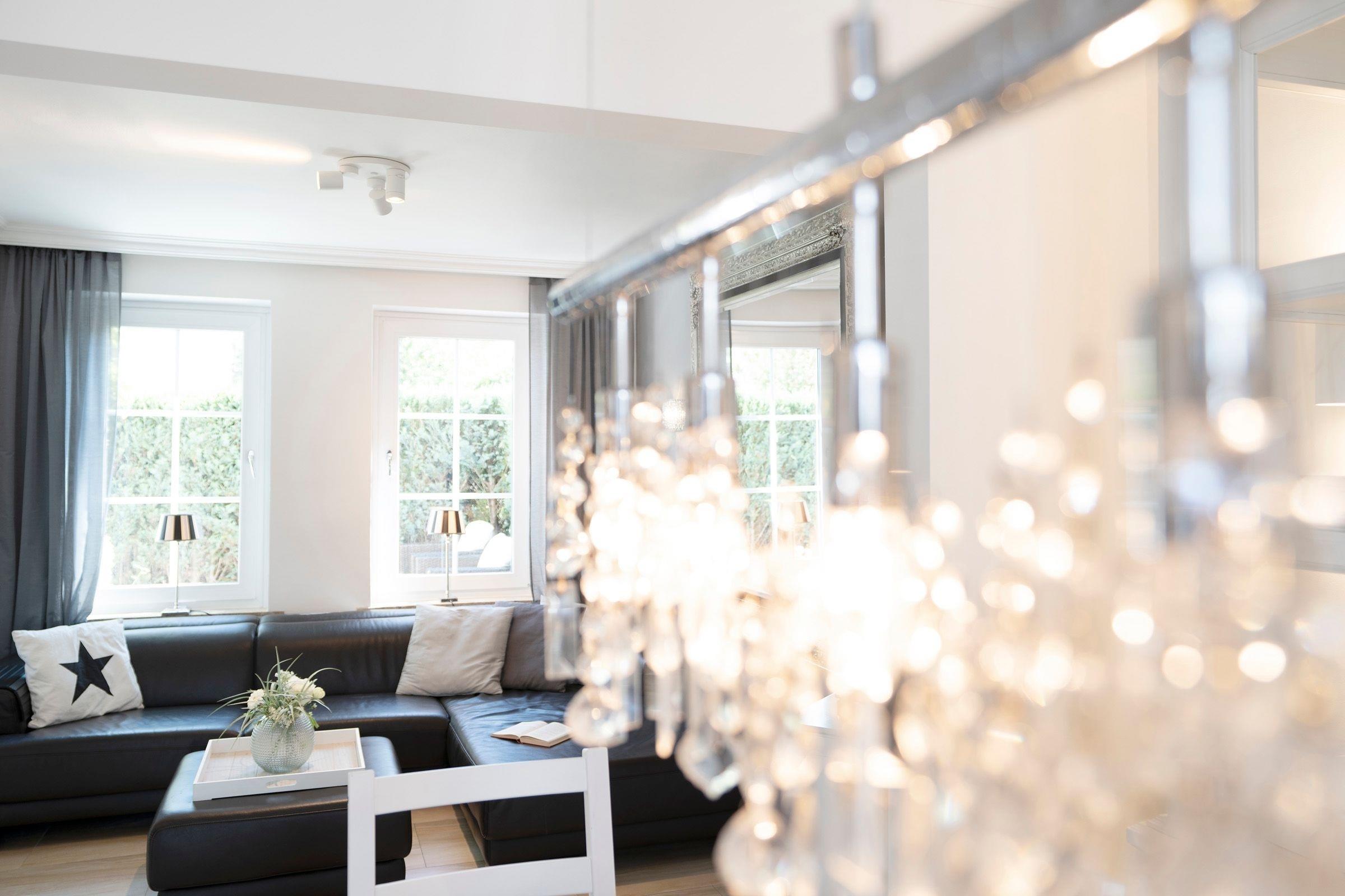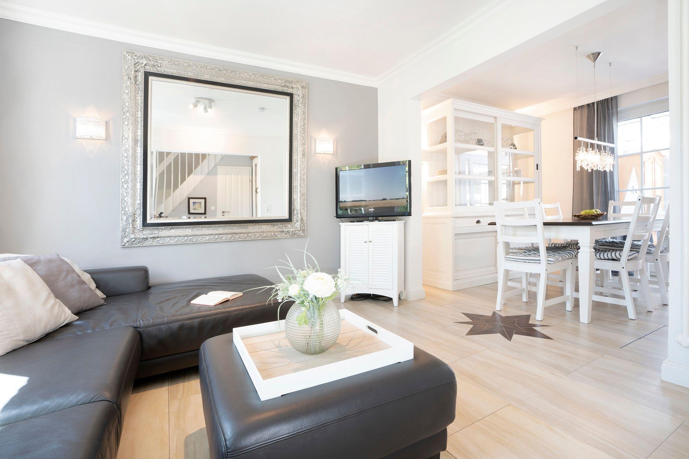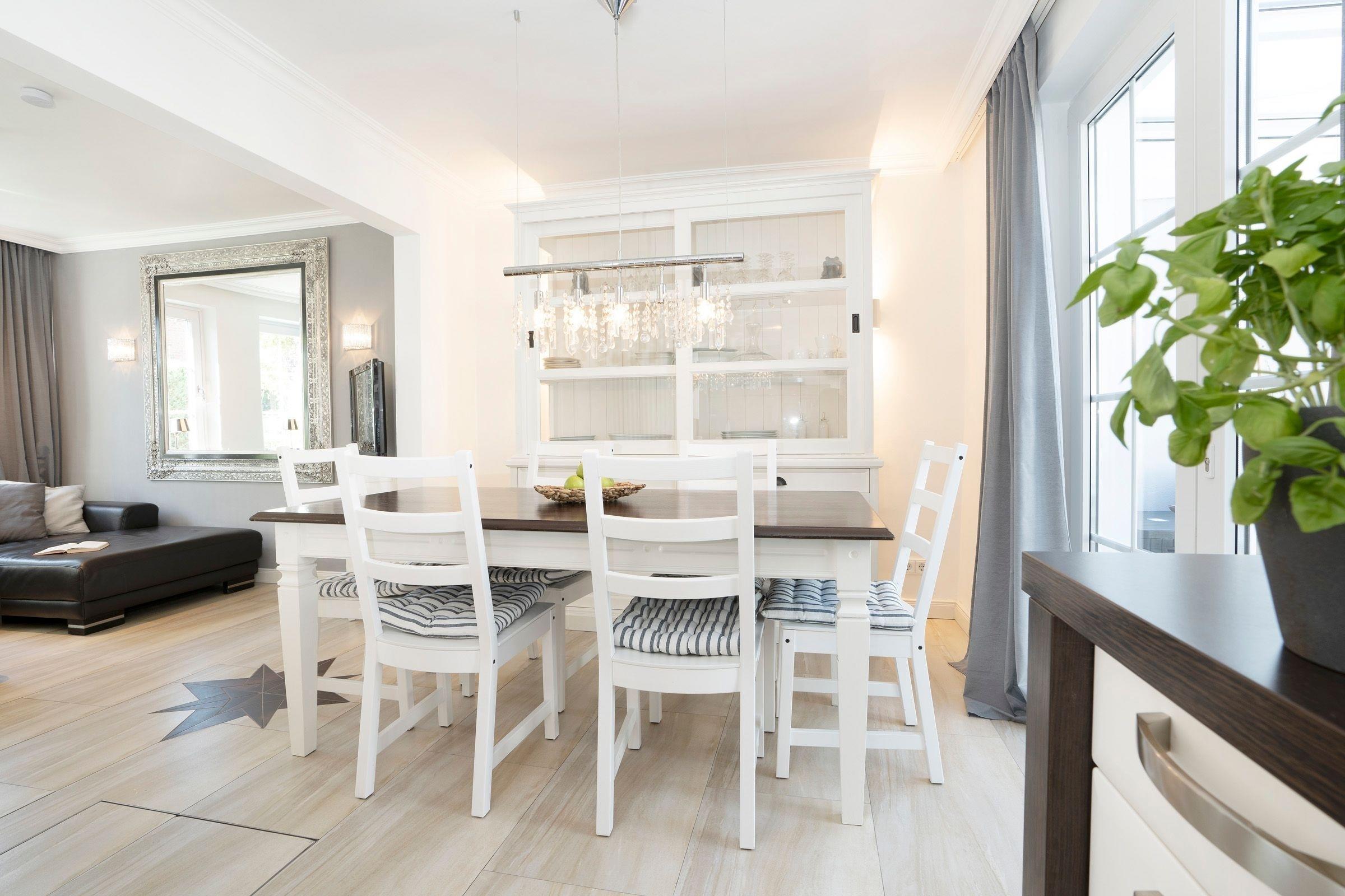 Gemütlich und hell begrüßt Sie der großzügige Wohn- und Essbereich dieses Ferienobjektes im geschmackvollen Landhausstil. Die angrenzende Küche lässt mit einer Filter- und Nespressomaschine keine Wünsche offen und lädt durch die offene Gestaltung zu gemeinsamen Kochabenden ein. Für ausreichend Rückzugsmöglichkeiten ist in diesem Domizil auf drei Etagen mit je einem Schlafzimmer und Tageslichtbad gesorgt. Vom Essbereich gelangen Sie über den lichtdurchfluteten Durchgang mit bodentiefen Fenstern entlang der schönen Terrasse mit Holzfußboden in einen separaten Wohnbereich mit Schrankbett (2x 90x200 cm), eigener Pantryküche und angrenzendem Badezimmer mit Dusche. Im ersten Obergeschoss erwartet Sie ein stilvoll gestaltetes Badezimmer, sowie ein großzügiges Schlafzimmer mit Doppelbett (180x200 cm), in dem Sie sich nach einem ereignisreichen Urlaubstag erholen können. Für Unterhaltung ist durch einen eigenen TV gesorgt. Über eine steile Treppe erreichen Sie das zum Treppenaufgang offen gestaltete Schlafzimmer mit Doppelbett (160x200 cm) im Dachgeschoss, dass mit einem eigenem Badezimmer mit Badewanne für hohen Komfort sorgt. Genießen Sie die Ostseeluft auf einer der beiden gemütlich eingerichteten Terrassen und lassen Sie den Urlaubstag mit Ihren Lieben bei einem Aperitif ausklingen.