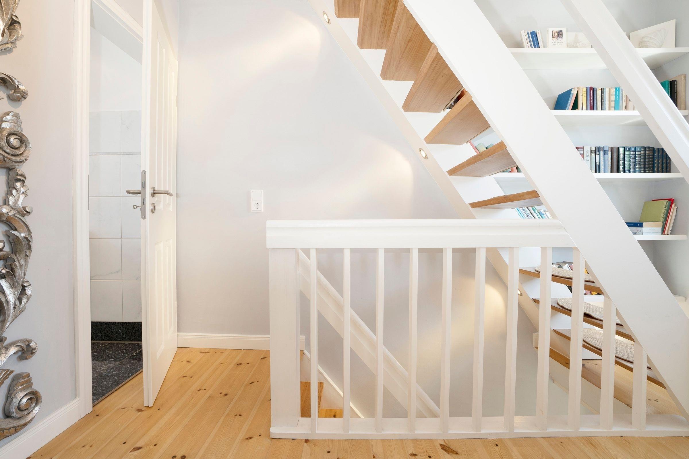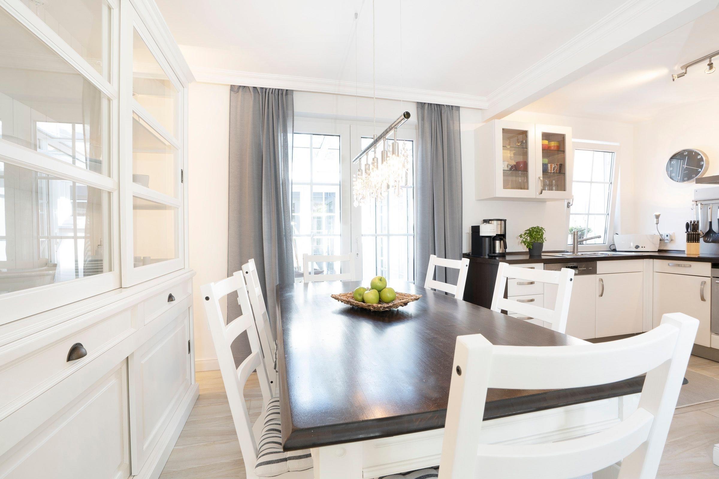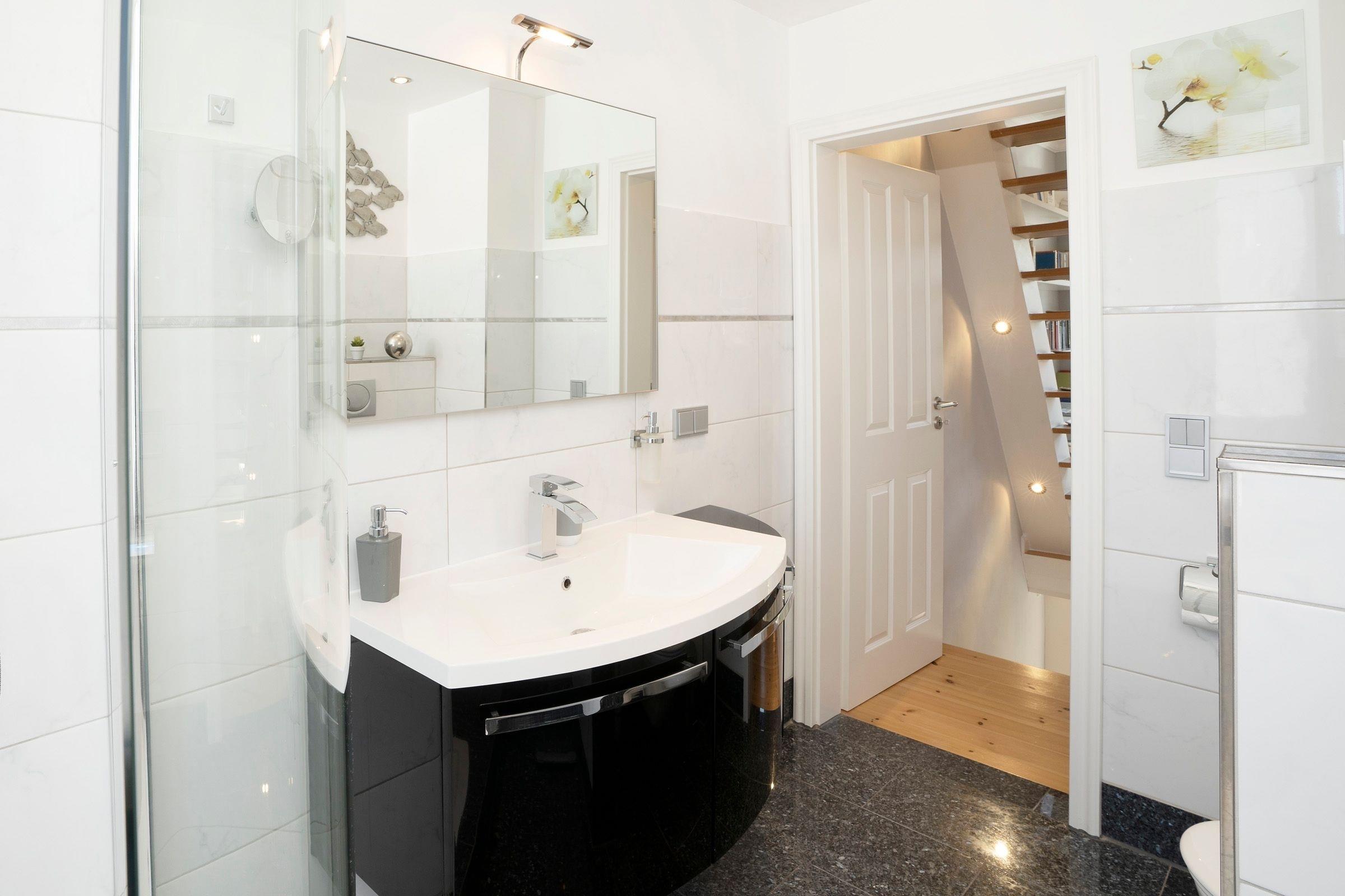 Gemütlich und hell begrüßt Sie der großzügige Wohn- und Essbereich dieses Ferienobjektes im geschmackvollen Landhausstil. Die angrenzende Küche lässt mit einer Filter- und Nespressomaschine keine Wünsche offen und lädt durch die offene Gestaltung zu gemeinsamen Kochabenden ein. Für ausreichend Rückzugsmöglichkeiten ist in diesem Domizil auf drei Etagen mit je einem Schlafzimmer und Tageslichtbad gesorgt. Vom Essbereich gelangen Sie über den lichtdurchfluteten Durchgang mit bodentiefen Fenstern entlang der schönen Terrasse mit Holzfußboden in einen separaten Wohnbereich mit Schrankbett (2x 90x200 cm), eigener Pantryküche und angrenzendem Badezimmer mit Dusche. Im ersten Obergeschoss erwartet Sie ein stilvoll gestaltetes Badezimmer, sowie ein großzügiges Schlafzimmer mit Doppelbett (180x200 cm), in dem Sie sich nach einem ereignisreichen Urlaubstag erholen können. Für Unterhaltung ist durch einen eigenen TV gesorgt. Über eine steile Treppe erreichen Sie das zum Treppenaufgang offen gestaltete Schlafzimmer mit Doppelbett (160x200 cm) im Dachgeschoss, dass mit einem eigenem Badezimmer mit Badewanne für hohen Komfort sorgt. Genießen Sie die Ostseeluft auf einer der beiden gemütlich eingerichteten Terrassen und lassen Sie den Urlaubstag mit Ihren Lieben bei einem Aperitif ausklingen.