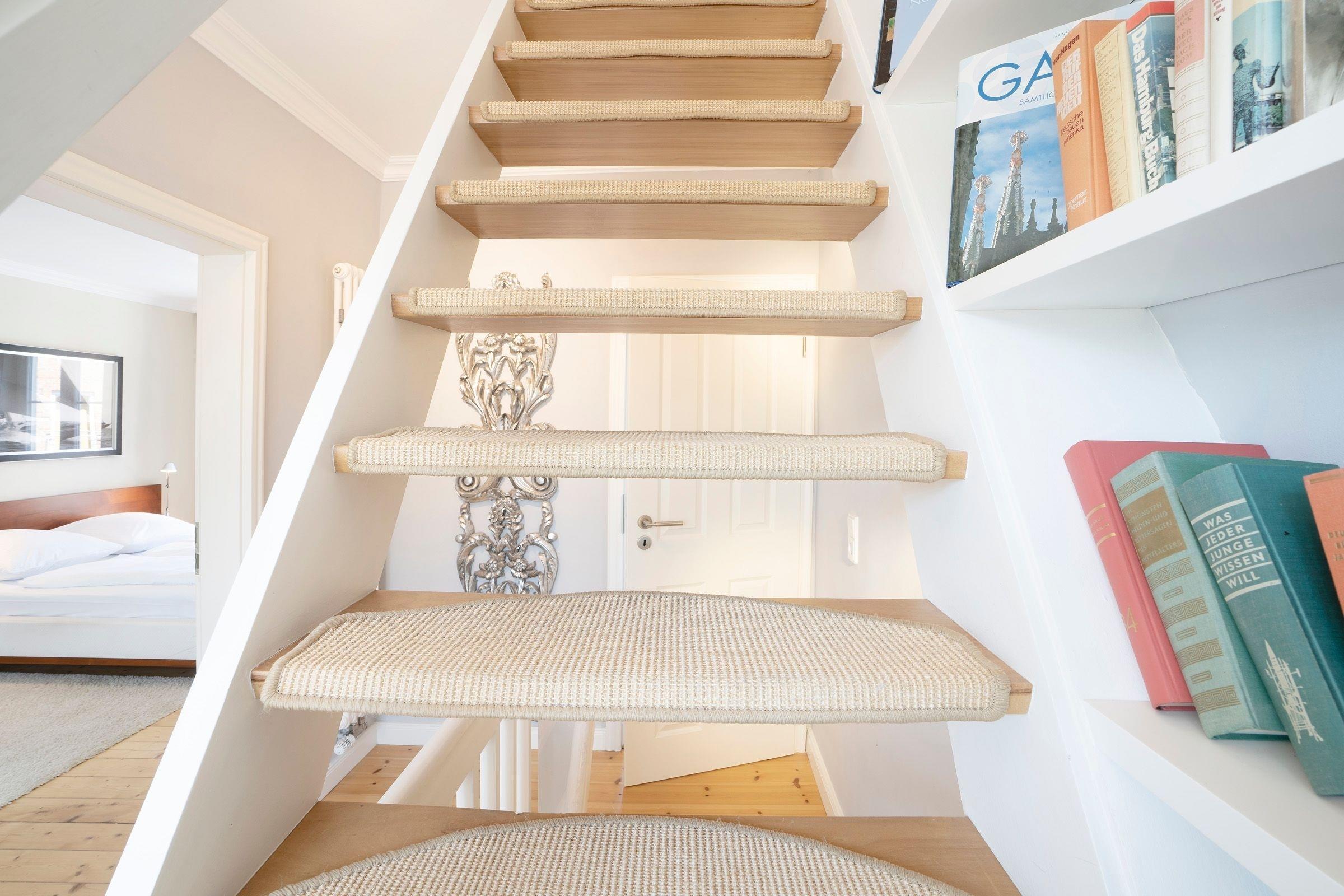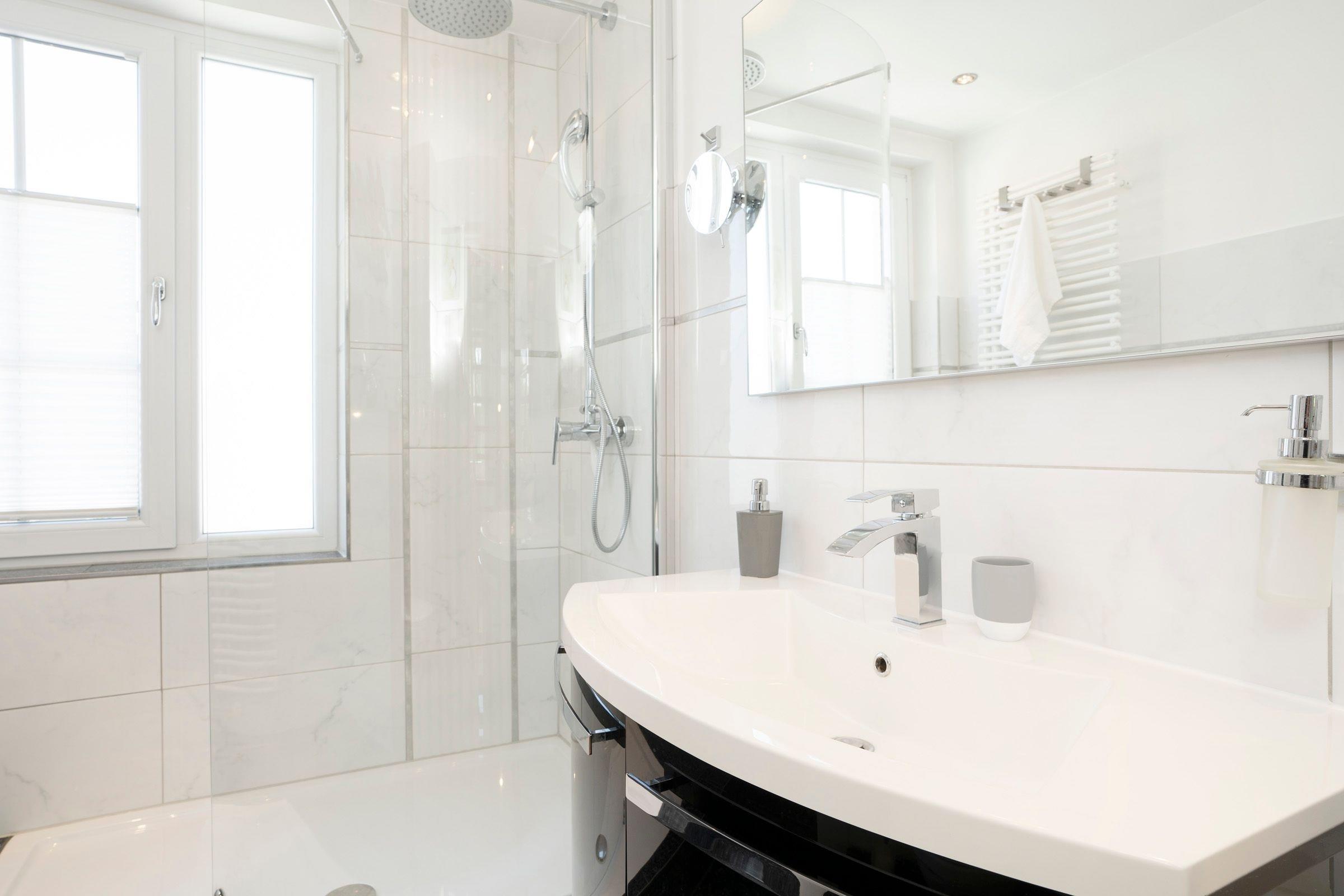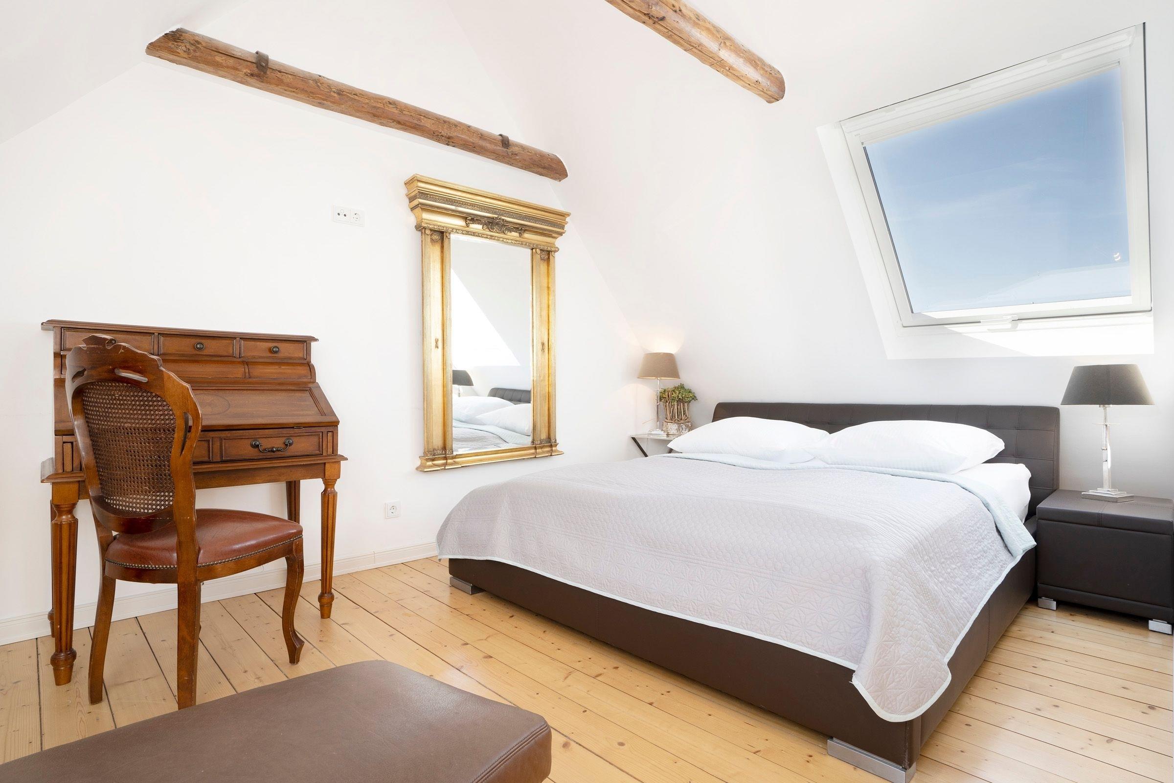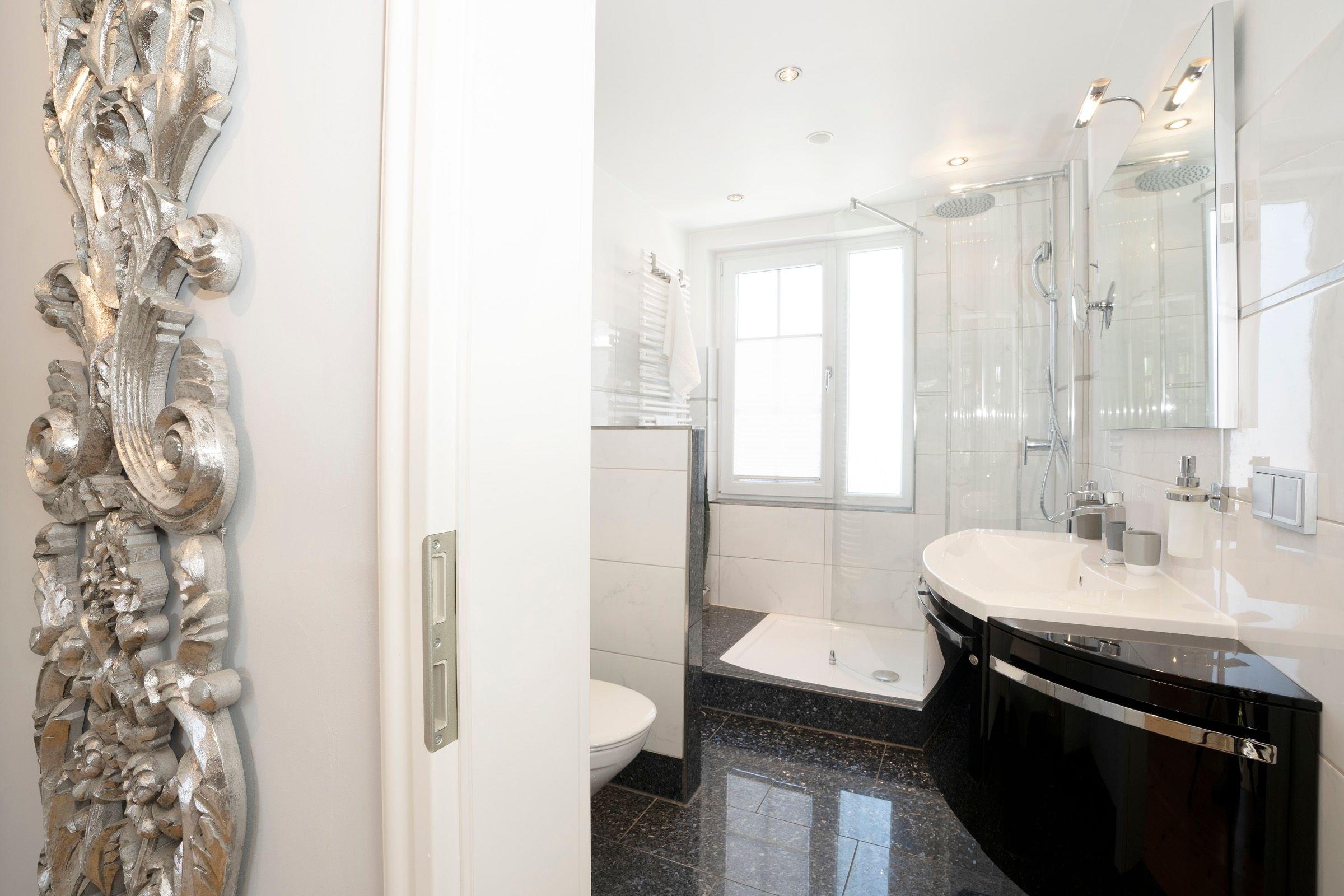 Gemütlich und hell begrüßt Sie der großzügige Wohn- und Essbereich dieses Ferienobjektes im geschmackvollen Landhausstil. Die angrenzende Küche lässt mit einer Filter- und Nespressomaschine keine Wünsche offen und lädt durch die offene Gestaltung zu gemeinsamen Kochabenden ein. Für ausreichend Rückzugsmöglichkeiten ist in diesem Domizil auf drei Etagen mit je einem Schlafzimmer und Tageslichtbad gesorgt. Vom Essbereich gelangen Sie über den lichtdurchfluteten Durchgang mit bodentiefen Fenstern entlang der schönen Terrasse mit Holzfußboden in einen separaten Wohnbereich mit Schrankbett (2x 90x200 cm), eigener Pantryküche und angrenzendem Badezimmer mit Dusche. Im ersten Obergeschoss erwartet Sie ein stilvoll gestaltetes Badezimmer, sowie ein großzügiges Schlafzimmer mit Doppelbett (180x200 cm), in dem Sie sich nach einem ereignisreichen Urlaubstag erholen können. Für Unterhaltung ist durch einen eigenen TV gesorgt. Über eine steile Treppe erreichen Sie das zum Treppenaufgang offen gestaltete Schlafzimmer mit Doppelbett (160x200 cm) im Dachgeschoss, dass mit einem eigenem Badezimmer mit Badewanne für hohen Komfort sorgt. Genießen Sie die Ostseeluft auf einer der beiden gemütlich eingerichteten Terrassen und lassen Sie den Urlaubstag mit Ihren Lieben bei einem Aperitif ausklingen.