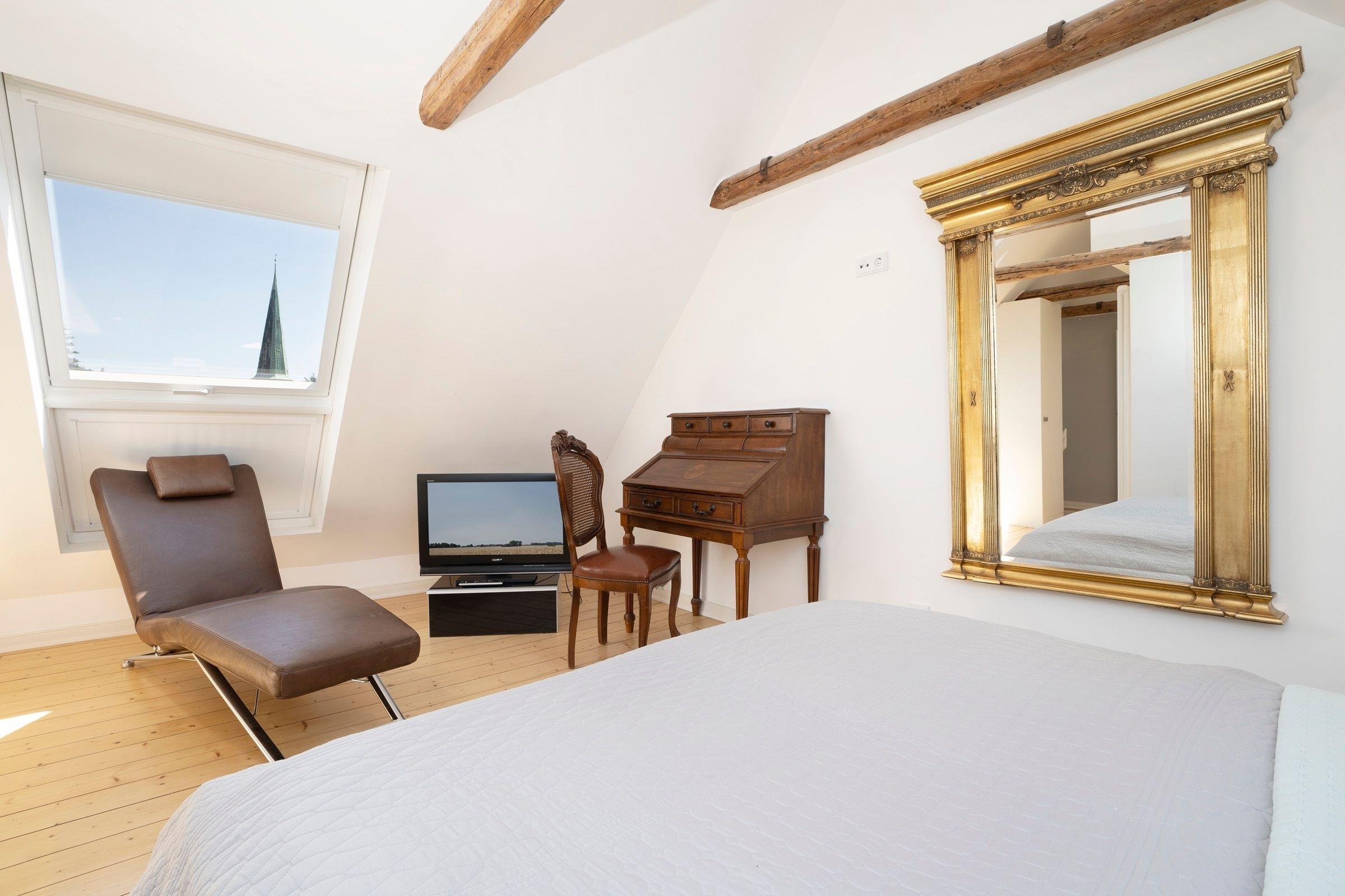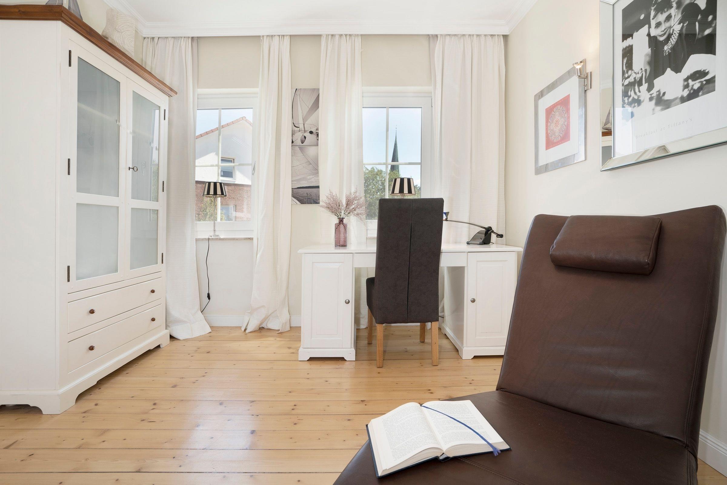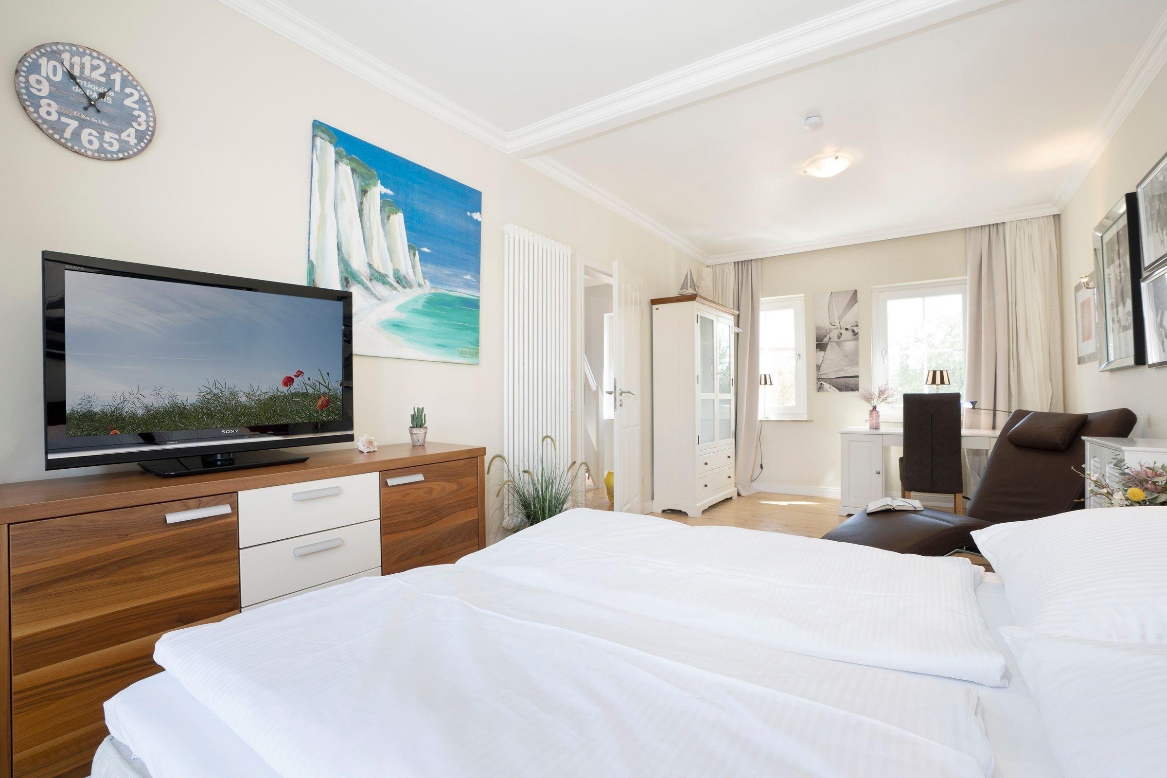 Schlafzimmer 2 (1.OG): 1 Doppelbett (160x200 cm), Verdunkelung (Gardinen), Kleiderschrank, Platz für Kinderreisebett, außerdem: Schreibtisch, Sideboard, elektr. Relaxliege, TV