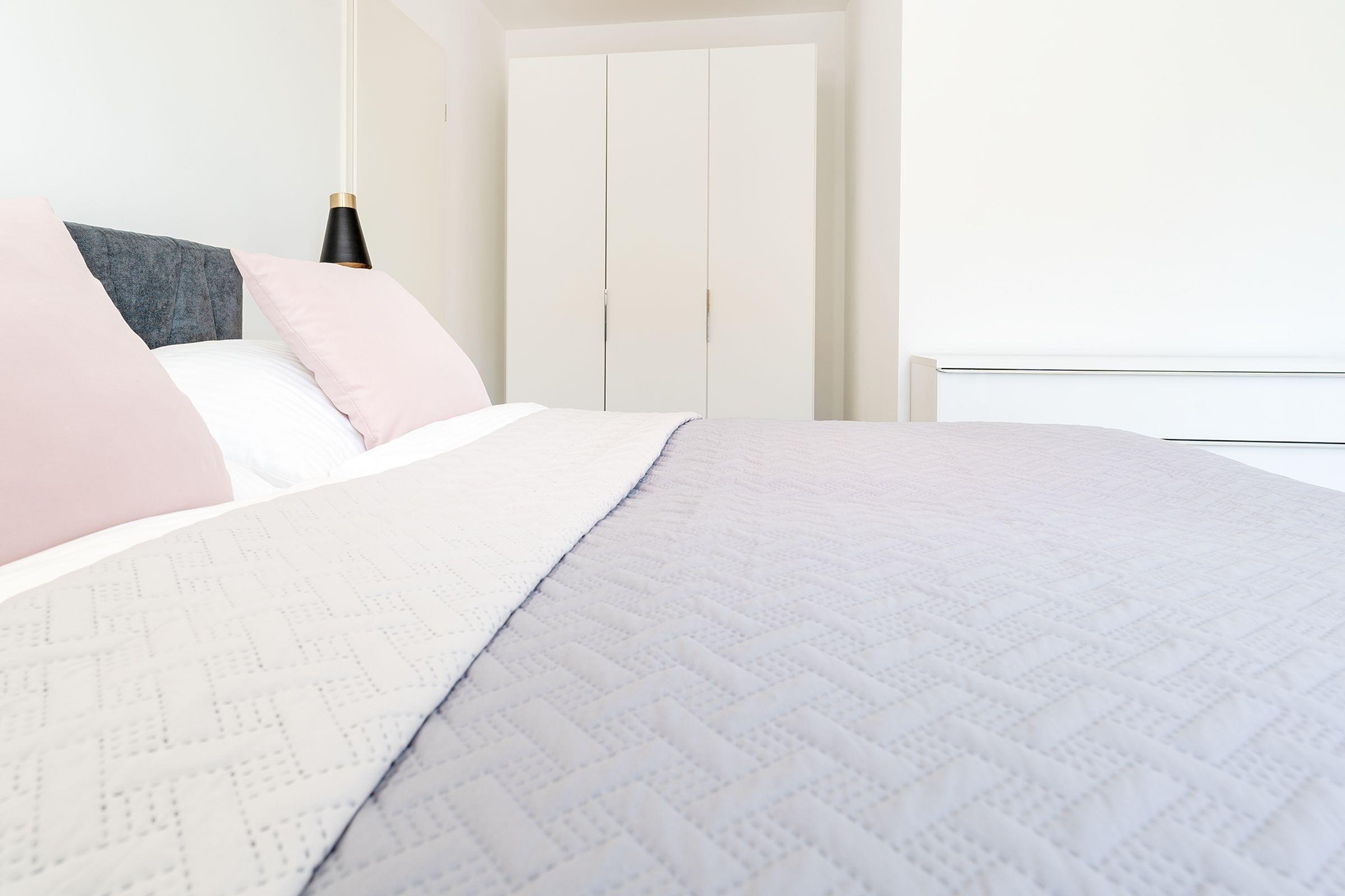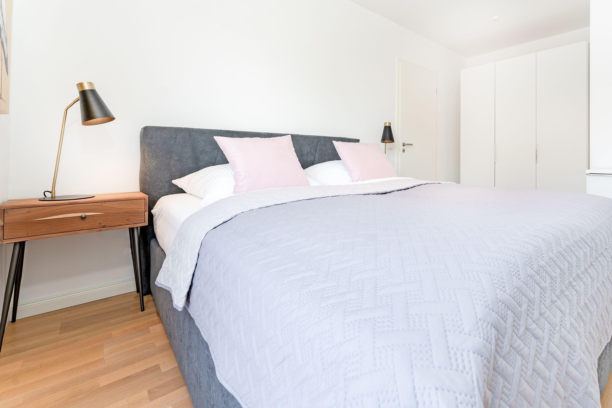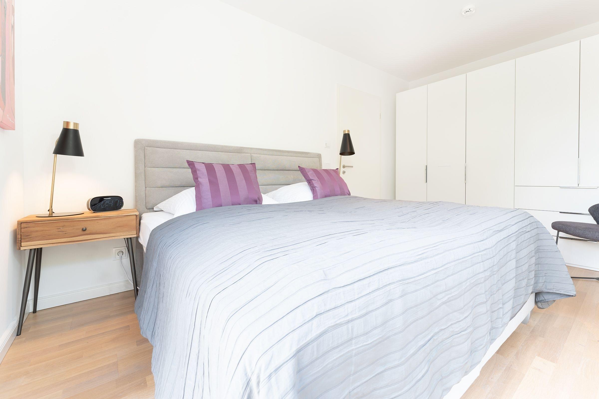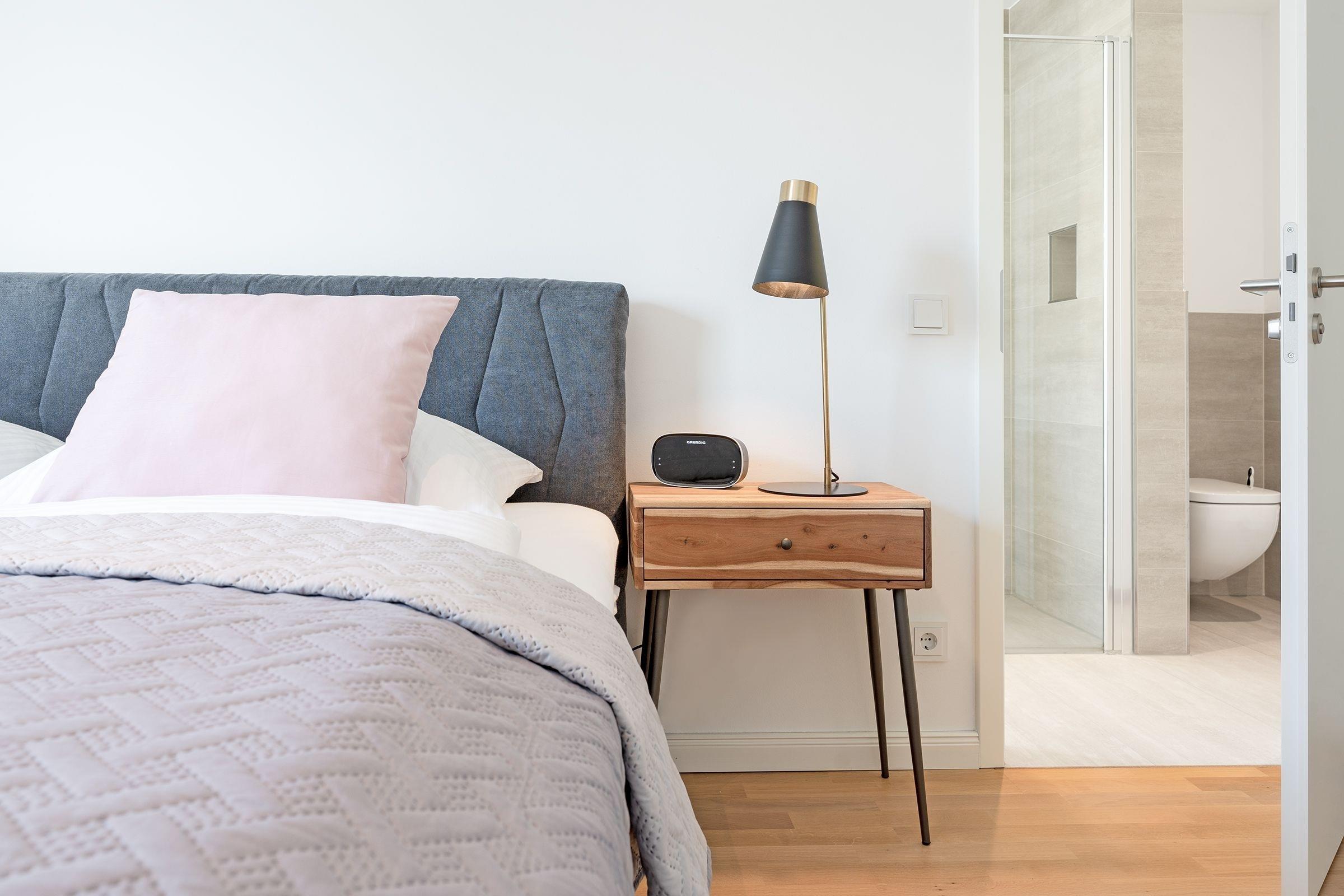 Schlafzimmer 1: 1 Doppelboxspringbett (180x200 cm), Kleiderschrank, Verdunkelung (Rollläden), Bad en suite, Platz für Kinderreisebett vorhanden