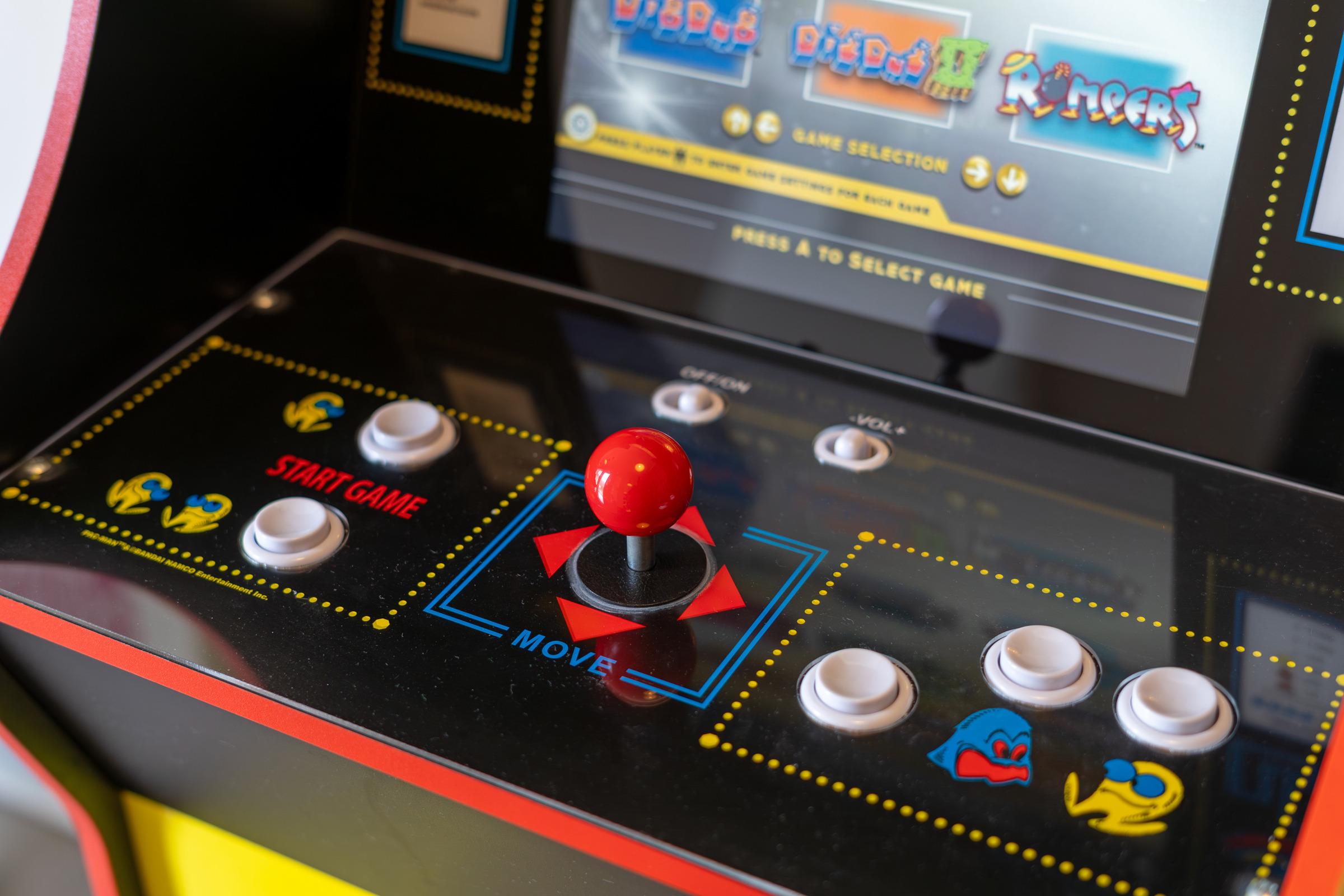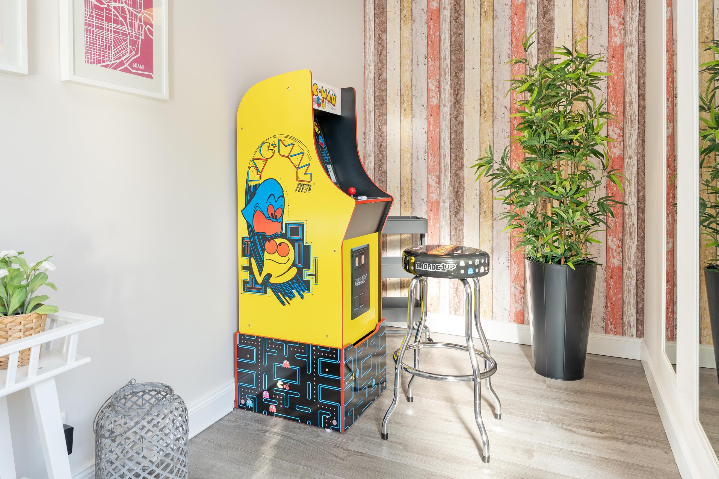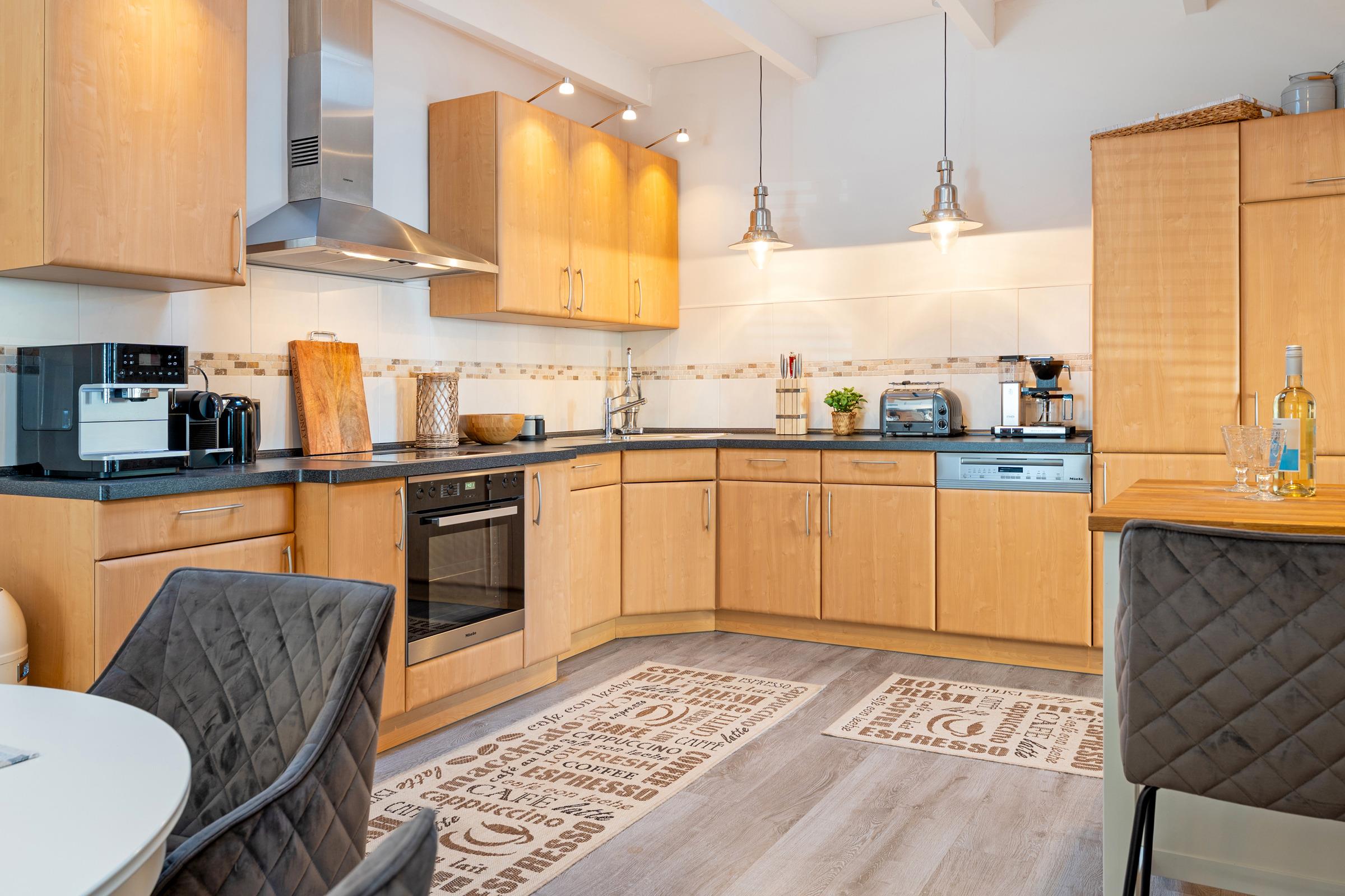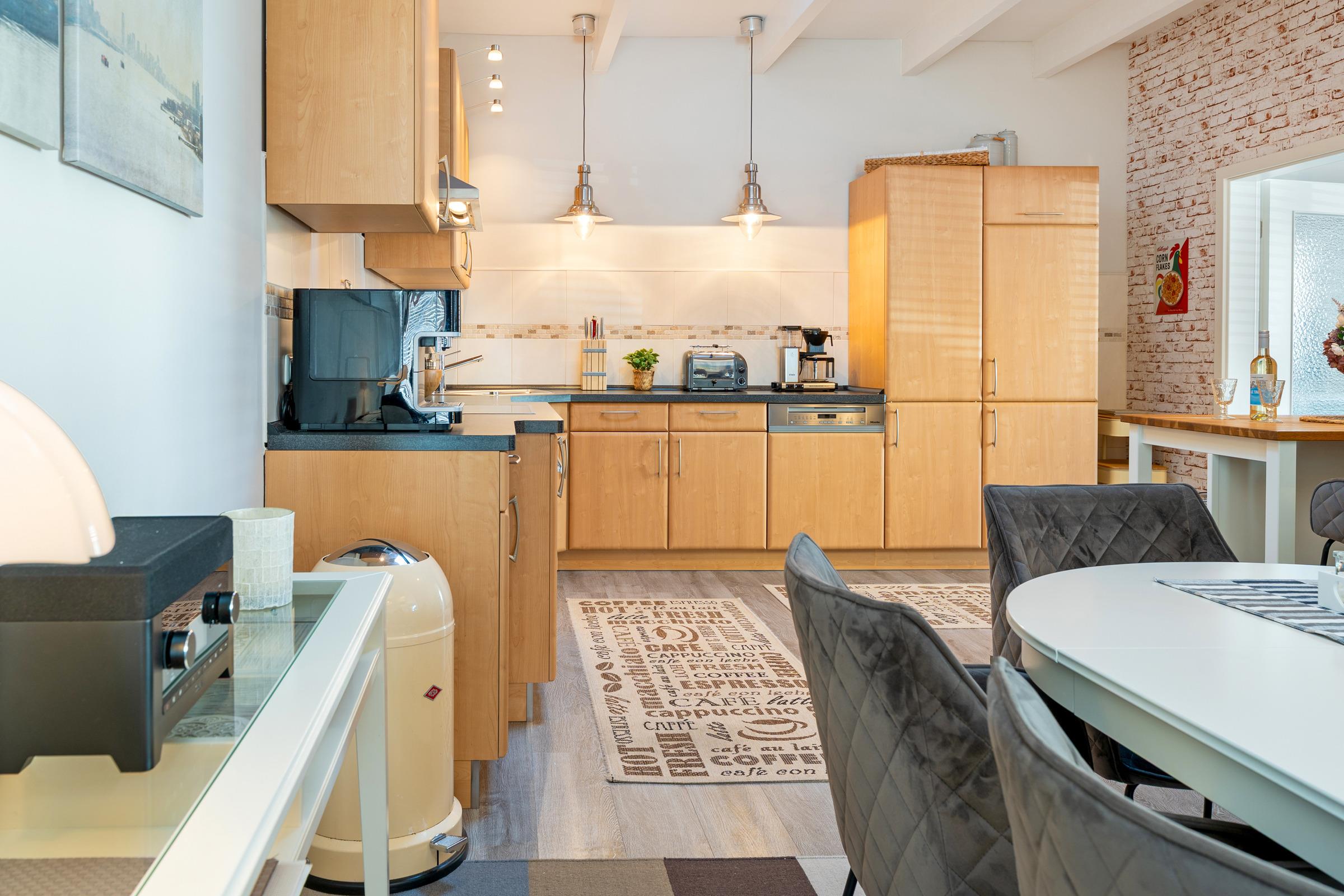 Die offene Küche ist umfassend ausgestattet und bietet mit Backofen, Herd, Geschirrspüler, Kühlschrank mit Gefrierfach, Kaffeemaschine sowie Toaster alles, was Sie für die Selbstversorgung benötigen. Direkt angrenzend befindet sich der Essbereich, an dem alle Gäste bequem Platz finden. Die Ferienwohnung verfügt über drei separate Schlafzimmer, jeweils mit komfortablen Doppelbetten, die erholsame Nächte garantieren. Für beste Unterhaltung sorgen ein Arcade-Spieleautomat, eine liebevoll gestaltete Kinderspielecke, eine Schallplatten- und Spielesammlung sowie Bücher, ergänzt durch einen Schallplattenspieler mit Marshall-Bluetooth-Box und insgesamt vier TVs im Wohnbereich und in den drei Schlafzimmern.