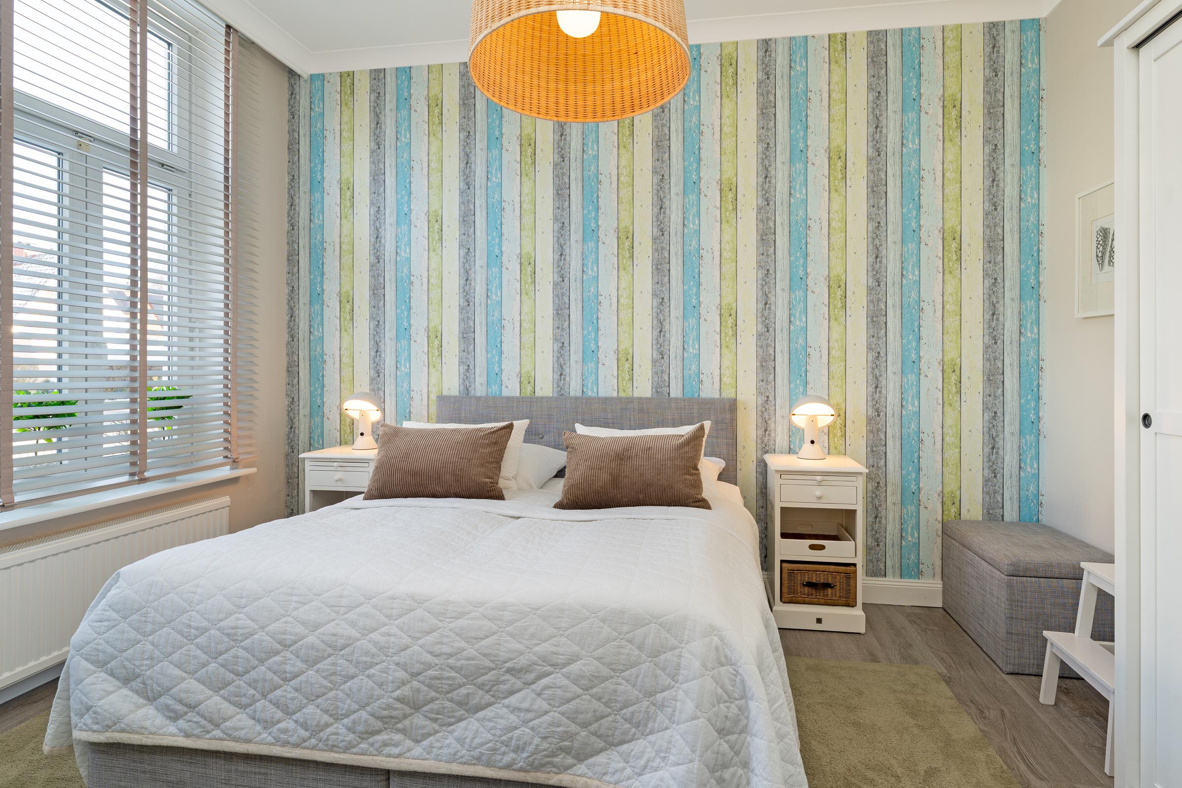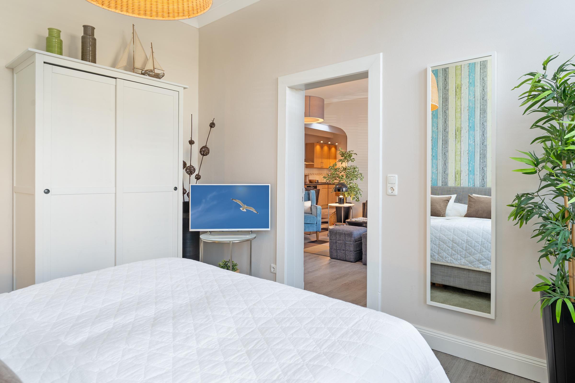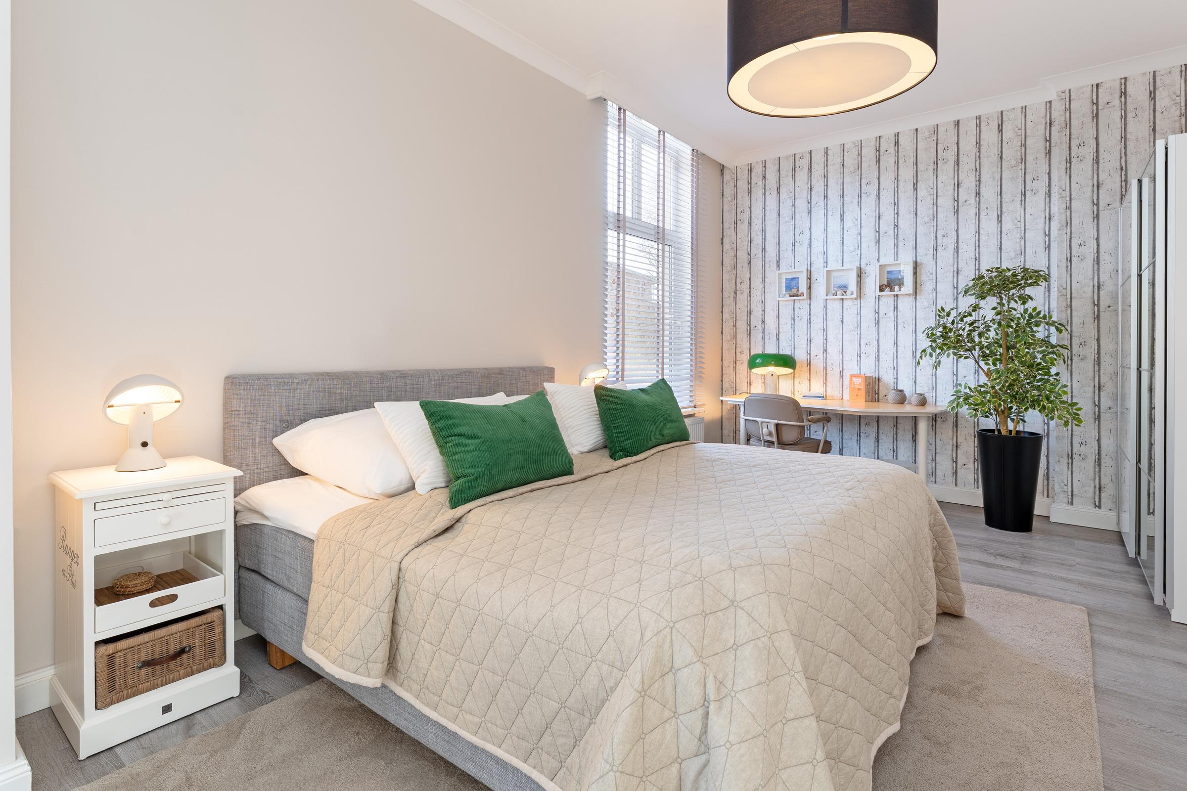 Schlafzimmer 1: 1 Boxspring-Doppelbett (180 x 200 cm) mit durchgehendem Topper, Kleiderschrank, TV, Verdunkelung: Jalousien, Platz für ein Babybett vorhanden