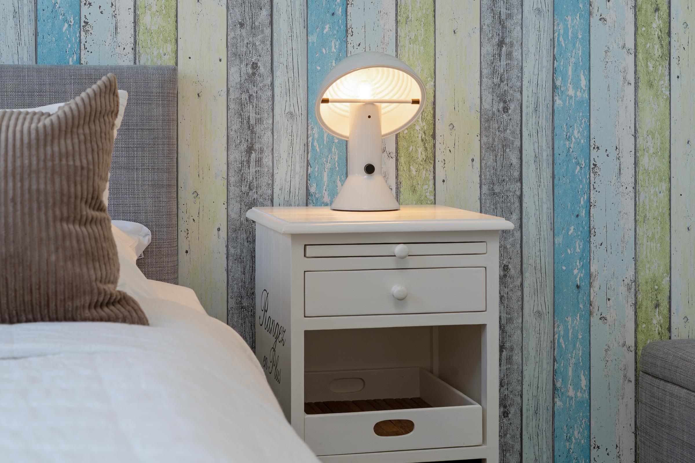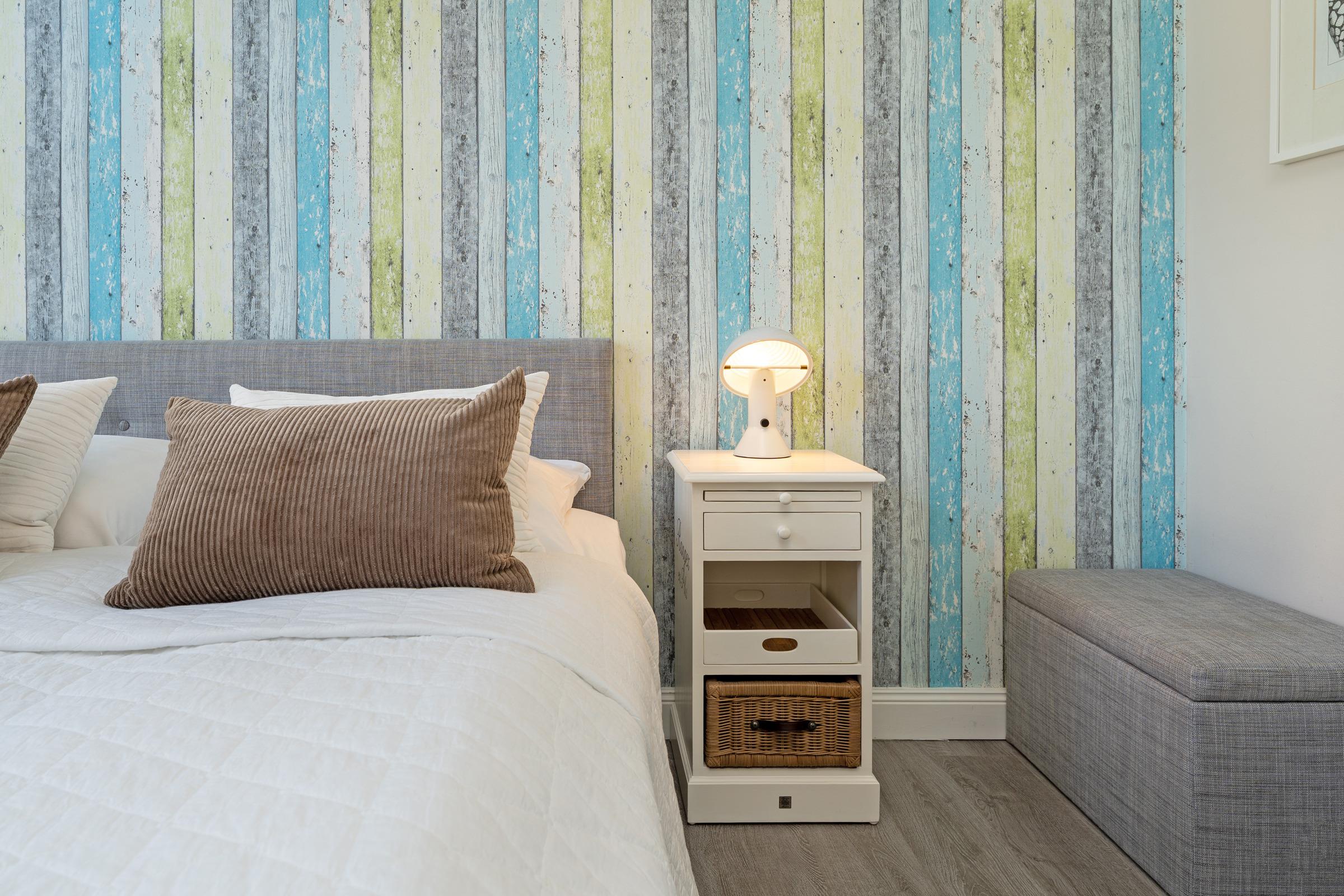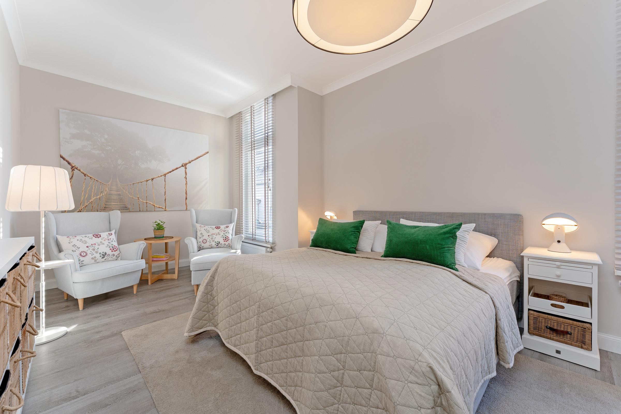 Schlafzimmer 1: 1 Boxspring-Doppelbett (180 x 200 cm) mit durchgehendem Topper, Kleiderschrank, TV, Verdunkelung: Jalousien, Platz für ein Babybett vorhanden