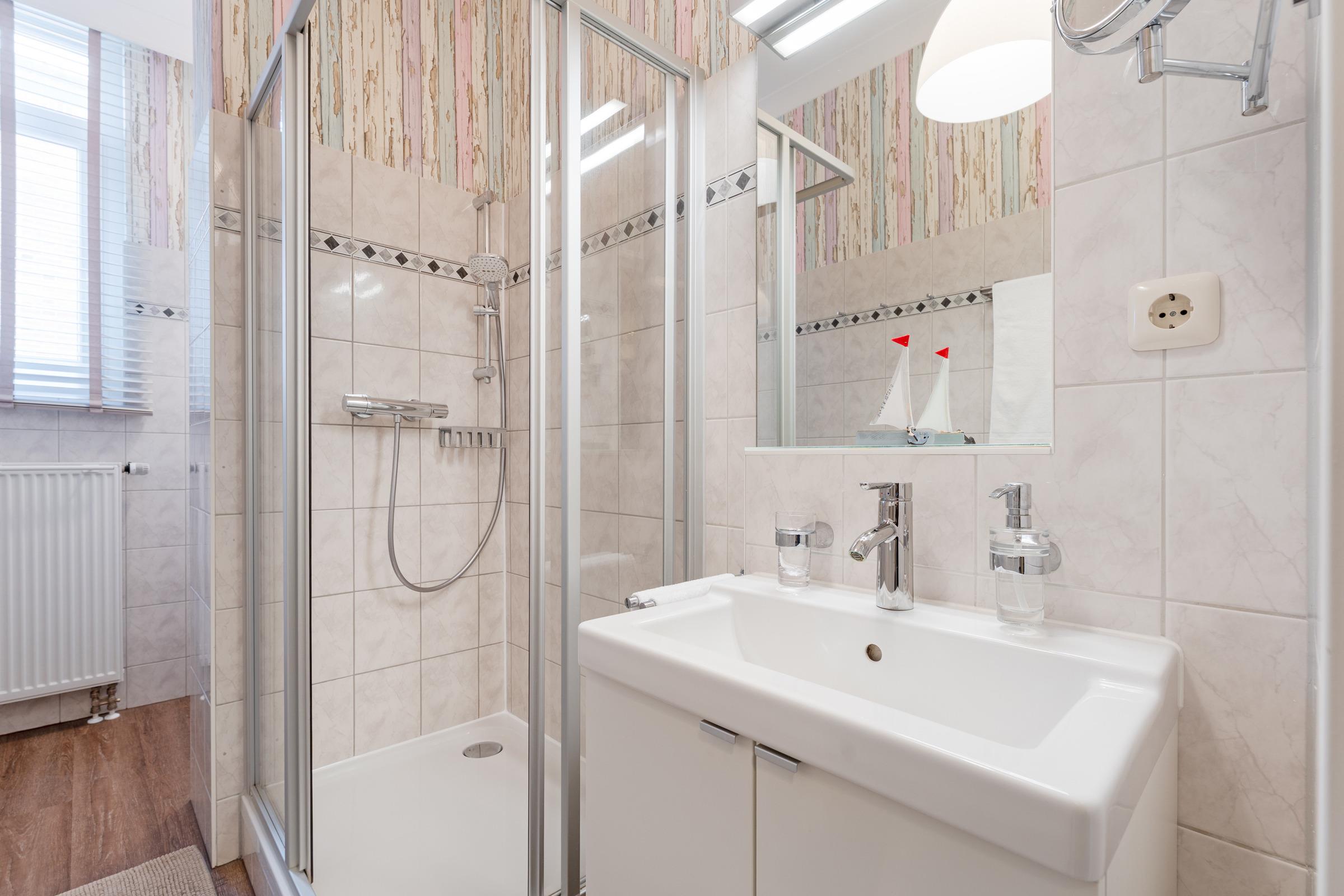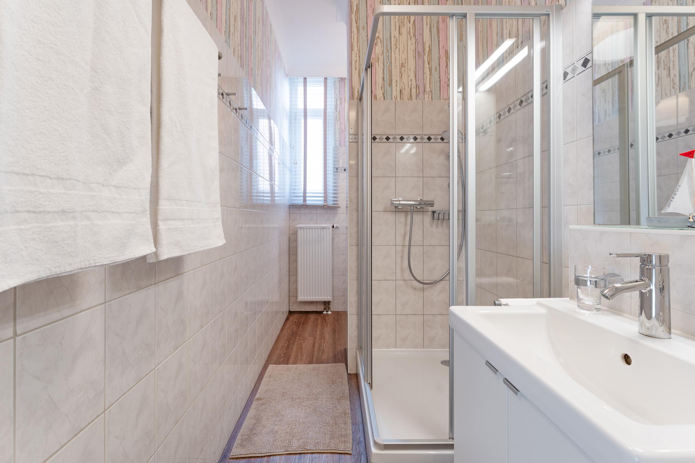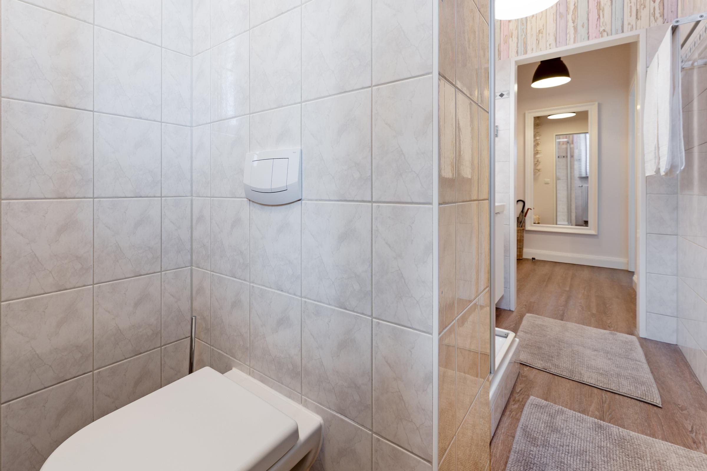 Das Badezimmer ist mit Dusche, WC und Haartrockner ausgestattet, zusätzlich steht ein separates Gäste-WC zur Verfügung. Für Familien ist ein Kinderreisebett inklusive.