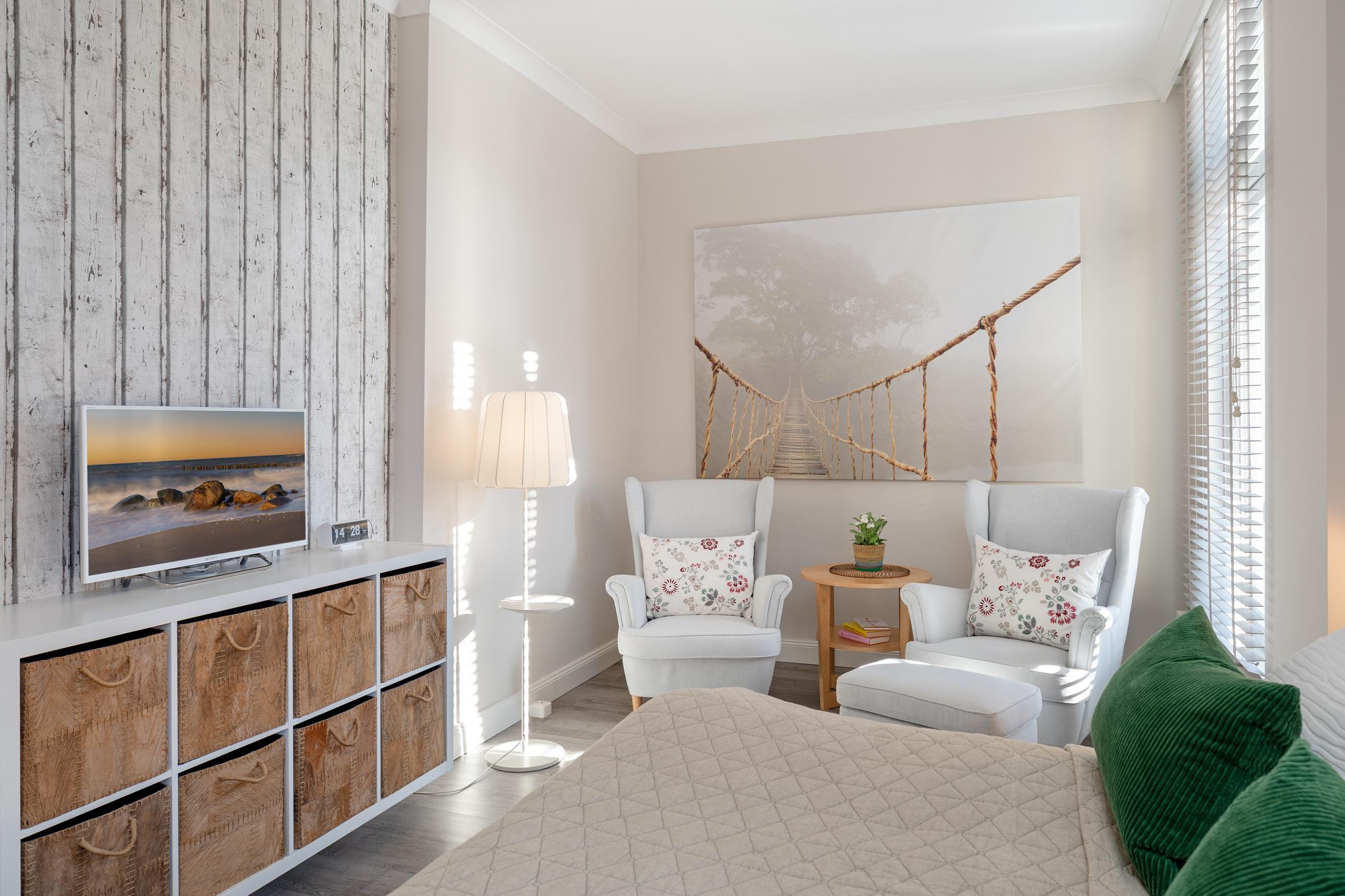 Schlafzimmer 2: 1 Boxspring-Doppelbett (180 x 200 cm) mit durchgehendem Topper, Kleiderschrank, TV, Verdunkelung: Jalousien, kein Platz für ein Babybett vorhanden