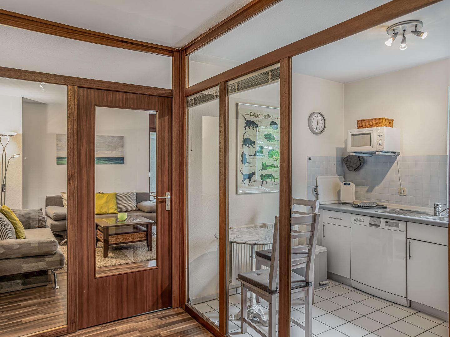 Dieses 2-Zimmer-Apartment im Hochparterre bietet auf ca. 53 m² eine komfortable und gut ausgestattete Unterkunft. Das Schlafzimmer ist mit einem Doppelbett ausgestattet, und das Duschbad verfügt über eine ebenerdige Dusche. Die Einbauküche mit 4-Platten-Herd, Backofen und Geschirrspüler lädt zum Kochen ein, während der separate Essbereich für gemütliche Mahlzeiten sorgt. Im Wohnzimmer stehen TV, Musikanlage und WLAN zur Verfügung. Ein Kinderreisebett ist ebenfalls vorhanden. Zum Entspannen lädt der Balkon ein. Waschmaschine und Trockner können im Keller genutzt werden, und ein PKW-Stellplatz rundet das Angebot ab. Der Strand ist nur ein kurzer Spaziergang entfernt.
