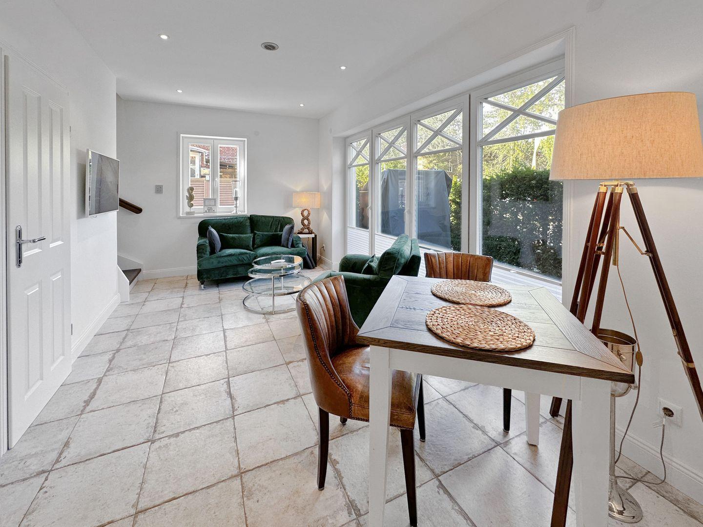 Dieses geschmackvoll eingerichtete 2-Zimmer-Apartment erstreckt sich über das Erdgeschoss und 1. Obergeschoss und bietet auf ca. 55 m² modernen Komfort. Die offene Einbauküche im Erdgeschoss ist mit einem 4-Platten-Ceranfeld, Backofen und Geschirrspüler ausgestattet und geht in das helle Wohn- und Esszimmer über. Im 1. Obergeschoss befindet sich das Schlafzimmer mit Doppelbett und TV sowie ein modernes Duschbad mit Regendusche. Eine kleine Terrasse mit Strandkorb lädt zum Entspannen ein. Das Apartment bietet ein besonders gutes Raumklima und ist daher besonders für Allergiker geeignet. WLAN und ein PKW-Stellplatz direkt am Haus sind ebenfalls vorhanden. Einkaufsmöglichkeit und Bäckersind gegenüber und der Naturstrand ist fußläufig erreichbar.
