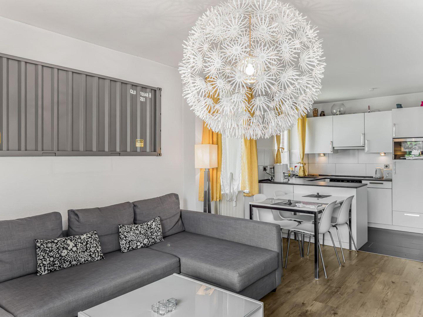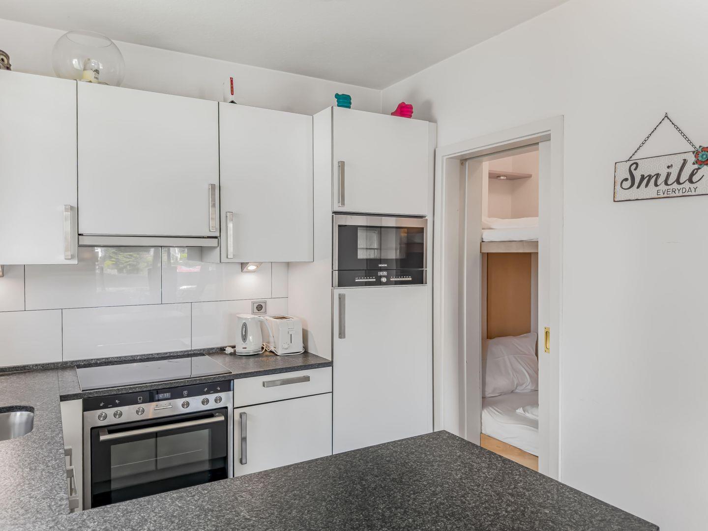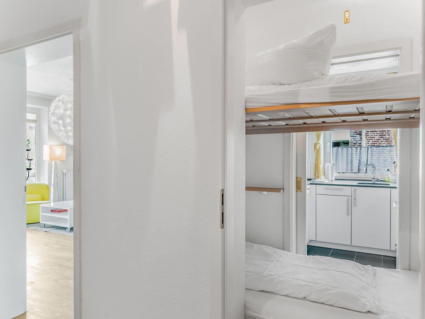 Eine abgetrennte Kajüte mit einem Hochbett für zwei Kinder sorgt dafür, dass die Schlafcouch im Wohnbereich nicht mehr umgebaut werden muss und das Wohnzimmer vollständig nutzbar bleibt. Der Balkon mit Blick in den Vorgarten lädt zum Entspannen ein, und die ruhige Lage sowie die Nähe zum Strand machen das Apartment besonders attraktiv.