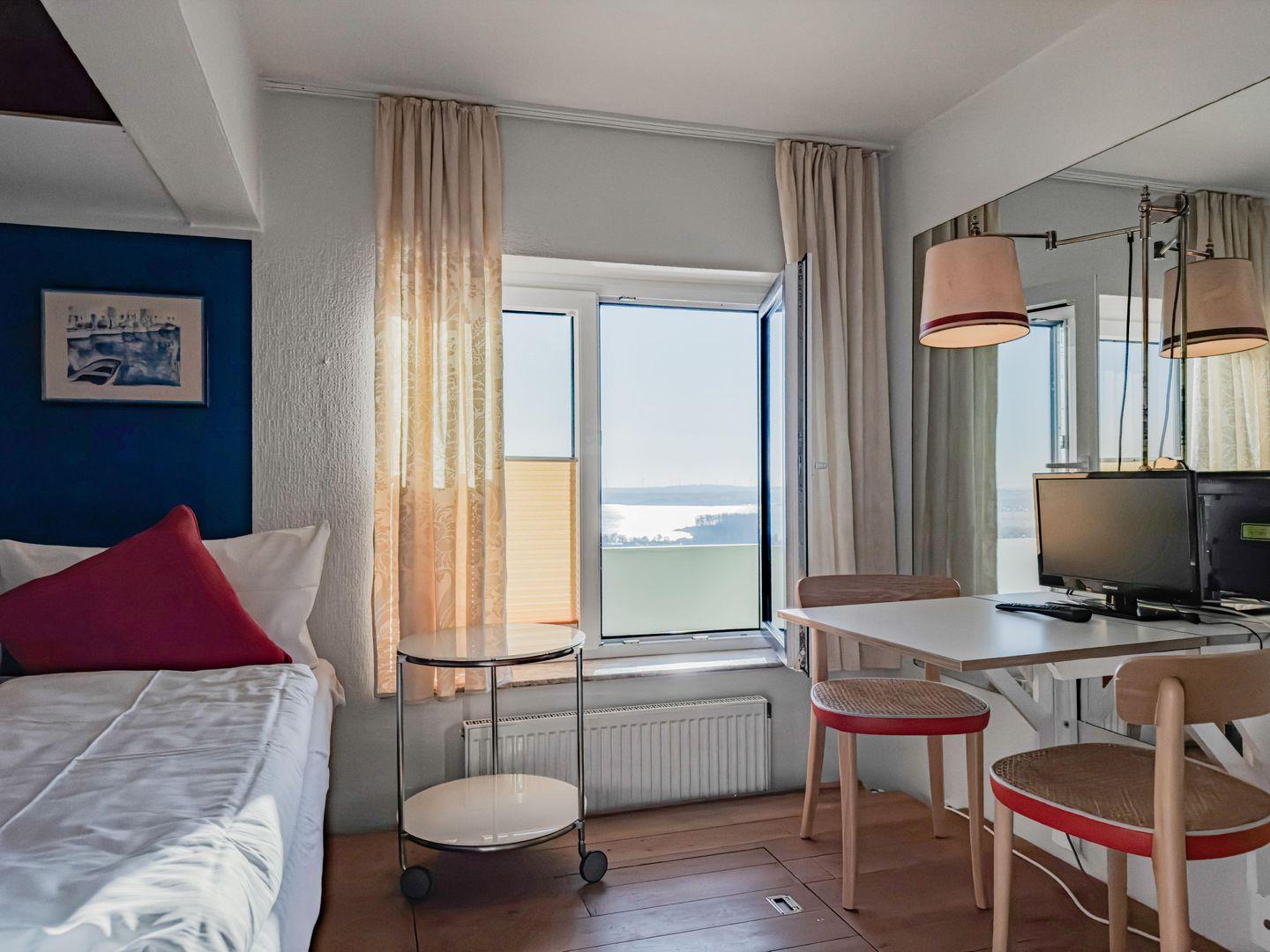 Gemütliches 1-Zimmer-Apartment in Travemünde mit Panoramablick auf die Trave und direkter Strandlage.