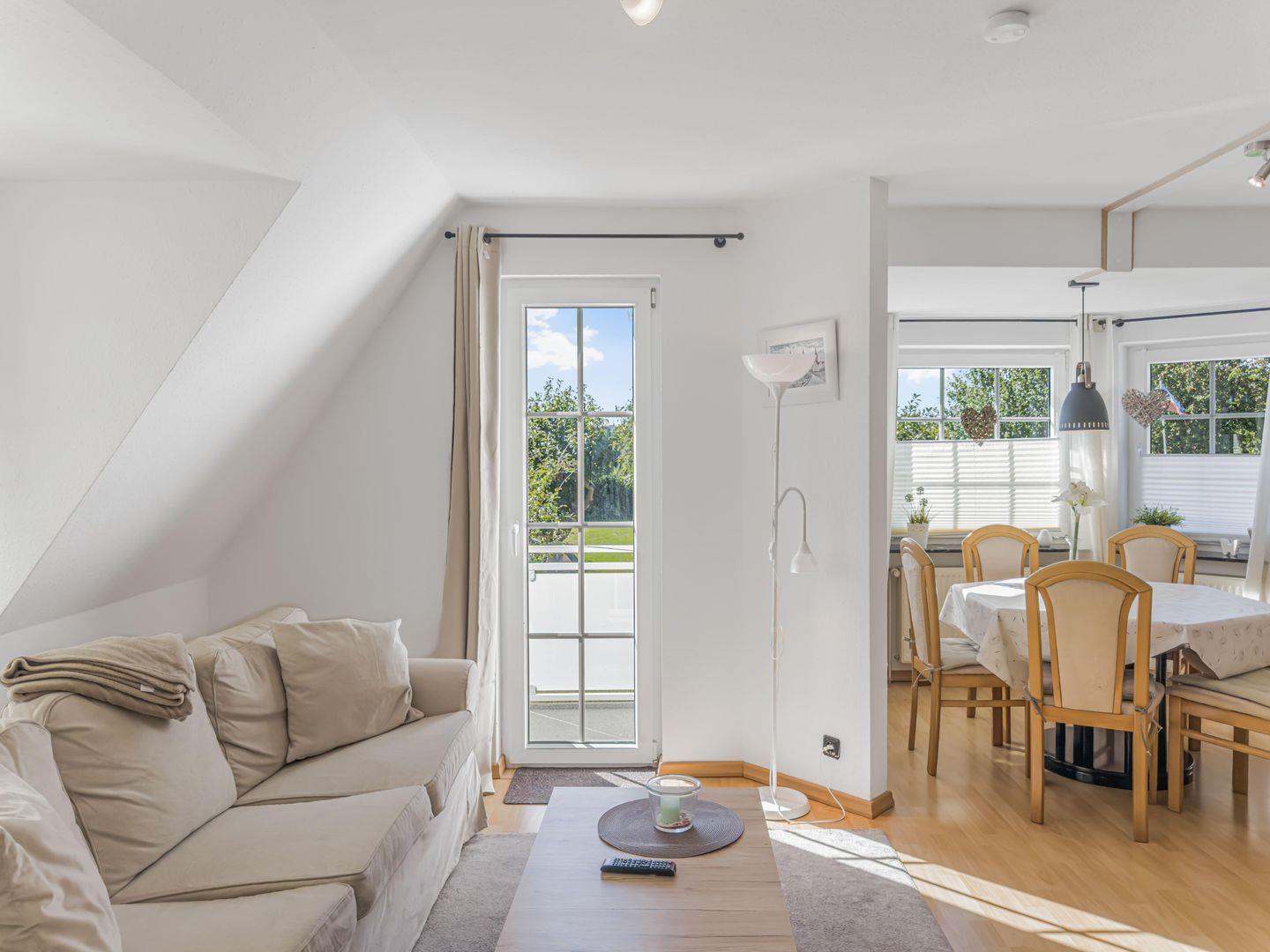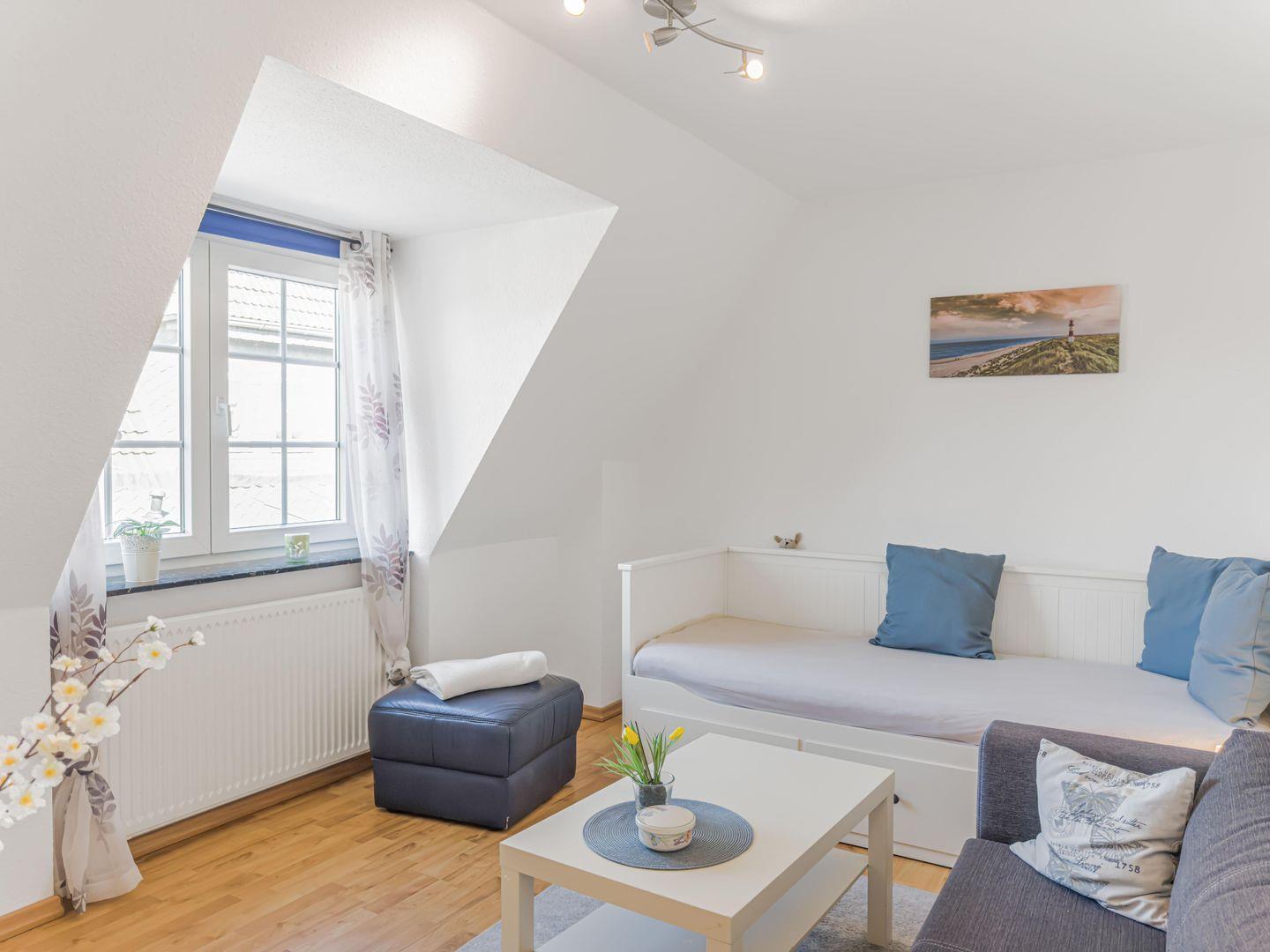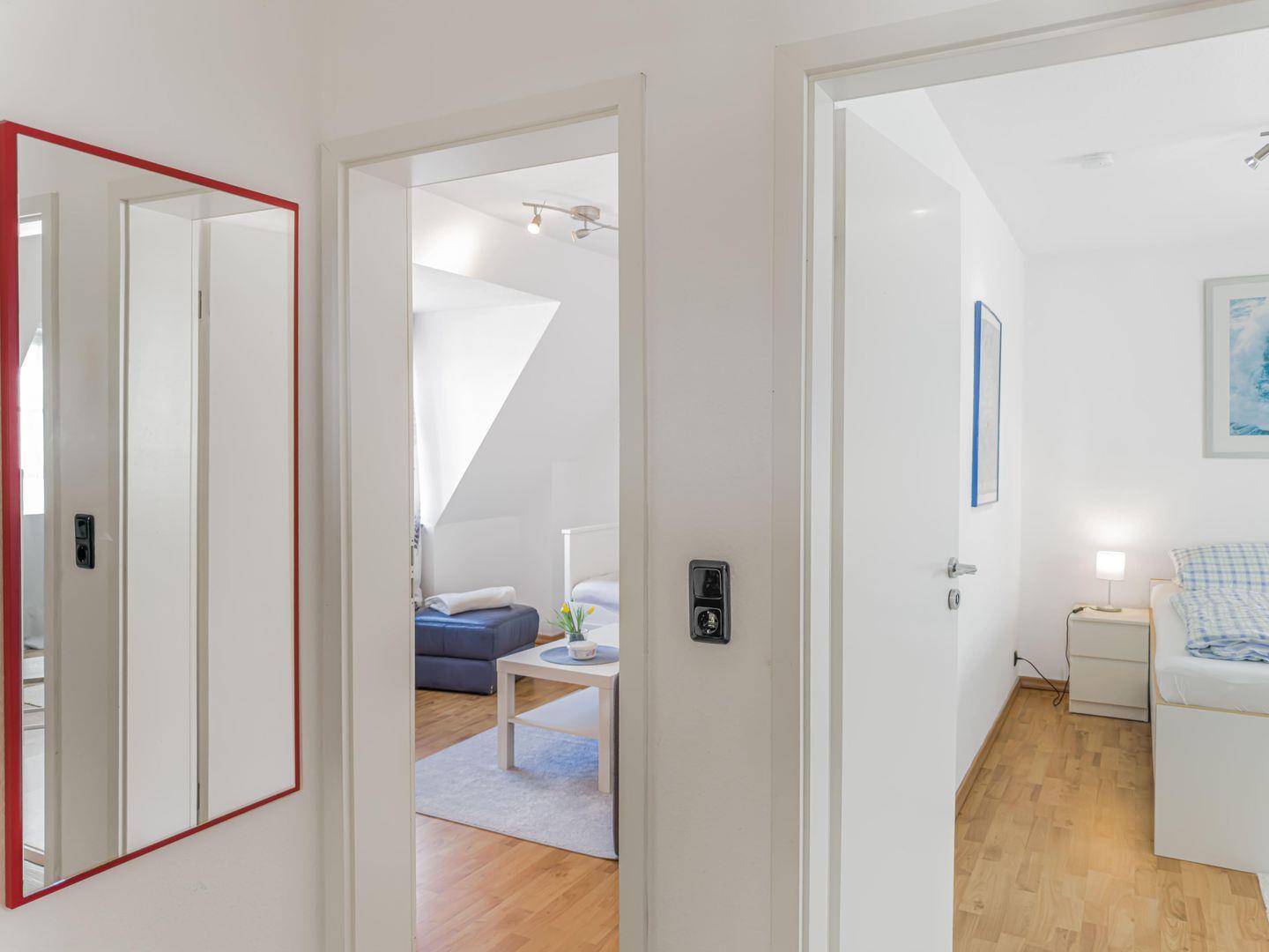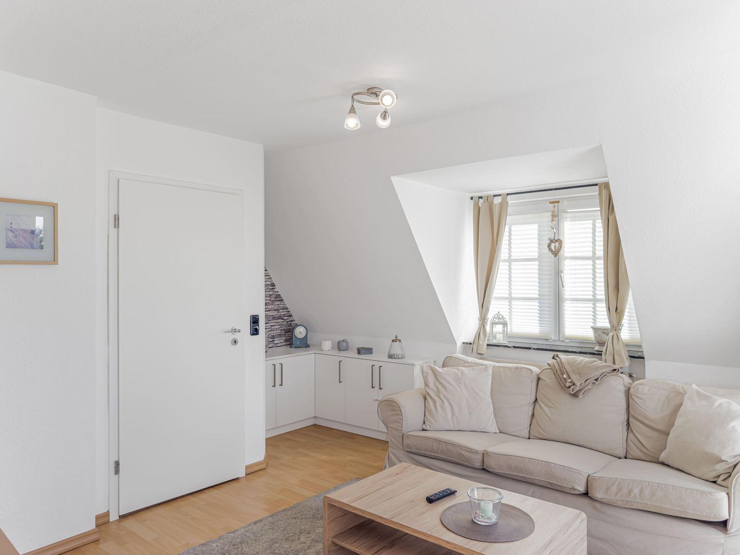 Dieses großzügige 4-Zimmer-Apartment erstreckt sich über das 1. Obergeschoss und das Dachgeschoss und bietet auf ca. 80 m² genügend Platz für einen erholsamen Aufenthalt. Die ruhige Lage macht es ideal für Familien oder kleine Gruppen. Einkaufsmöglichkeiten, der Hafen und das Zentrum sind in 10–15 Minuten bequem zu Fuß erreichbar, während Sie mit dem Fahrrad den Strand in nur 5–8 Minuten erreichen. Zwei Fahrräder stehen Ihnen kostenfrei zur Verfügung. Das Apartment kombiniert gemütliches Wohnen mit moderner Ausstattung und lädt nach einem Tag am Meer oder in der Stadt zum Entspannen ein.