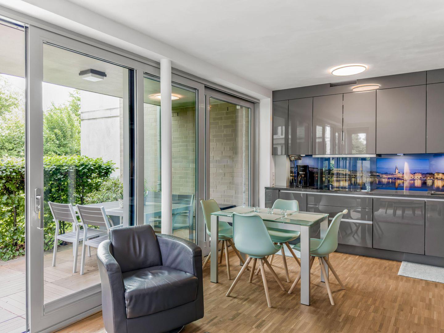 Dieses moderne 2-Zimmer-Apartment im Erdgeschoss (barrierefreier Zugang) bietet auf ca. 50 m² komfortablen Wohnraum. Es verfügt über ein Schlafzimmer mit einem großzügigen Doppelbett (2 x 2 m), ein Duschbad mit ebenerdiger Dusche sowie eine hochwertige, offene Einbauküche mit 4-Platten-Induktionsfeld, Backofen und Geschirrspüler. Der separate Essbereich und der gemütliche Wohnbereich mit Smart-TV und WLAN sorgen für entspannte Stunden. Genießen Sie die möblierte Ost-Terrasse und profitieren Sie von der ruhigen Lage mit hervorragender Anbindung an Bus und Bahn. Ein Fahrradkeller und ein Tiefgaragenstellplatz runden das Angebot ab.