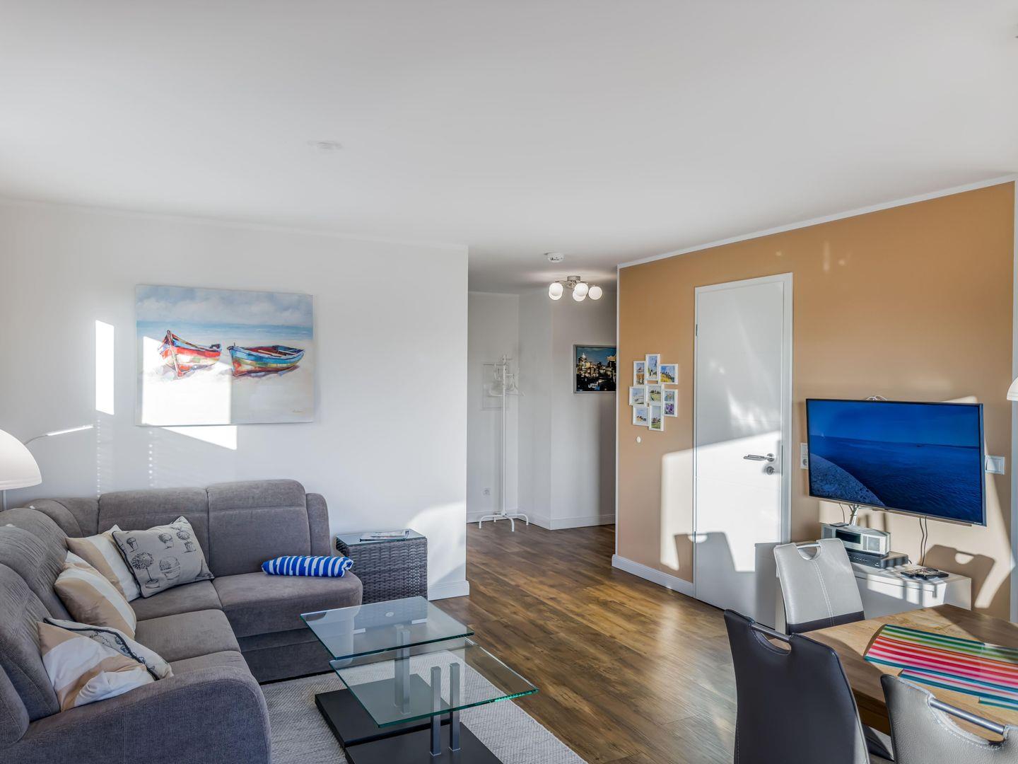 Willkommen in diesem modernen, hellen 2-Zimmer-Apartment im Herzen von Travemünde! Auf 58 m² finden Sie alles, was Sie für einen komfortablen Aufenthalt benötigen. Die Wohnung im 2. Obergeschoss (mit Fahrstuhl) bietet ein stilvolles Schlafzimmer mit einem großzügigen Doppelbett (1,80 m) sowie ein elegantes Duschbad mit Waschmaschine. Die exklusive Einbauküche ist voll ausgestattet, inklusive 4-Platten-Ceranfeld, Backofen und Geschirrspüler – ideal für alle, die gerne kochen. Im gemütlichen Wohnzimmer stehen Ihnen TV und WLAN zur Verfügung, und ein Fahrradraum im Untergeschoss bietet zusätzlichen Komfort für aktive Urlauber.