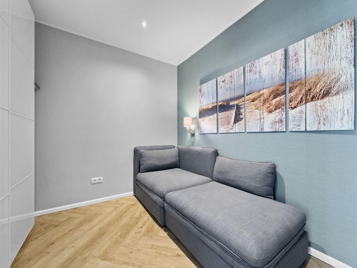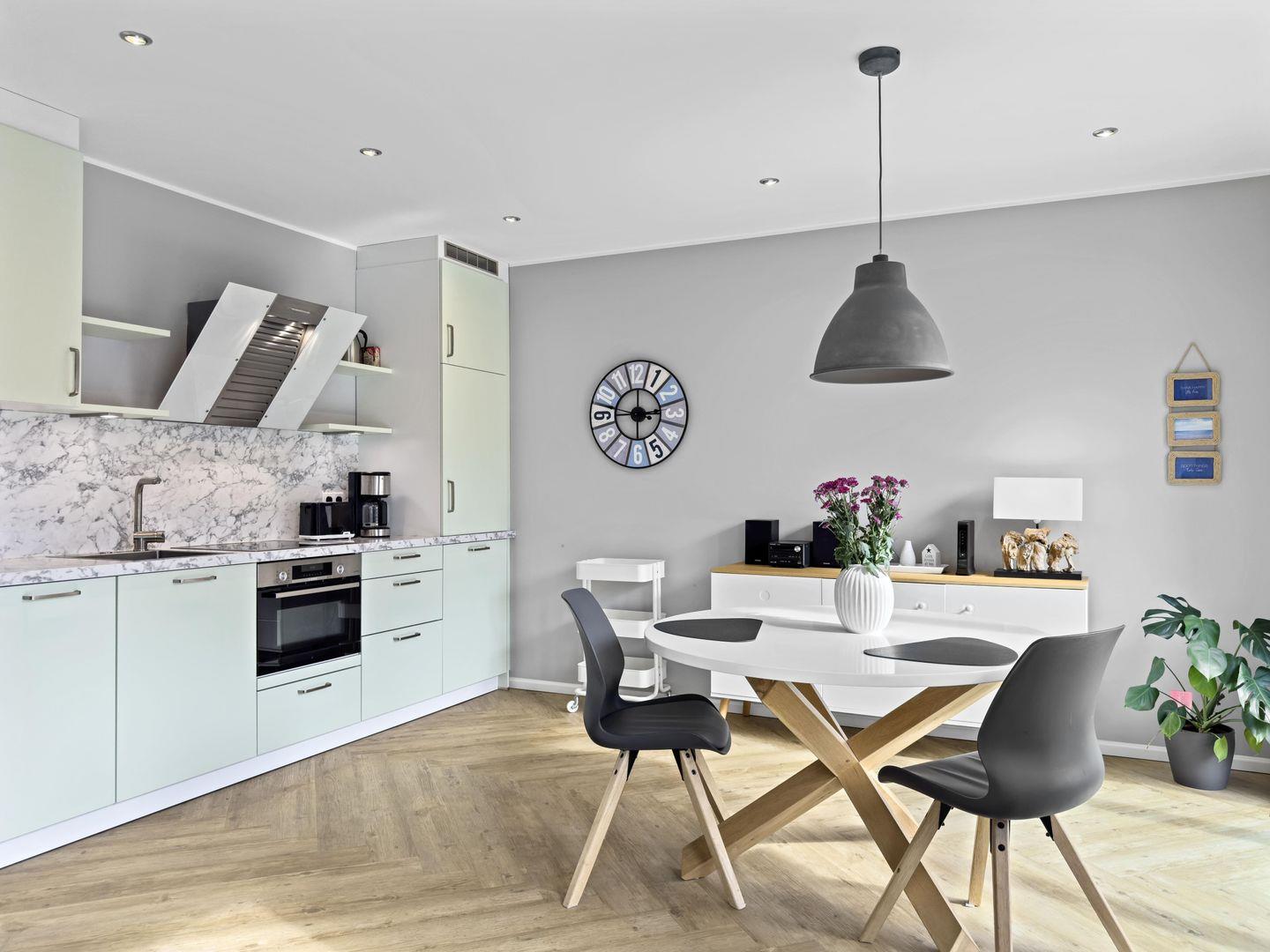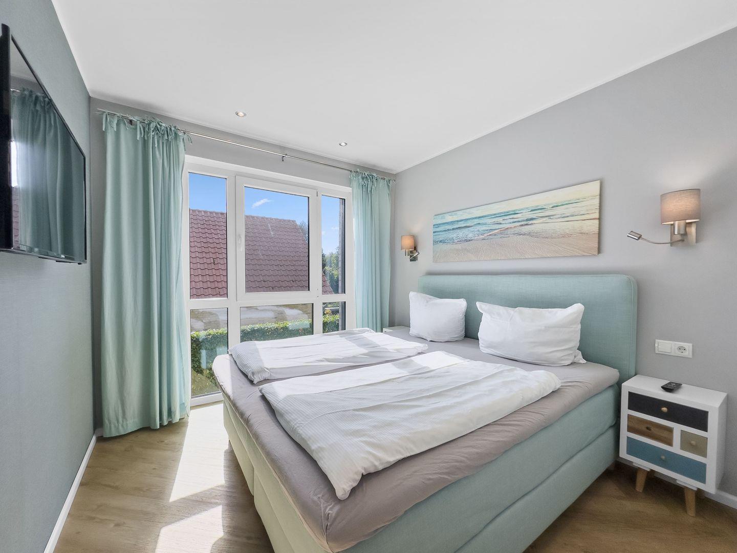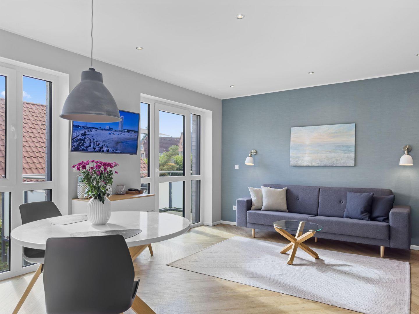 Dieses hochwertige 2,5-Zimmer-Apartment im ersten Obergeschoss bietet auf 56 m² alles, was Sie für einen entspannten Aufenthalt benötigen. Die Wohnung besticht durch eine stilvolle Einrichtung und liegt nur wenige Gehminuten vom Strand entfernt. Der lichtdurchflutete Wohn-Essbereich lädt mit bequemer Couch, Smart-TV und Musikanlage zum Verweilen ein. Die moderne Einbauküche ist bestens ausgestattet, inklusive eines 4-Platten-Ceranfelds und eines Backofens mit Mikrowellenfunktion. Im separaten Schlafzimmer sorgt ein Doppel-Boxspringbett mit getrennten Matratzen für hohen Schlafkomfort, und ein zusätzlicher Ankleideraum mit Schlafsessel bietet Platz für getrennt Schlafende. Ein besonderes Highlight ist der sonnige Südwest-Balkon – perfekt für entspannte Stunden im Freien. Das Apartment verfügt außerdem über ein modernes Duschbad mit bodenebener Regendusche und elektrische Außenjalousien, die ein komfortables Wohngefühl abrunden. Ein Carport für Ihr Fahrzeug und ein eigener Raum für Fahrräder stehen Ihnen ebenfalls zur Verfügung. Genießen Sie Ihren Urlaub in diesem exklusiven Apartment nahe dem Strand – ideal für alle, die Komfort und eine erstklassige Lage schätzen!