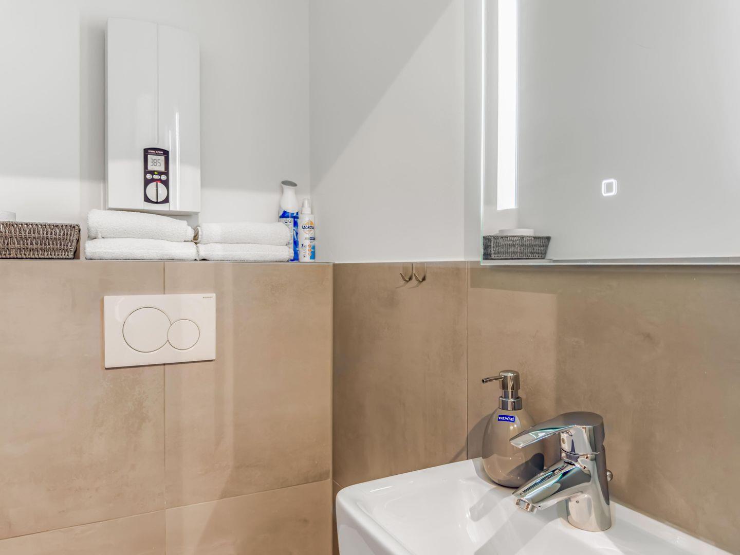 Die voll ausgestattete Küche verfügt über alles, was Sie für einen entspannten Aufenthalt benötigen – darunter ein Herd mit Backofen, Spülmaschine, Kühlschrank mit Gefrierfach, Kaffeemaschine, Toaster und Wasserkocher. Das separate WC und das moderne Badezimmer mit offener Dusche bieten zusätzlichen Komfort.