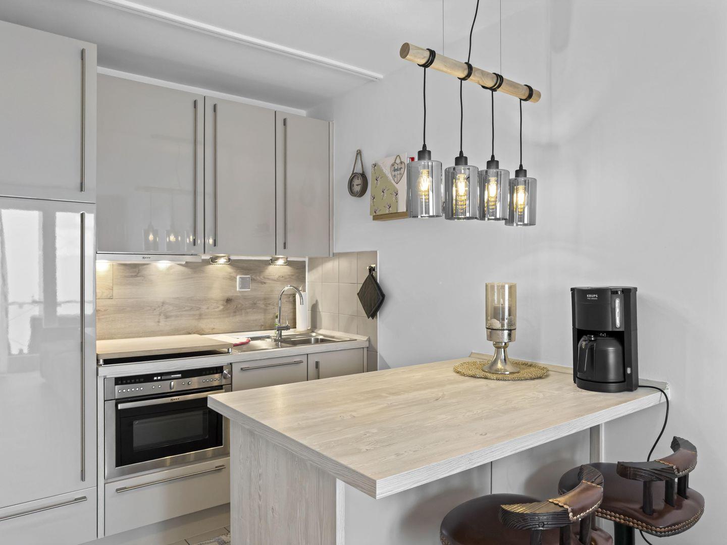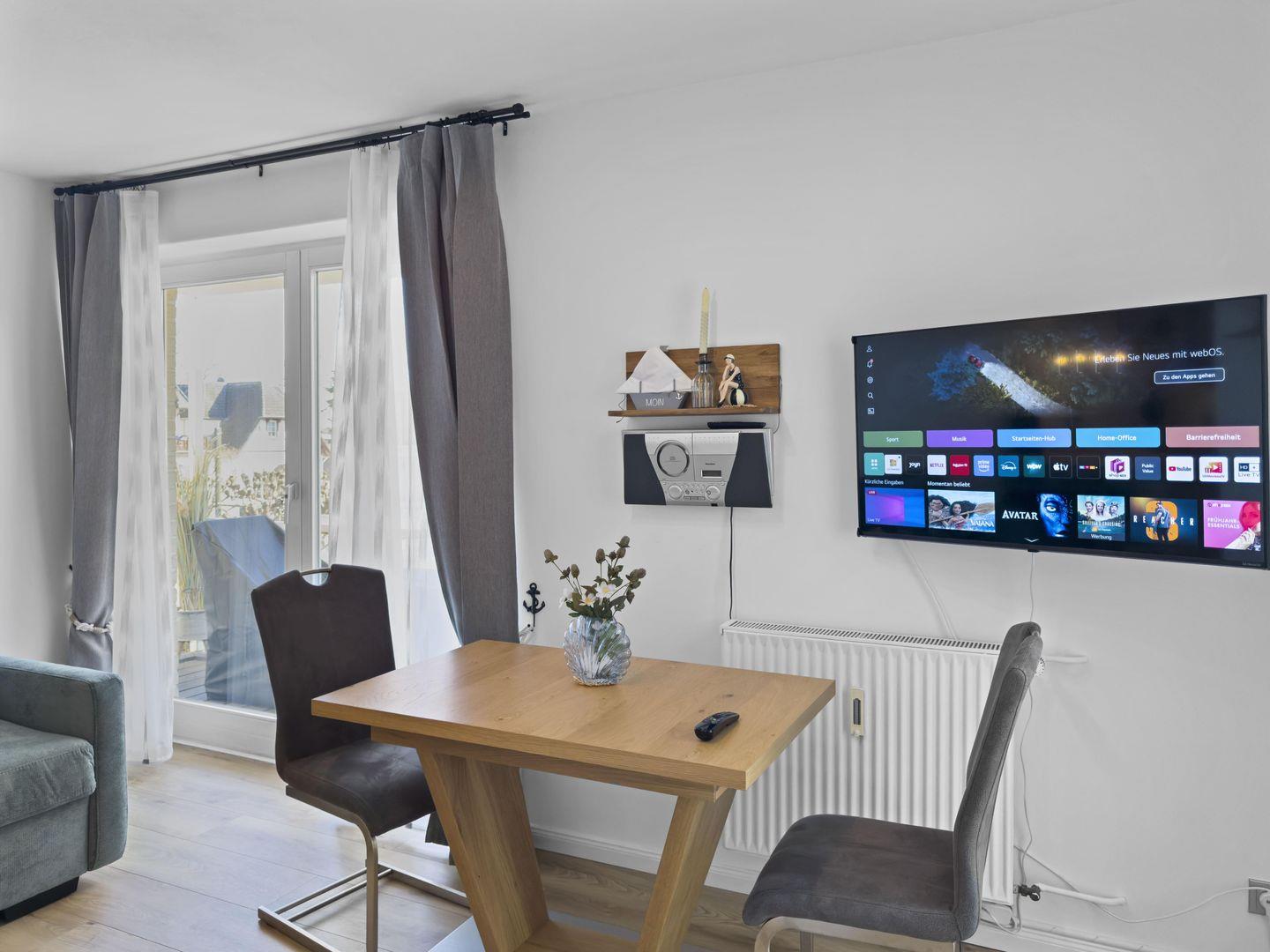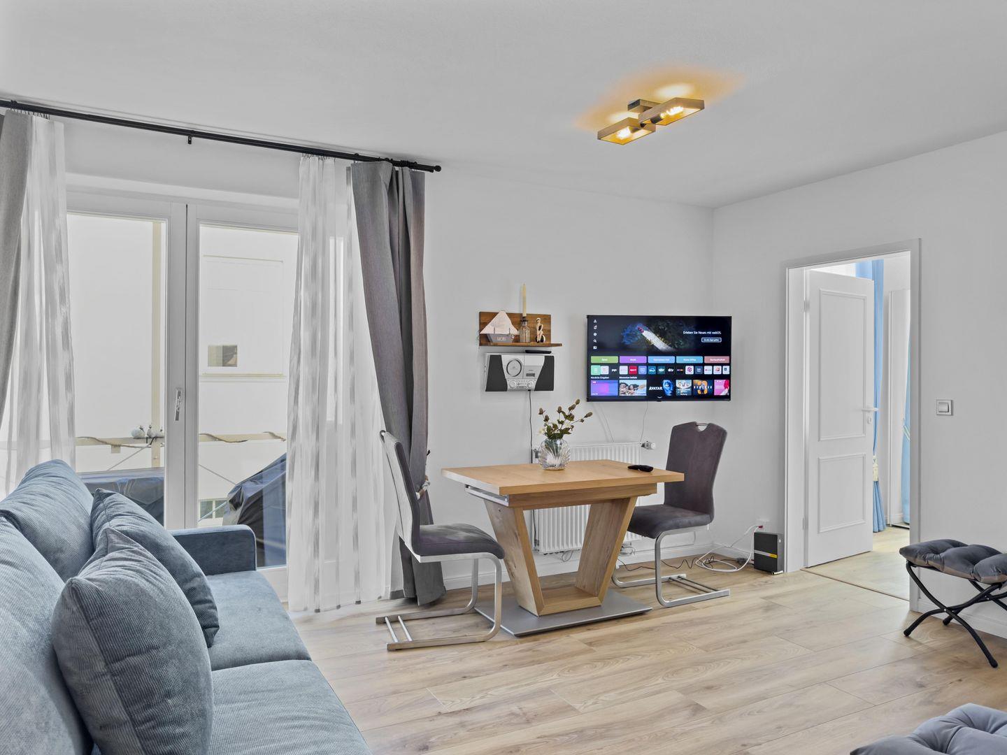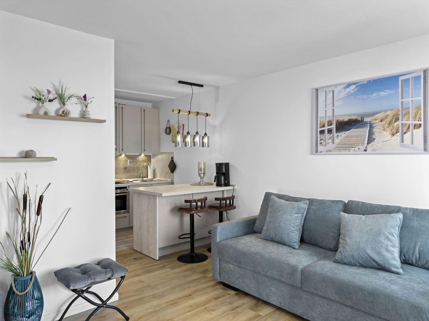 Dieses moderne 2-Zimmer-Apartment im 1. Obergeschoss überzeugt mit einer hochwertigen Einrichtung und einer erstklassigen Lage. Direkt gegenüber vom Strand gelegen, genießen Sie hier kurze Wege zum Meer. Der gemütliche Wohnbereich mit Schlafcouch und TV lädt zum Entspannen ein, während die offene Küche mit separatem Essplatz für Komfort sorgt. Das Schlafzimmer mit zwei Einzelbetten bietet erholsame Nächte. Auf dem möblierten Balkon mit Liegefunktion können Sie die frische Meeresluft genießen. Ein Tiefgaragenstellplatz (Hubgarage, nicht für große PKW) und ein Fahrradraum runden das Angebot ab.