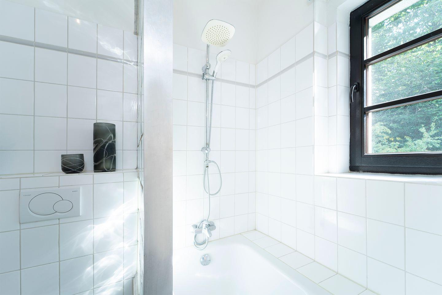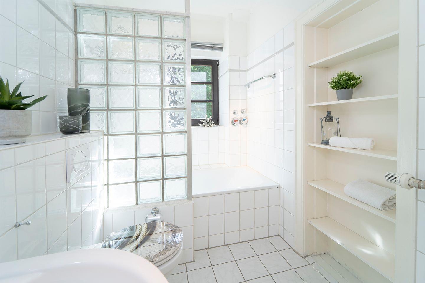 Im Badezimmer findest Du eine Badewanne mit Duschabtrennung vor. Das Bad ist gefliest und das eingebaute Regal bietet viel Stauraum.