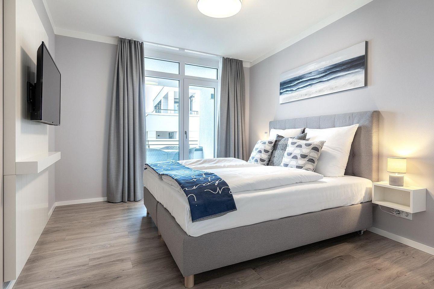 Im separaten Schlafzimmer erwartet Sie ein modernes Boxspringbett, das für erholsamen Schlaf sorgt. Auch hier steht Ihnen ein eigener Flatscreen-TV zur Verfügung – ideal für entspannte Stunden mit Ihrer Lieblingsserie.