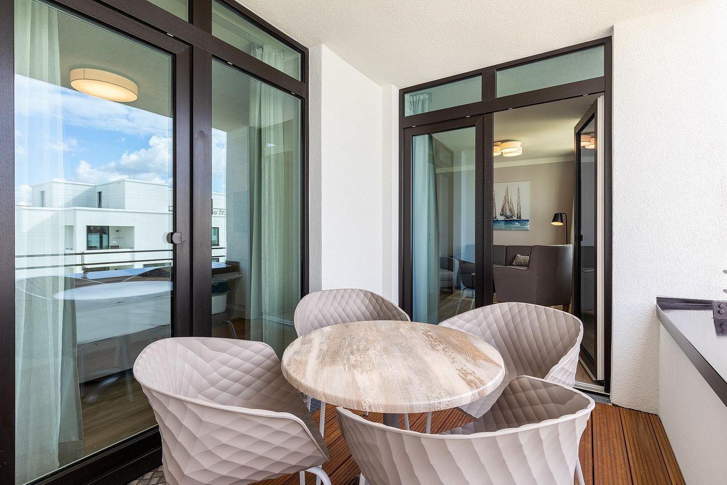 Ein besonderes Highlight ist die überdachte Loggia in sonniger Westausrichtung, die Ihnen den ganzen Tag über Sonne und frische Ostseeluft schenkt. Genießen Sie hier Ihr Frühstück im Freien, entspannen Sie bei einem guten Buch oder lassen Sie den Tag bei einem Glas Wein in der Abendsonne ausklingen. Die Loggia ist sowohl vom Wohnbereich als auch vom Schlafzimmer aus zugänglich und mit bequemen Gartenmöbeln ausgestattet – perfekt für entspannte Stunden unter freiem Himmel.