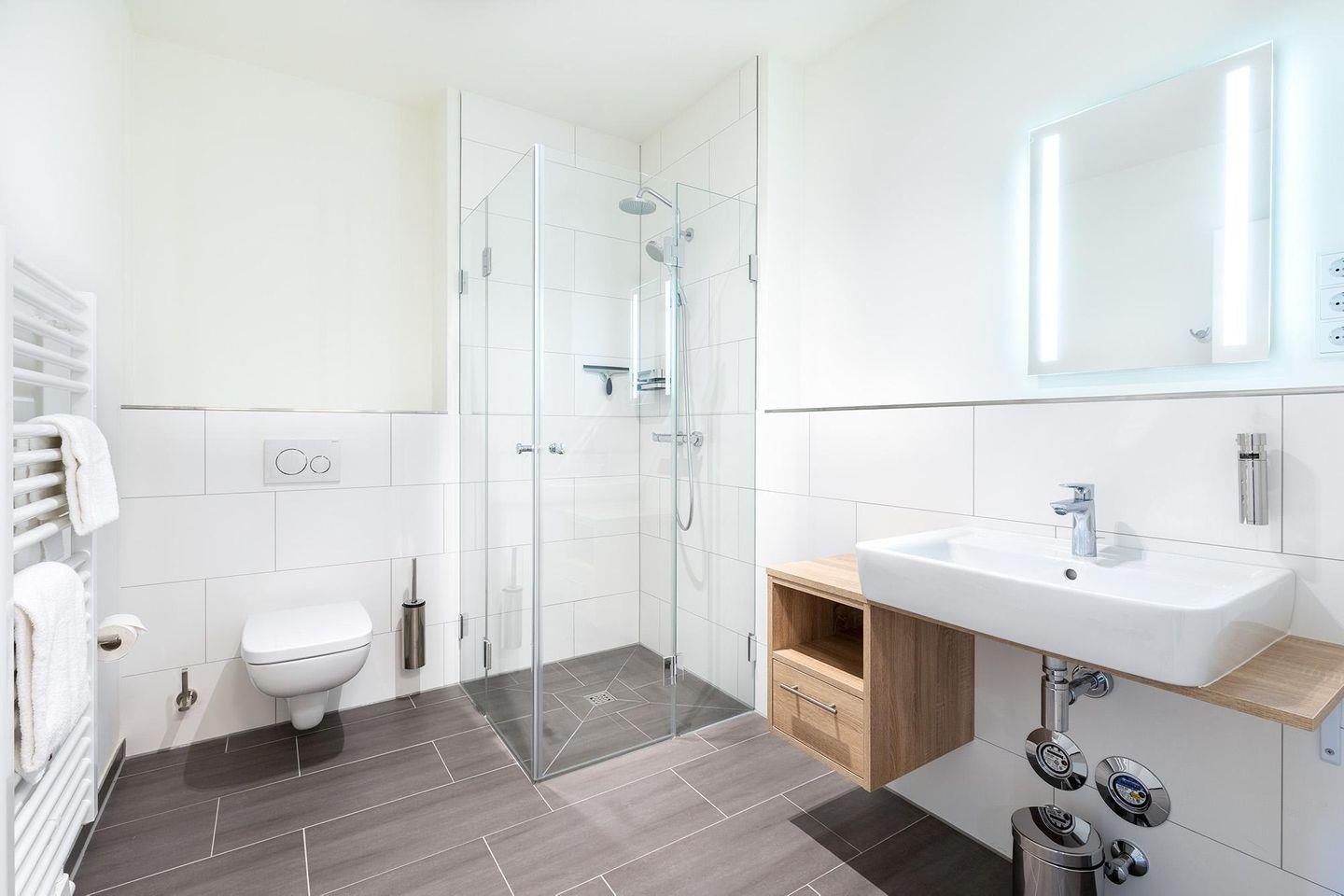 Im separaten Schlafzimmer erwartet Sie ein hochwertiges Boxspringbett für erholsame Nächte sowie ein weiterer SMART-TV. Das stilvoll eingerichtete Badezimmer bietet eine ebenerdige Regendusche, ein WC, einen Kosmetikspiegel, Handtuchheizkörper, Föhn und natürlich Fußbodenheizung.