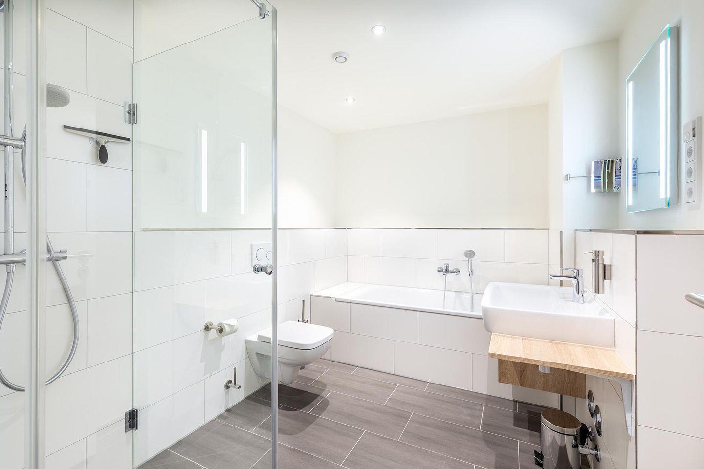 Das Badezimmer verfügt über WC, Waschbecken, Spiegel und Kosmetikspiegel, Haartrockner sowie eine bodengleiche Dusche; zusätzlich ist eine Badewanne vorhanden. Bettwäsche, Handtücher und eine Erstausstattung sind inklusive. Waschmaschine und Trockner stehen gemeinschaftlich zur Nutzung bereit.