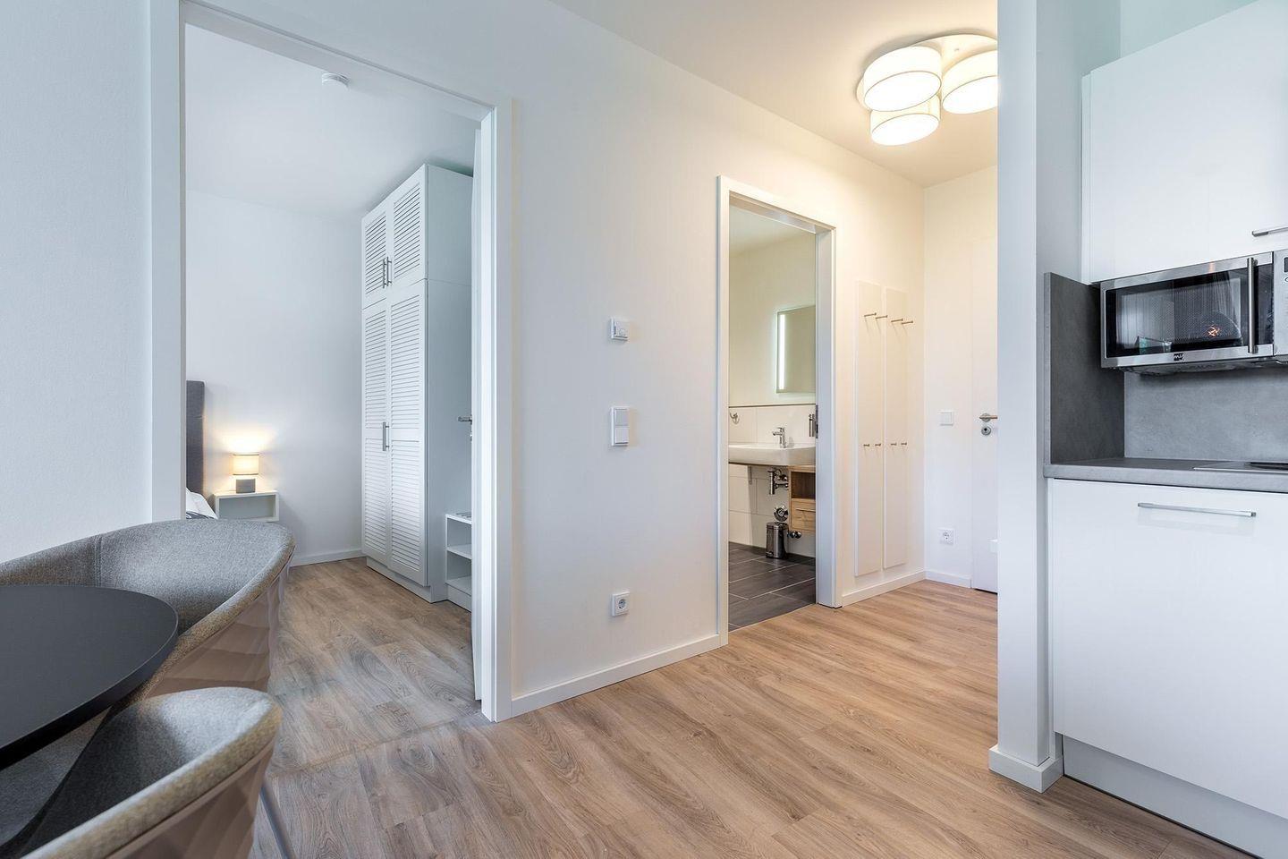 Das helle Apartment ist modern und hochwertig ausgestattet. Große bodentiefe Fenster mit Sonnenschutzverglasung sorgen für viel Tageslicht und ein angenehmes Raumklima. Die Fußbodenheizung schafft dabei zu jeder Jahreszeit eine behagliche Wohlfühlatmosphäre.