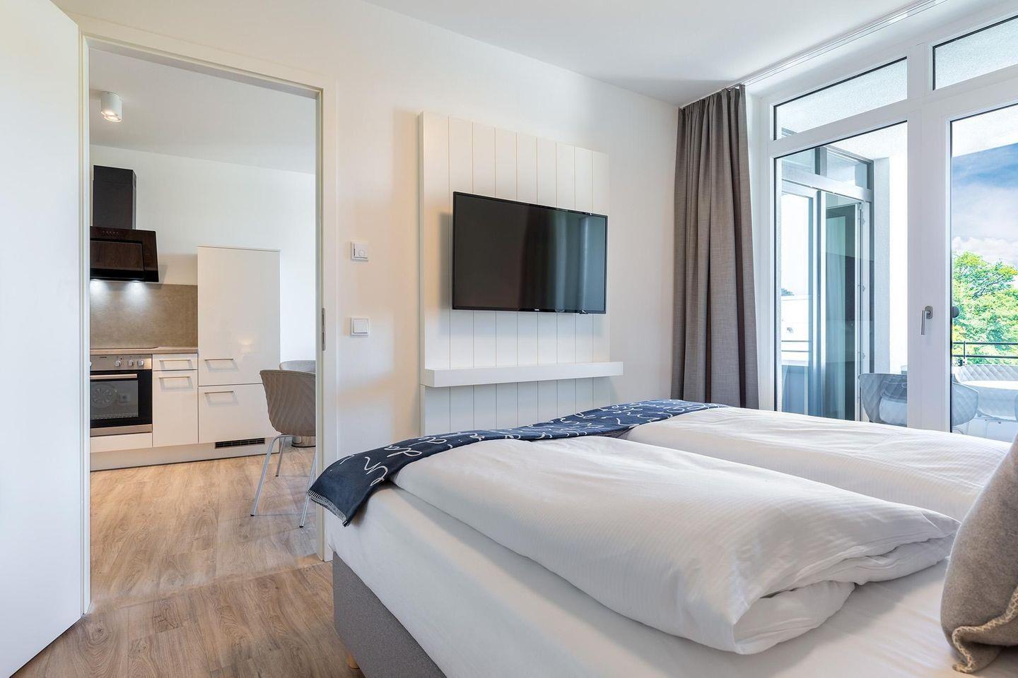 Im separaten Schlafzimmer schlafen Sie traumhaft auf einem hochwertigen Boxspringbett. Auch hier steht Ihnen ein weiterer Flatscreen-TV zur Verfügung – für entspannte Abendstunden in privater Atmosphäre. Das stilvolle Badezimmer ist mit einer ebenerdigen Dusche, WC, Waschtisch mit Föhn, Kosmetikspiegel, Handtuchheizkörper und ebenfalls Fußbodenheizung ausgestattet – damit Sie jeden Tag mit einem Hauch von Wellness beginnen oder beenden können.