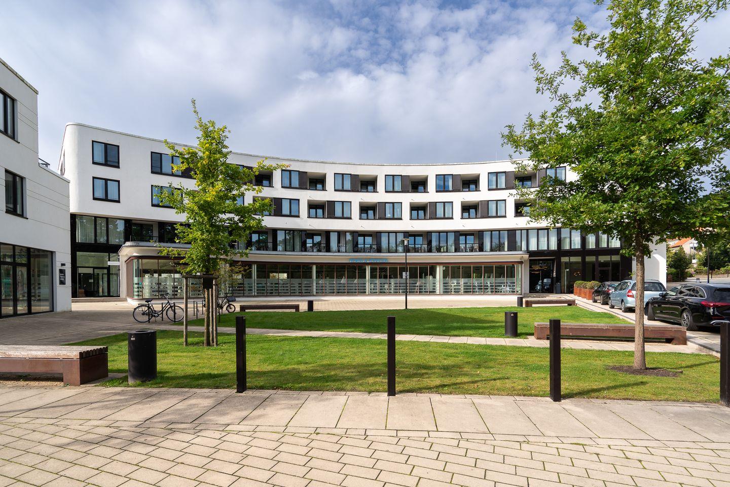 Zur Ausstattung der Ferienanlage gehören außerdem eine Rezeption mit Lobby und Kamin-Lounge, eine Tiefgarage mit inkludiertem Stellplatz (max. Höhe 2 m) sowie gemeinschaftlich nutzbare Waschräume auf jeder Etage. Zwei Aufzüge sorgen für barrierefreien Zugang zu allen Apartments. Fahrräder lassen sich sicher im abschließbaren Kellerraum unterbringen, und vor dem Haus steht eine öffentliche Ladestation für E-Autos zur Verfügung, die gegen Gebühr genutzt werden kann.