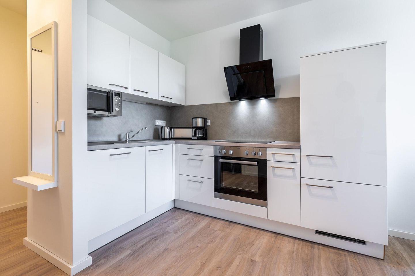 In der offenen Küche finden Sie alles, was Sie für die Zubereitung Ihrer Lieblingsgerichte benötigen: Geschirrspüler, Kühl- und Gefrierkombination, Glaskeramikkochfeld, Backofen, Mikrowelle, Kaffeemaschine, Wasserkocher, Toaster und sogar einen Eierkocher – ideal für Selbstversorger, die im Urlaub nicht auf Komfort verzichten möchten.