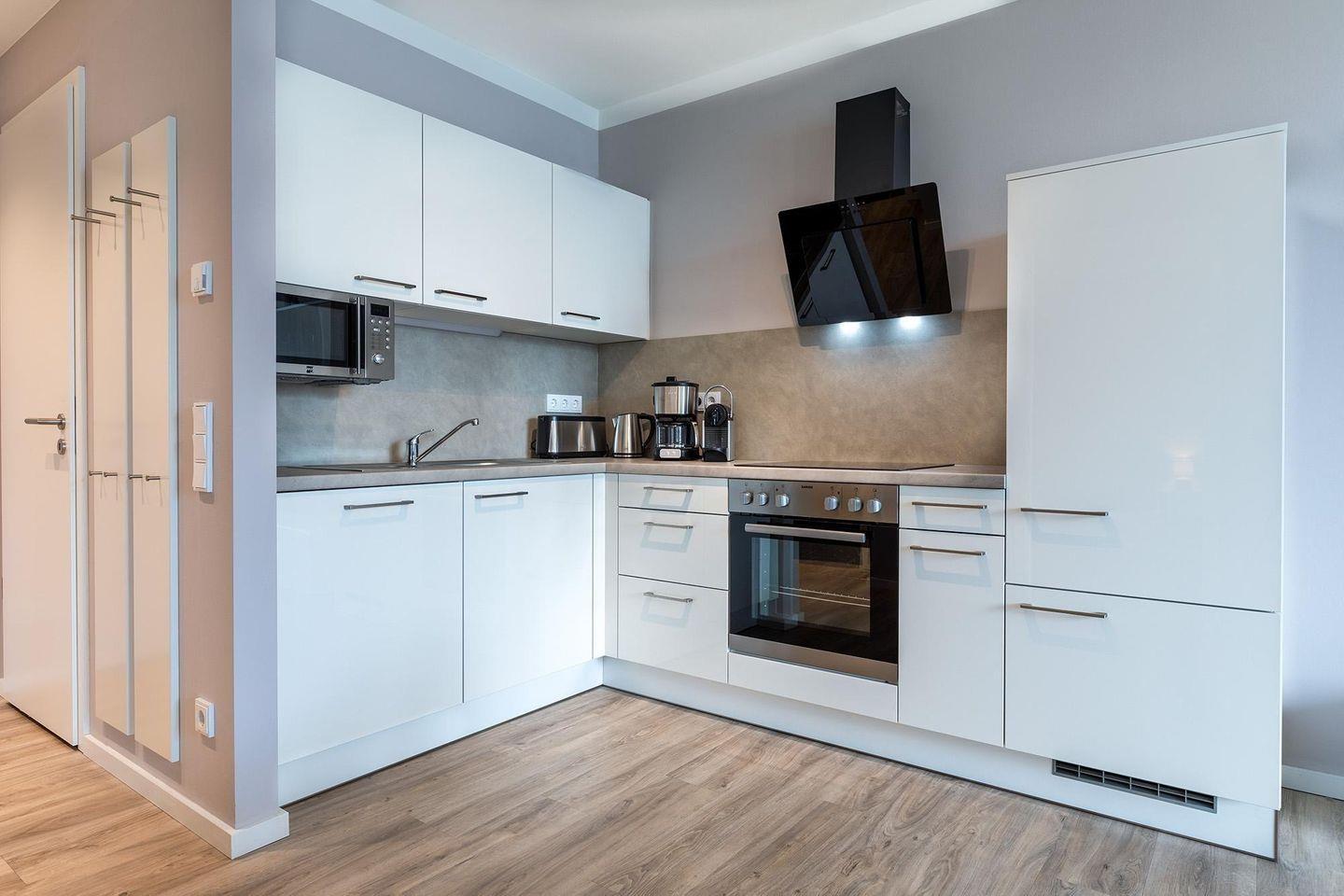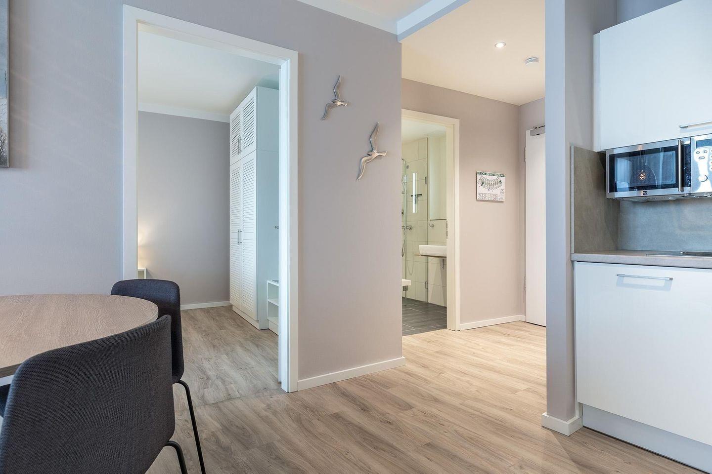Das helle, barrierefreundliche Apartment überzeugt mit einer durchdachten Ausstattung, angefangen bei der Fußbodenheizung über sonnenschutzverglaste, teilweise bodentiefe Fenster bis hin zum kostenfreien WLAN. Die offen gestaltete Küche ist vollständig ausgestattet mit Geschirrspüler, Kühl-Gefrierkombination, Espressomaschine, Kaffeemaschine, Wasserkocher, Toaster, Eierkocher, Stabmixer, Mikrowelle, Backofen und Glaskeramikkochfeld – ideal für alle, die auch im Urlaub gerne selbst kochen.