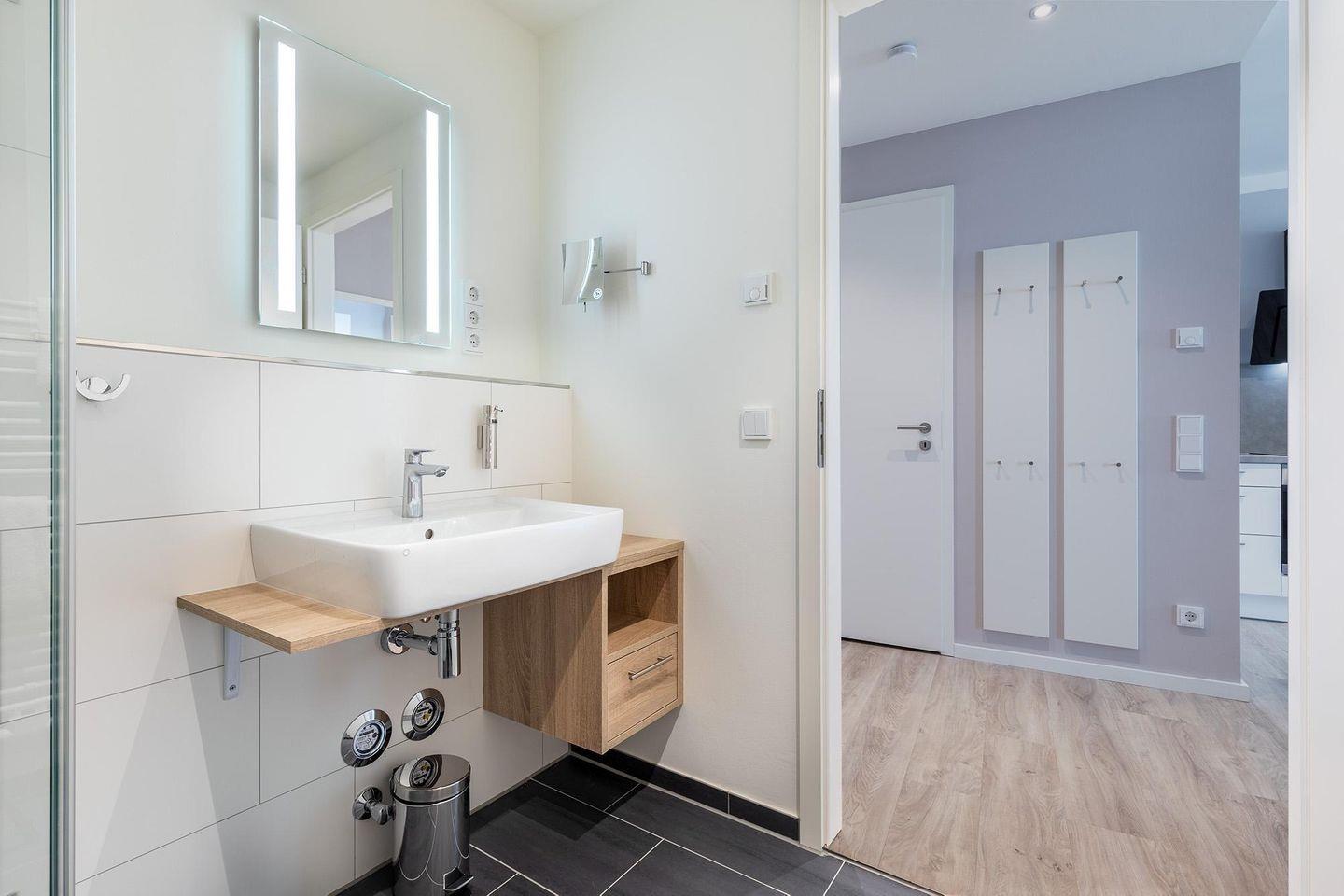Das stilvolle Badezimmer ist mit einer ebenerdigen Dusche und Haltegriffen,Duschhocker, WC, Waschtisch, Kosmetikspiegel, Föhn, Handtuchheizkörper und ebenfalls mit Fußbodenheizung ausgestattet – hier starten Sie entspannt in den Tag.