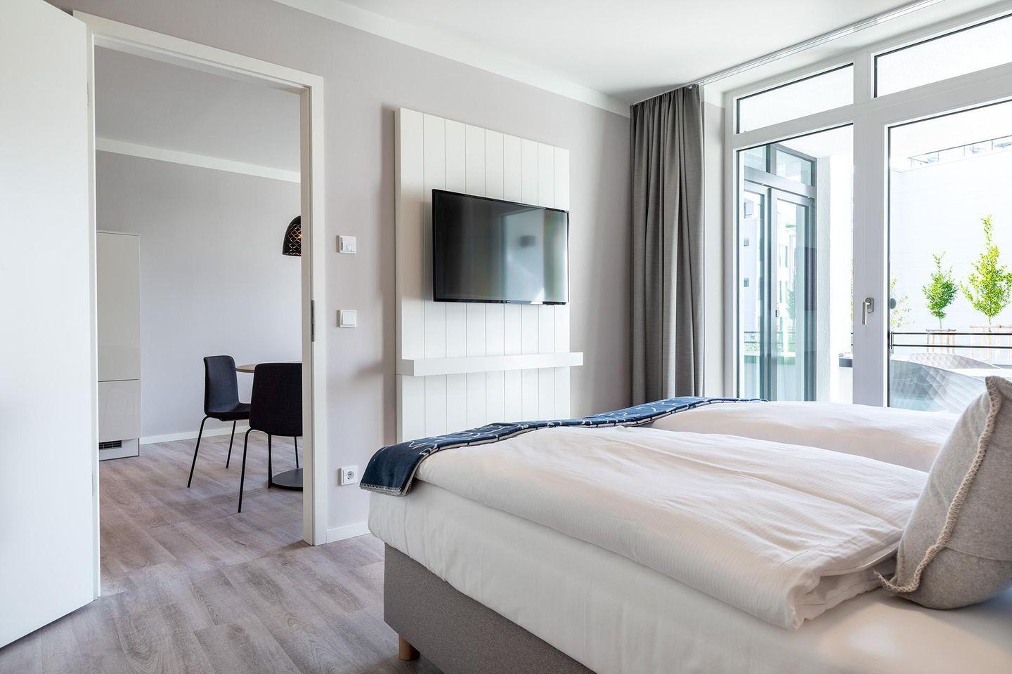 Das Apartment verfügt über ein komfortables Schlafzimmer mit Boxspringbett und SMART-TV sowie einen Wohnbereich mit Doppelschlafcouch, Essbereich, offen gestalteter Küche und 43-Zoll-TV. Fußbodenheizung, sonnenschutzverglaste Fenster und WLAN sorgen für modernen Komfort. Das stilvolle Badezimmer ist mit ebenerdiger Dusche, Föhn und Handtuchheizkörper ausgestattet.
