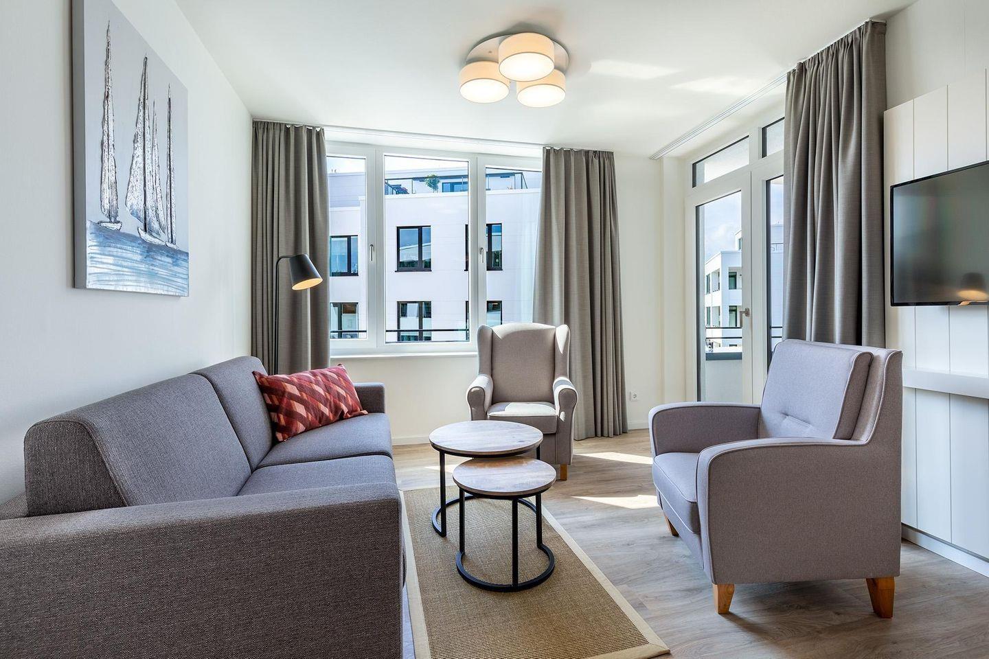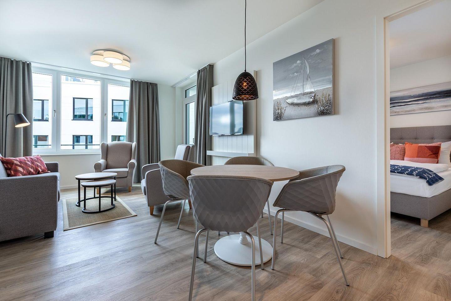 Im Inneren erwartet Sie ein helles, modern eingerichtetes Nichtraucher-Apartment, das mit durchdachtem Komfort punktet: Fußbodenheizung, bodentiefe, sonnenschutzverglaste Fenster und kostenfreies WLAN sorgen für ein angenehmes Wohngefühl zu jeder Jahreszeit.