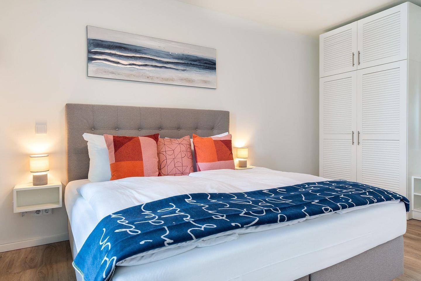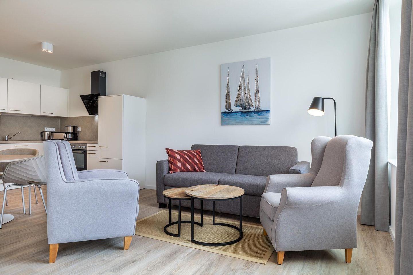 Das Apartment bietet auf 48 m² einen modernen Wohnkomfort mit offenem Wohnbereich, Schlafzimmer und überdachtem Balkon. Sie genießen Zugang zu Sauna und Dampfbad, WLAN, einer voll ausgestatteten Küche sowie einem Privatparkplatz. In unmittelbarer Nähe finden Sie Sandstrand, Einkaufsmöglichkeiten und Restaurants.