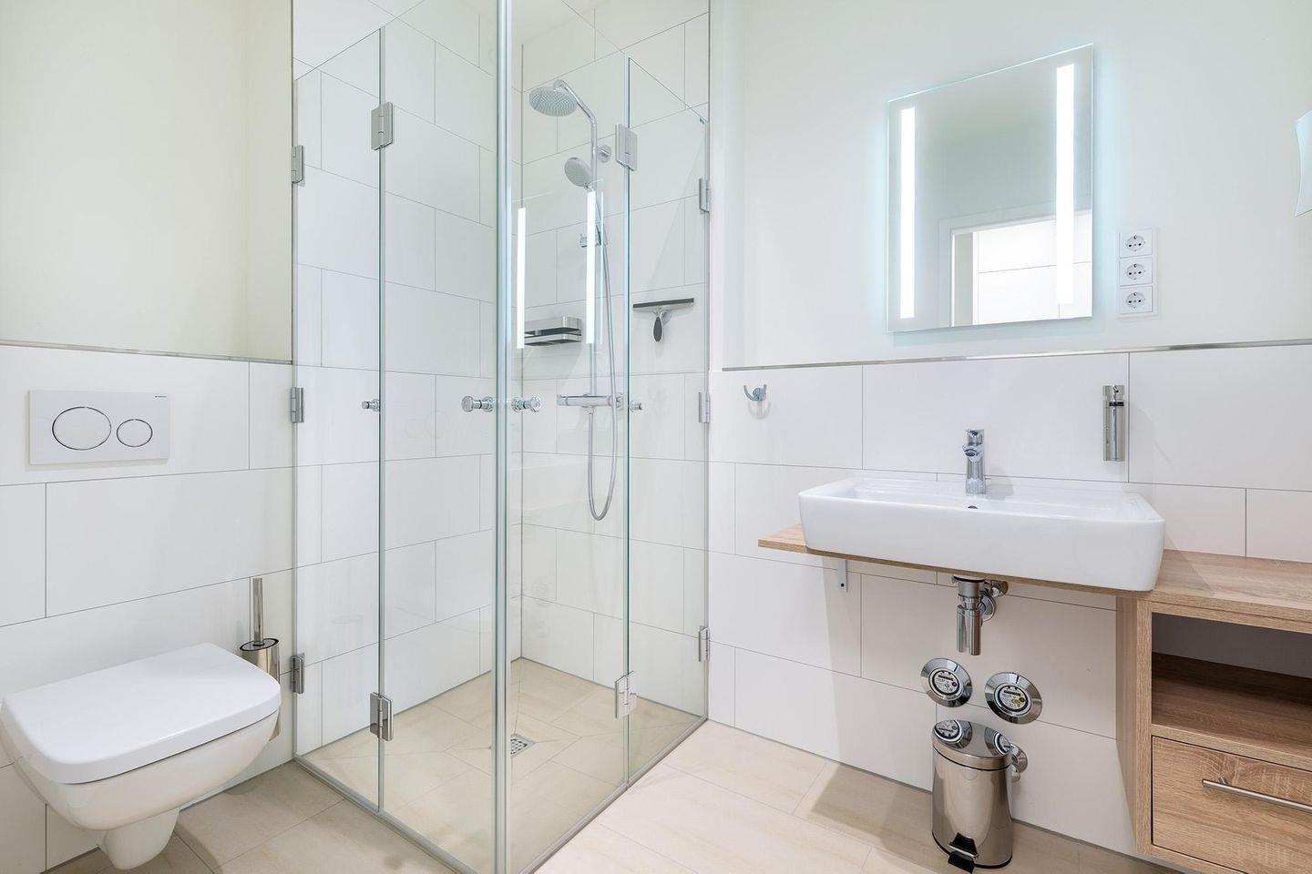 Das moderne Badezimmer ist stilvoll gestaltet und überzeugt mit einer ebenerdigen Regendusche, WC, Waschtisch mit Föhn und Kosmetikspiegel, Handtuchheizkörper sowie ebenfalls mit Fußbodenheizung – hier starten Sie entspannt in den Tag oder lassen ihn ganz in Ruhe ausklingen. Hunde sind ebenfalls willkommen.