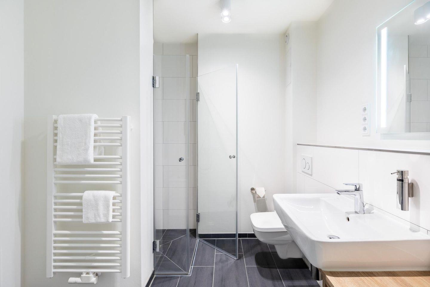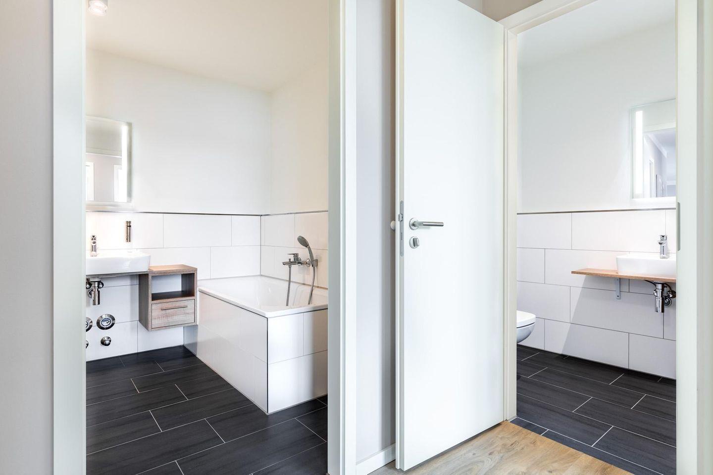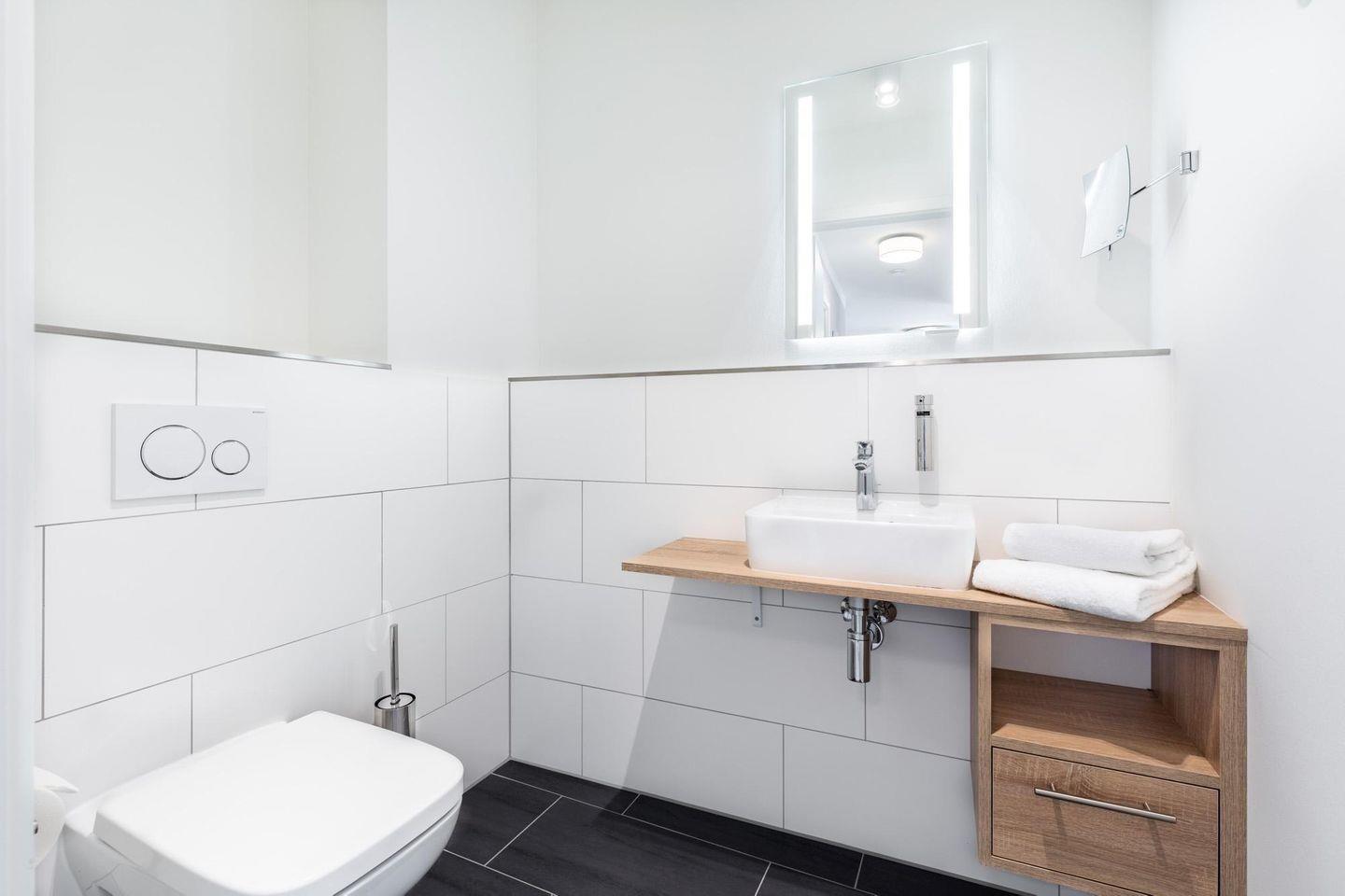 Das Badezimmer ist mit einer bodengleichen Dusche, Badewanne, WC, Waschbecken, Kosmetikspiegel und Haartrockner modern ausgestattet und sorgt für einen komfortablen Start in den Tag. Zusätzlich steht ein Gäste-WC zur Verfügung.