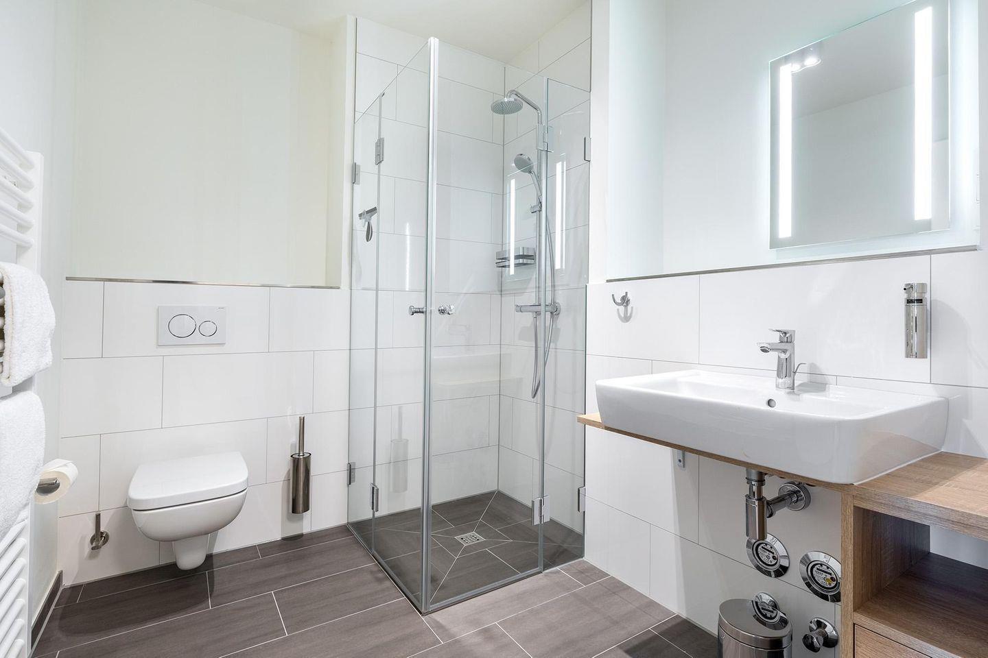 Das Badezimmer überzeugt mit bodengleicher Dusche und weiteren modernen Details. Die Fußbodenheizung sorgt für wohlige Wärme zu jeder Jahreszeit.