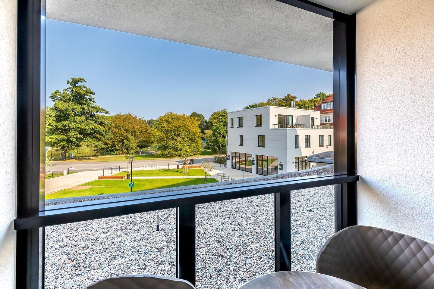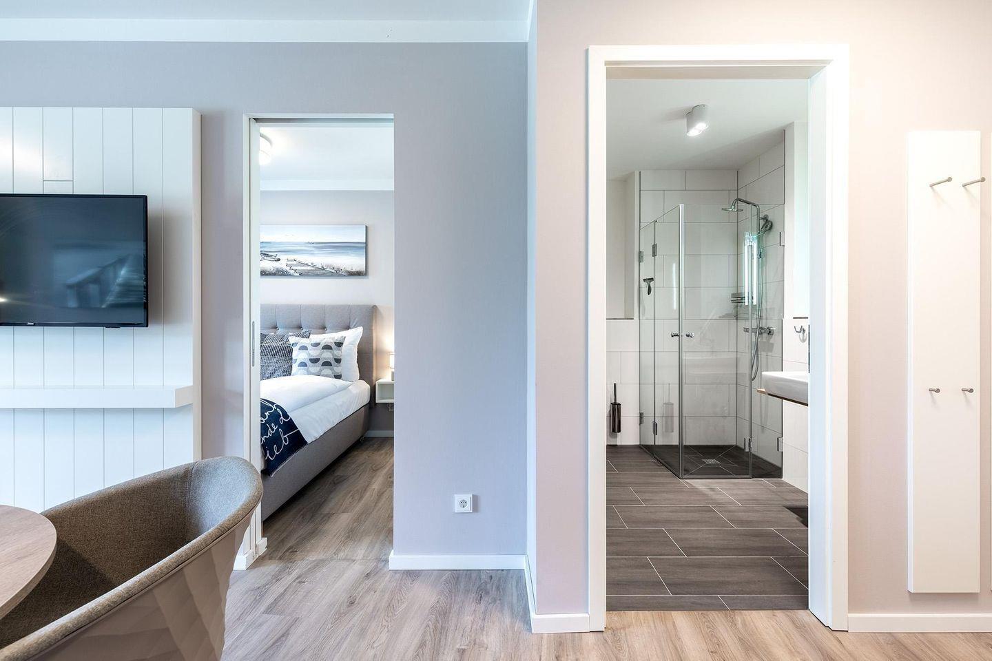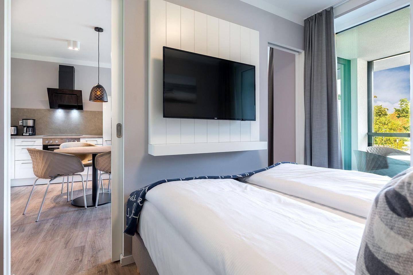Modernes Ostsee-Apartment mit Wellnessoase, Balkon und Gartenblick in Travemünde.